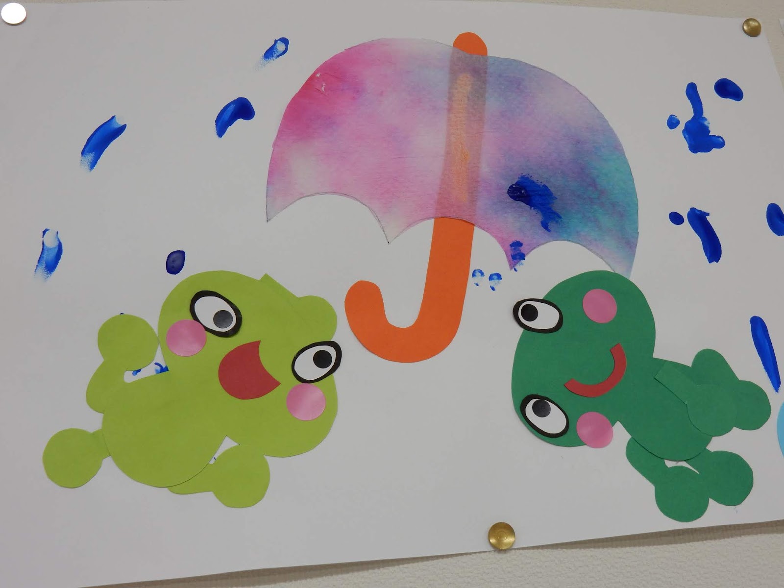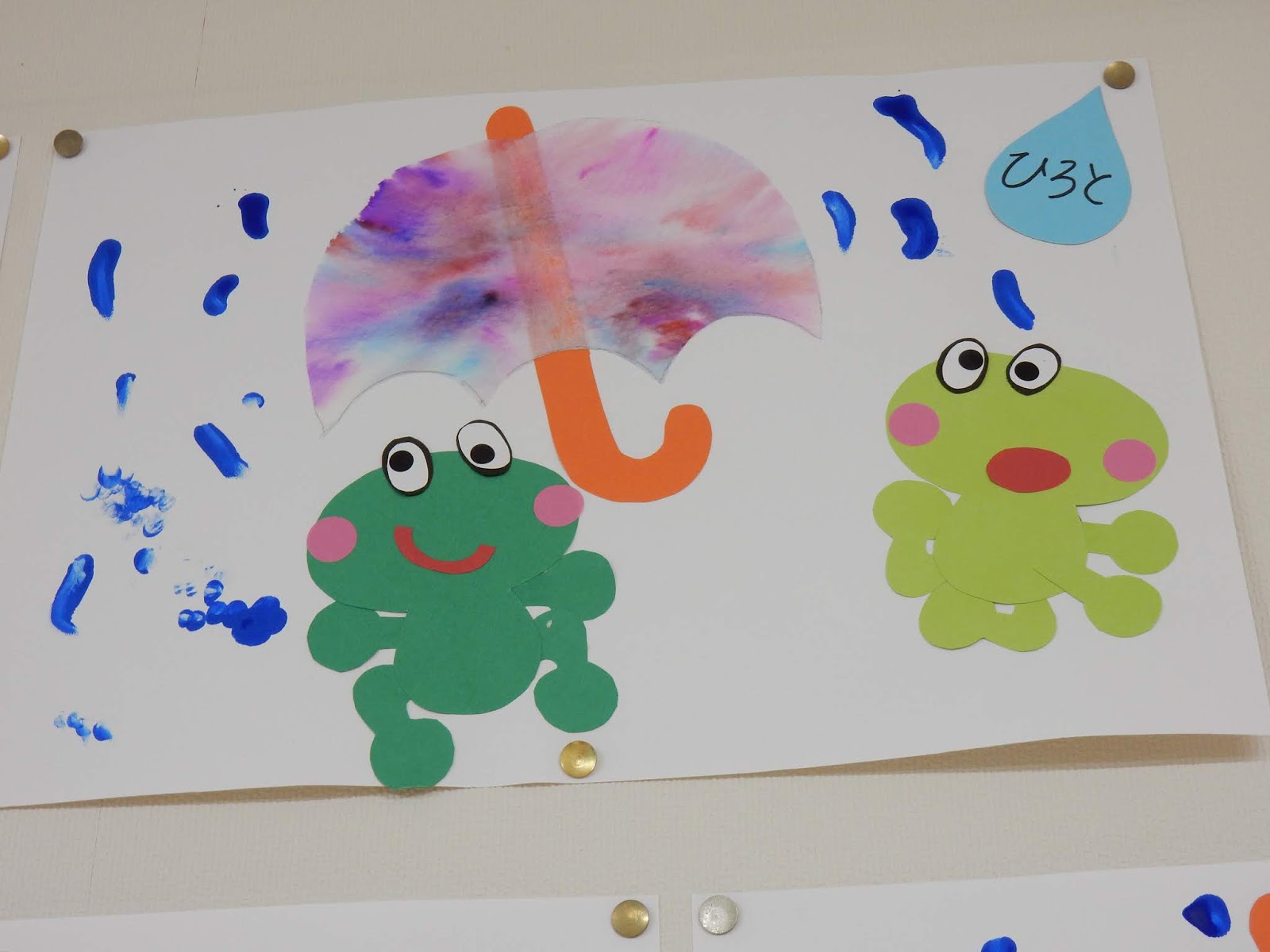 こちらはすみれさんの壁面です。可愛いカエルさんが、とってもカラフルな傘をさして、雨の中をダンスしているようです。指で描いた雨も、いい感じです!