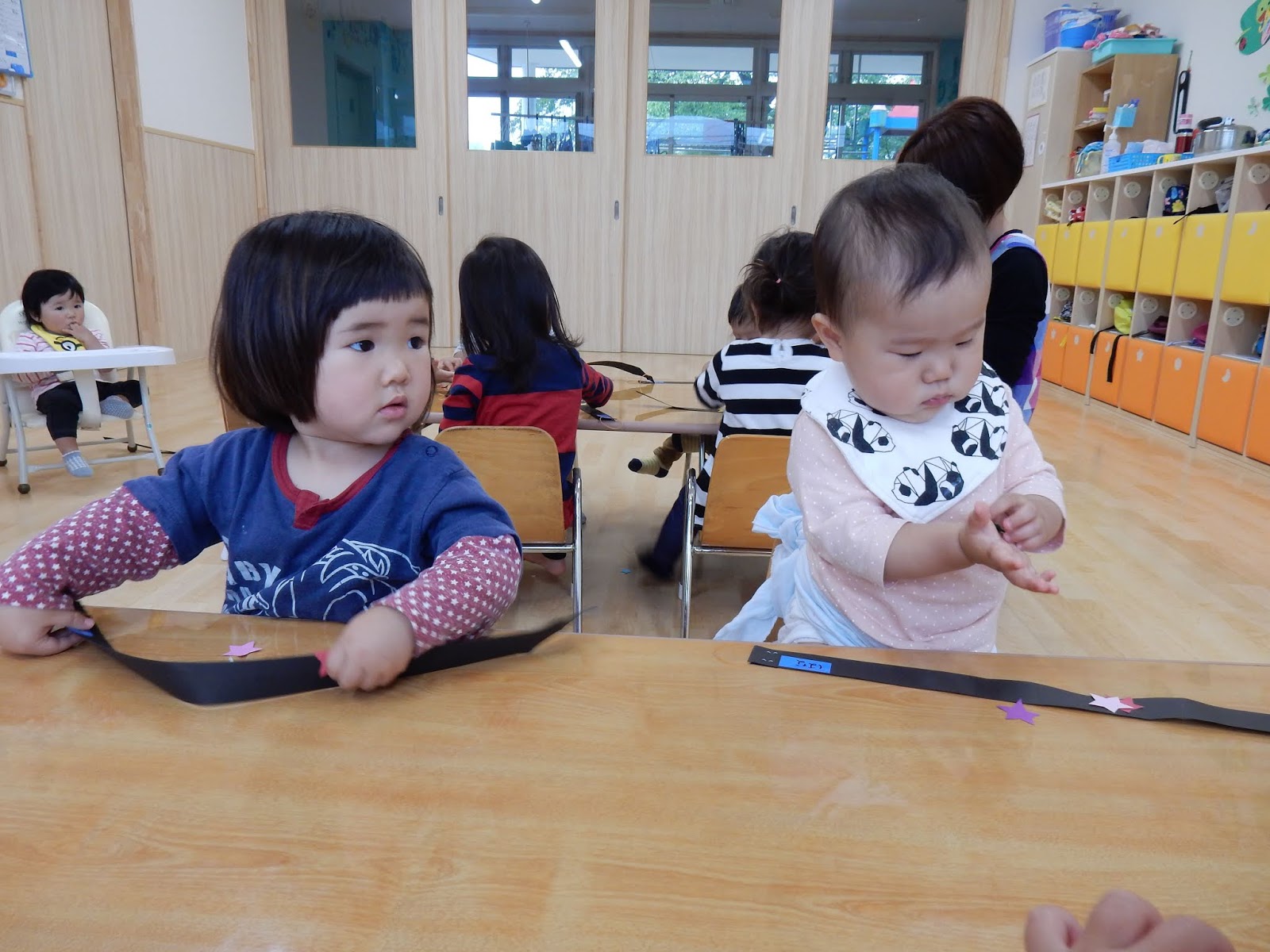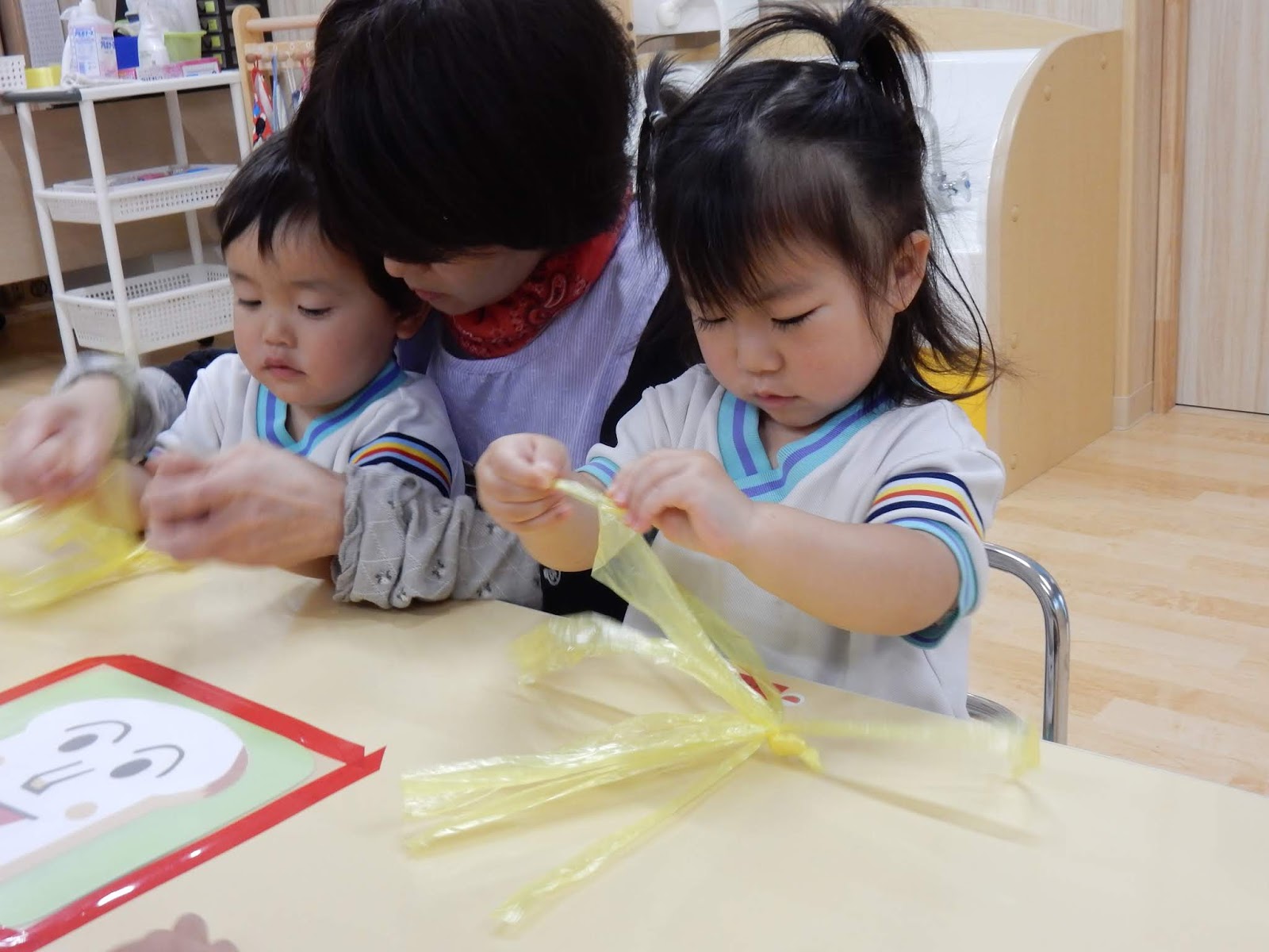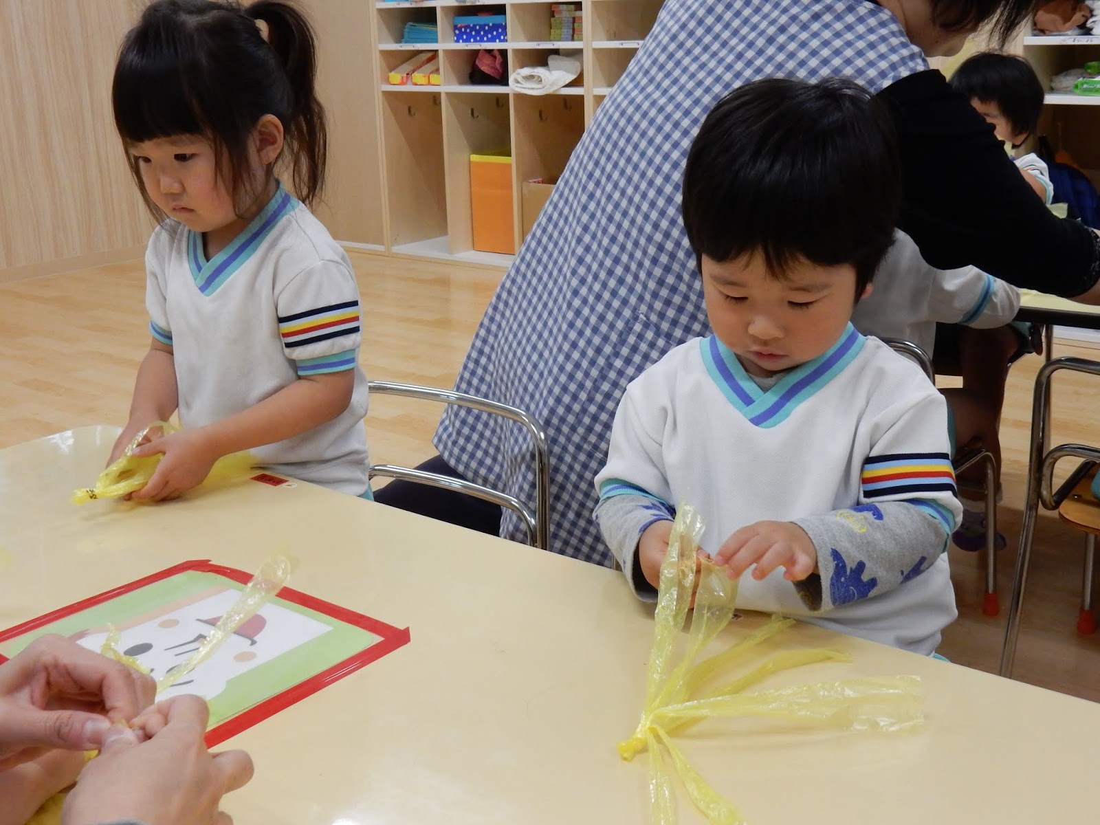 ひよこさんは、雨のため、いつも以上に!?のんびりゆったり過ごしていました。朝のおやつを食べて、お帳面にシールを貼ったら、今日は忍者変身グッズを作りましたよ!黒いバンドをもらうと、先生のお話を聞いて理解できた子は、頭にクルリと巻こうとしていました!