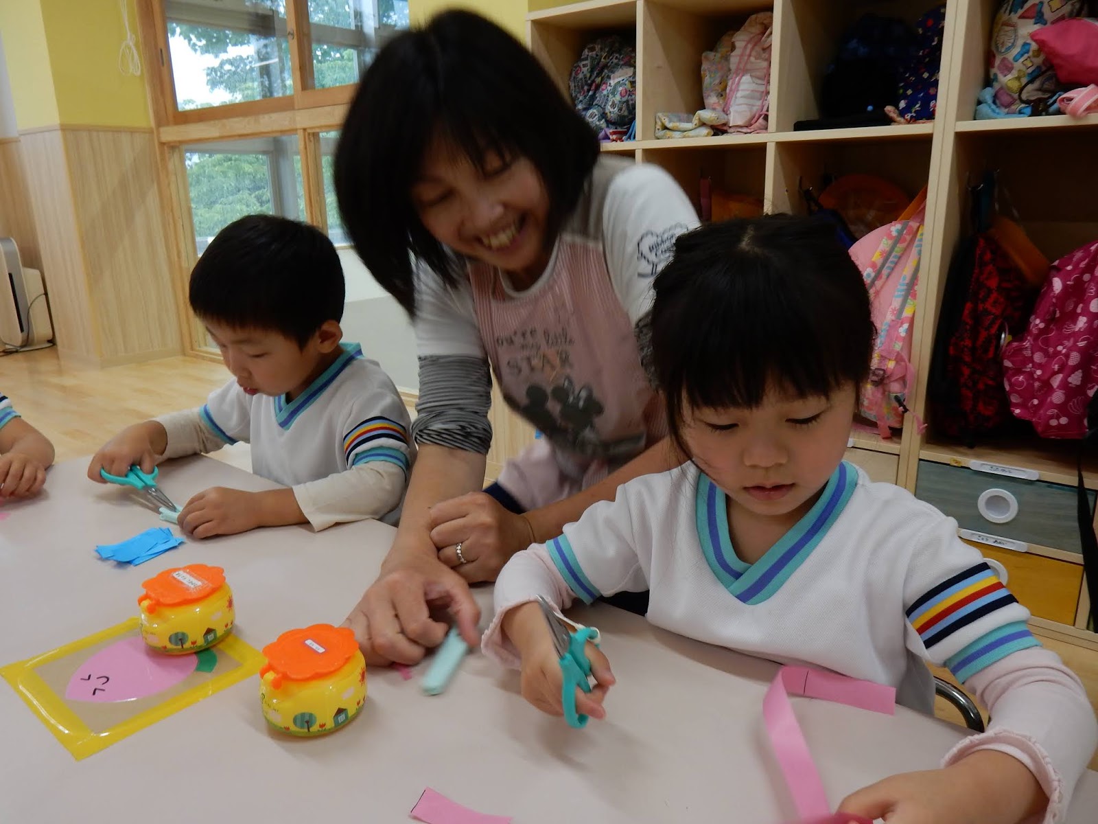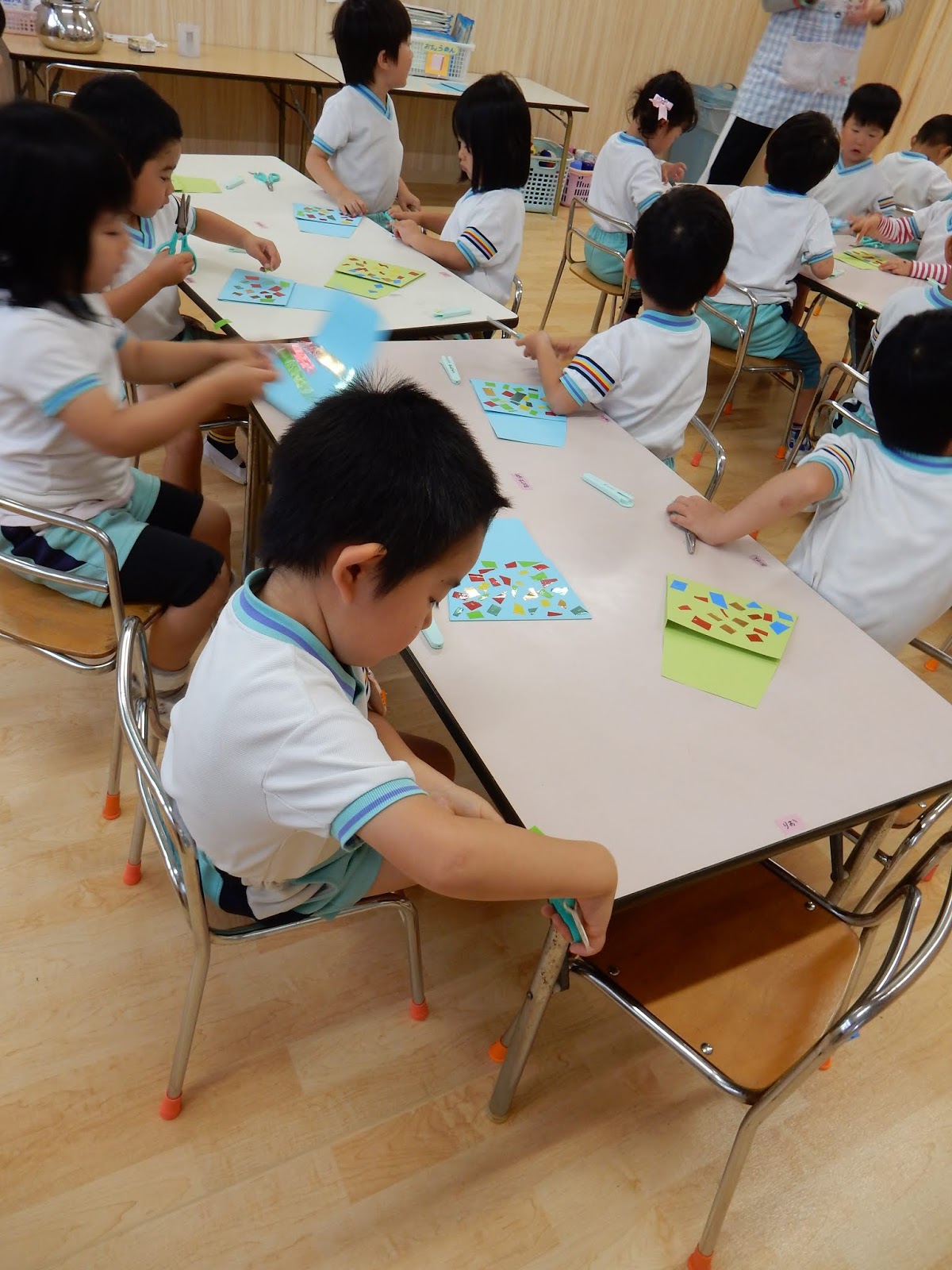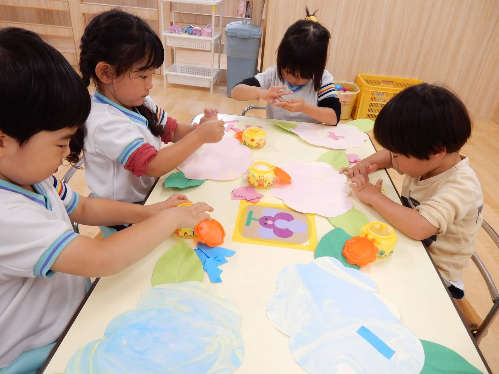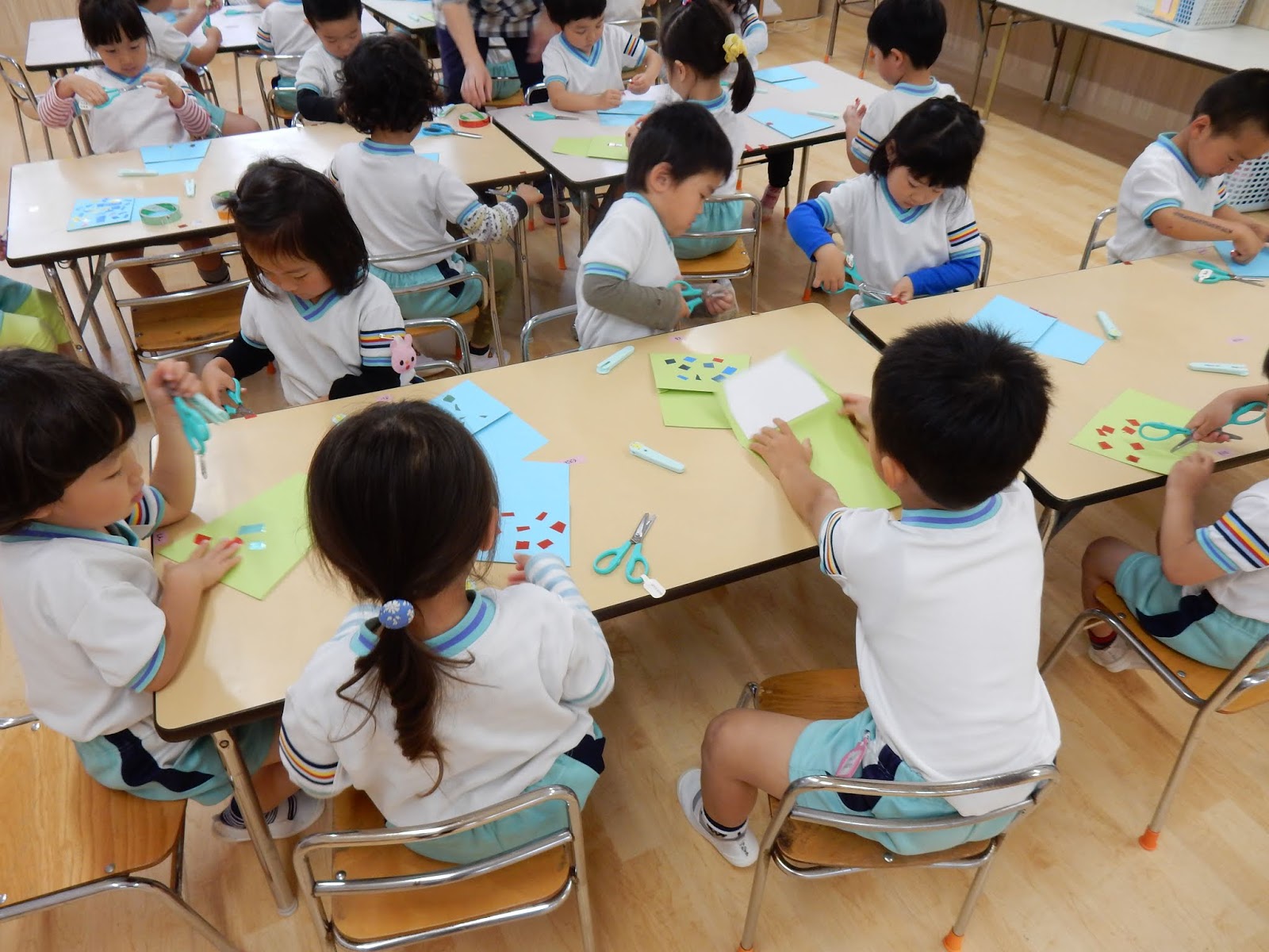 たんぽぽさんは、あじさいの花を作りました。はさみで紙テープを切って、ノリで貼り合わせていきます。線にそってはさみを動かして…直線を切るのも、慎重に、慎重に!そして、のりは“1の指”で塗るお約束。人差し指でノリをすくって伸ばして貼りました。みんなのアジサイが並ぶと、きれいなんだろうなぁ!