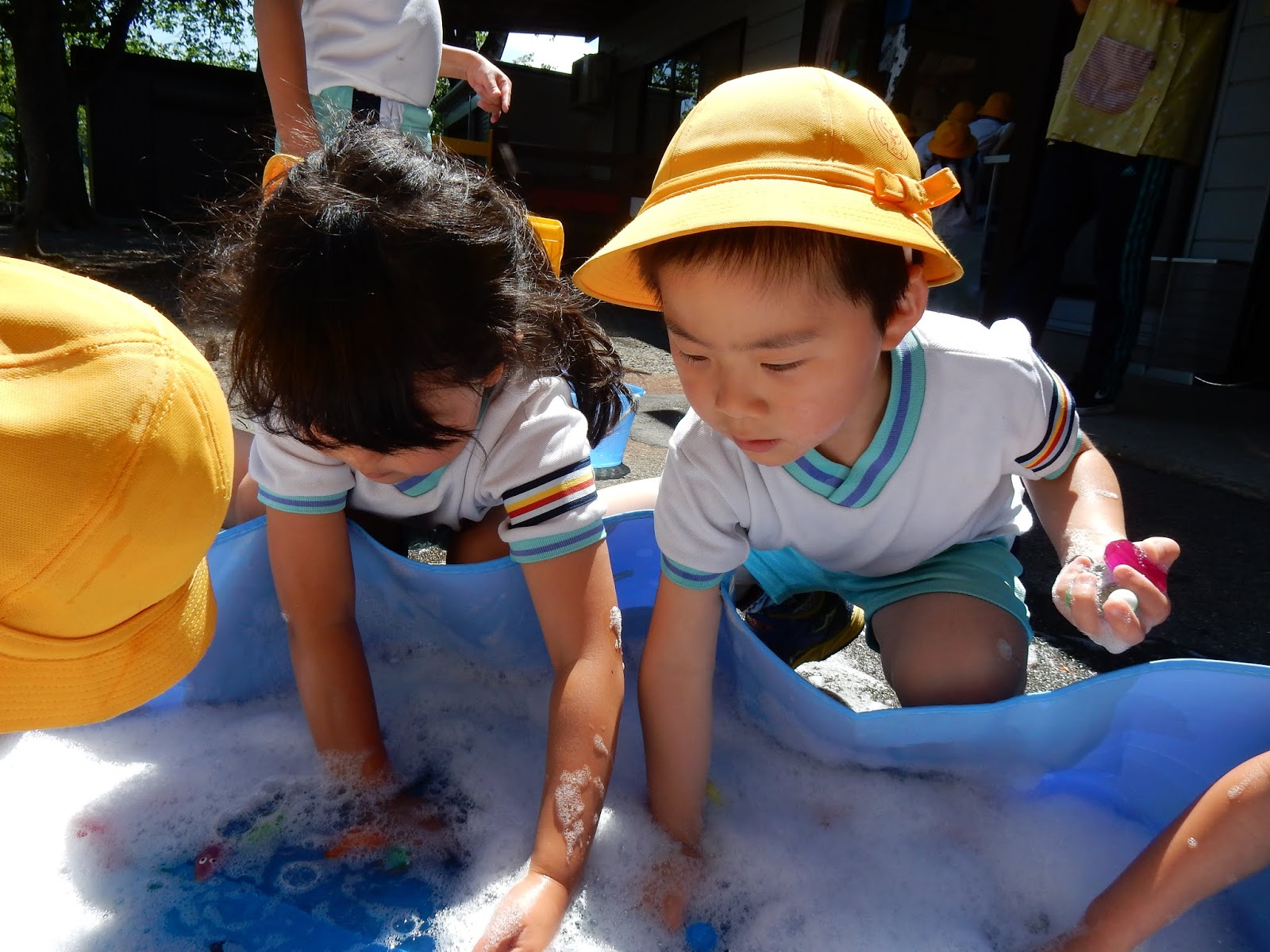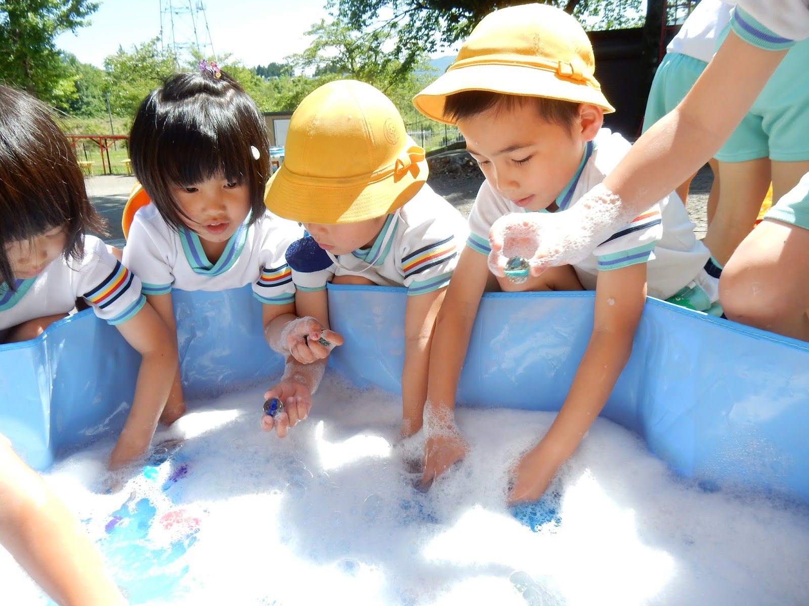 『なにしてるの~!?』と早速興味を持ってくれて、その後はもう夢中で泡の中からビー玉を探したり、泡をすくったり。一足早い水遊びを楽しみました!
