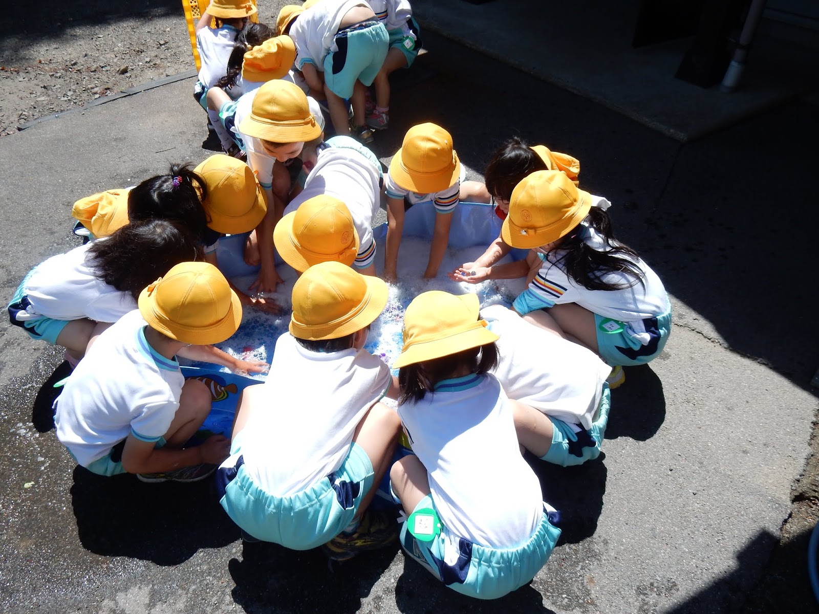 『ぬれる~!!』と言いながらも体はどんどんプールの内側へ…(笑)こんなにいい天気だと、プールが本当に待ち遠しいですね!