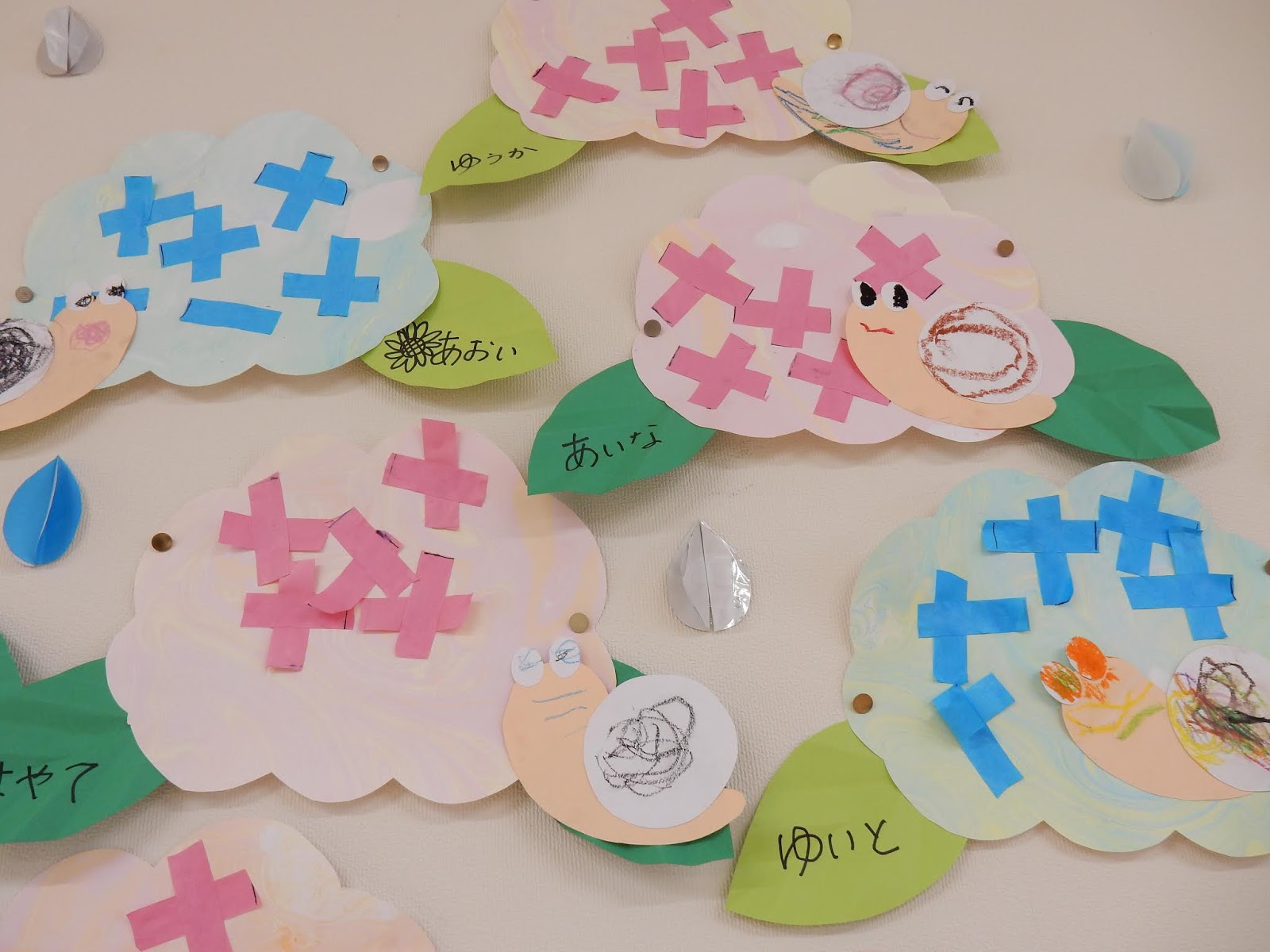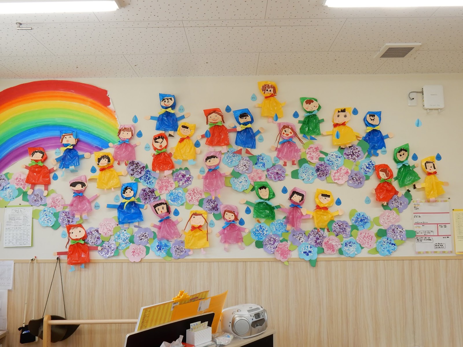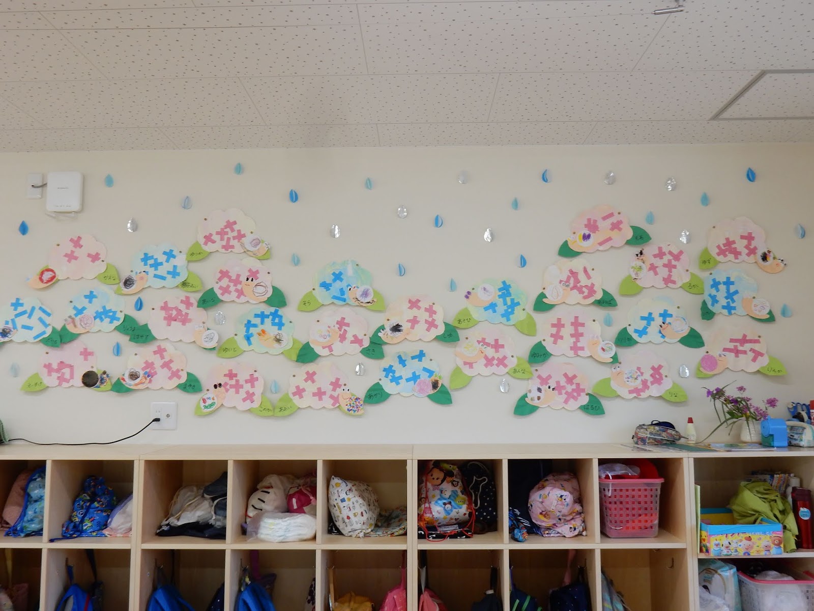 たんぽぽさんとひまわりさんの壁面を紹介します。どちらも雨の季節にぴったり!あじさいをどちらのクラスも取り上げていますが、作り方が違うとまた雰囲気も全然違いますね!