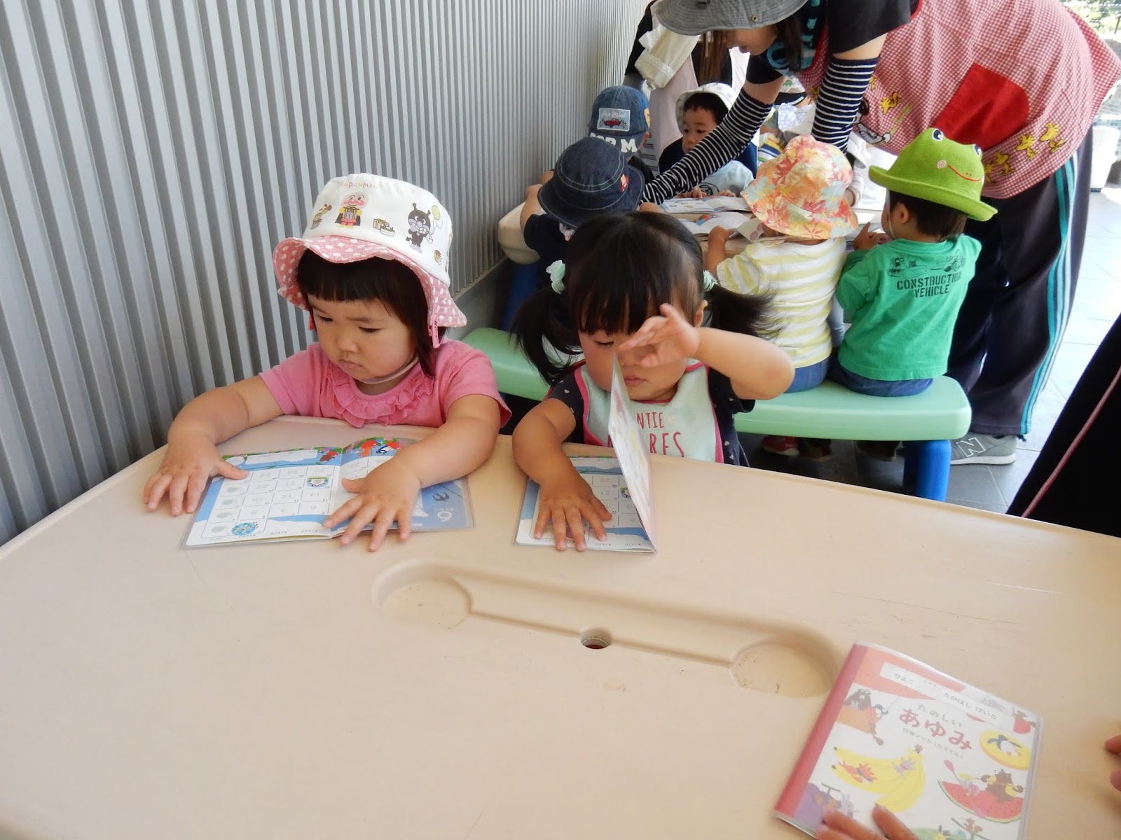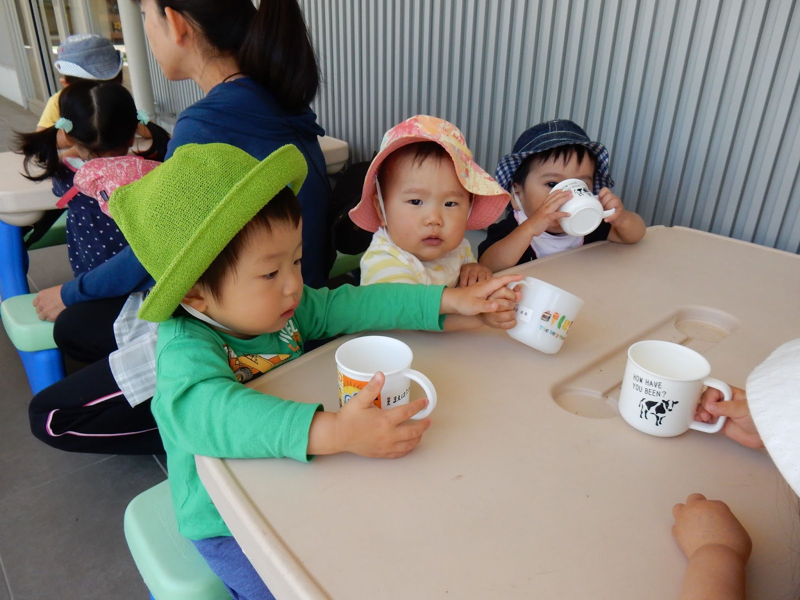 体操マラソンのあと、ひよこさんはお外でシールを貼って、お茶のみ休憩。そのあとお散歩に出掛けました。いつもやっていることですが、お部屋の中か、お外かで雰囲気が全然とがいますね!風が心地よく感じました!