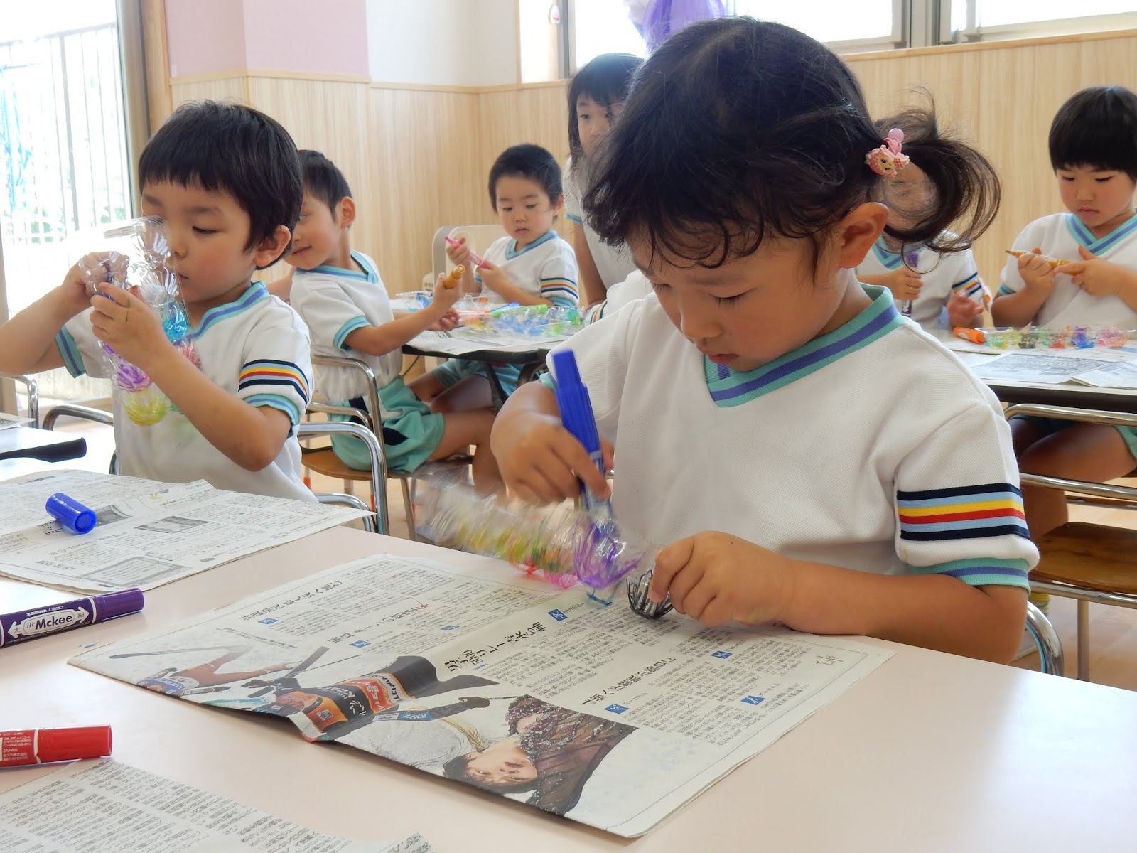 ゆりさんの製作は、卵のパックを使っていました。透明なパックにマジックで色をつけます。形が面白いし、きれいに色がつくのでみんなとても真剣に、隅まで塗っていました。