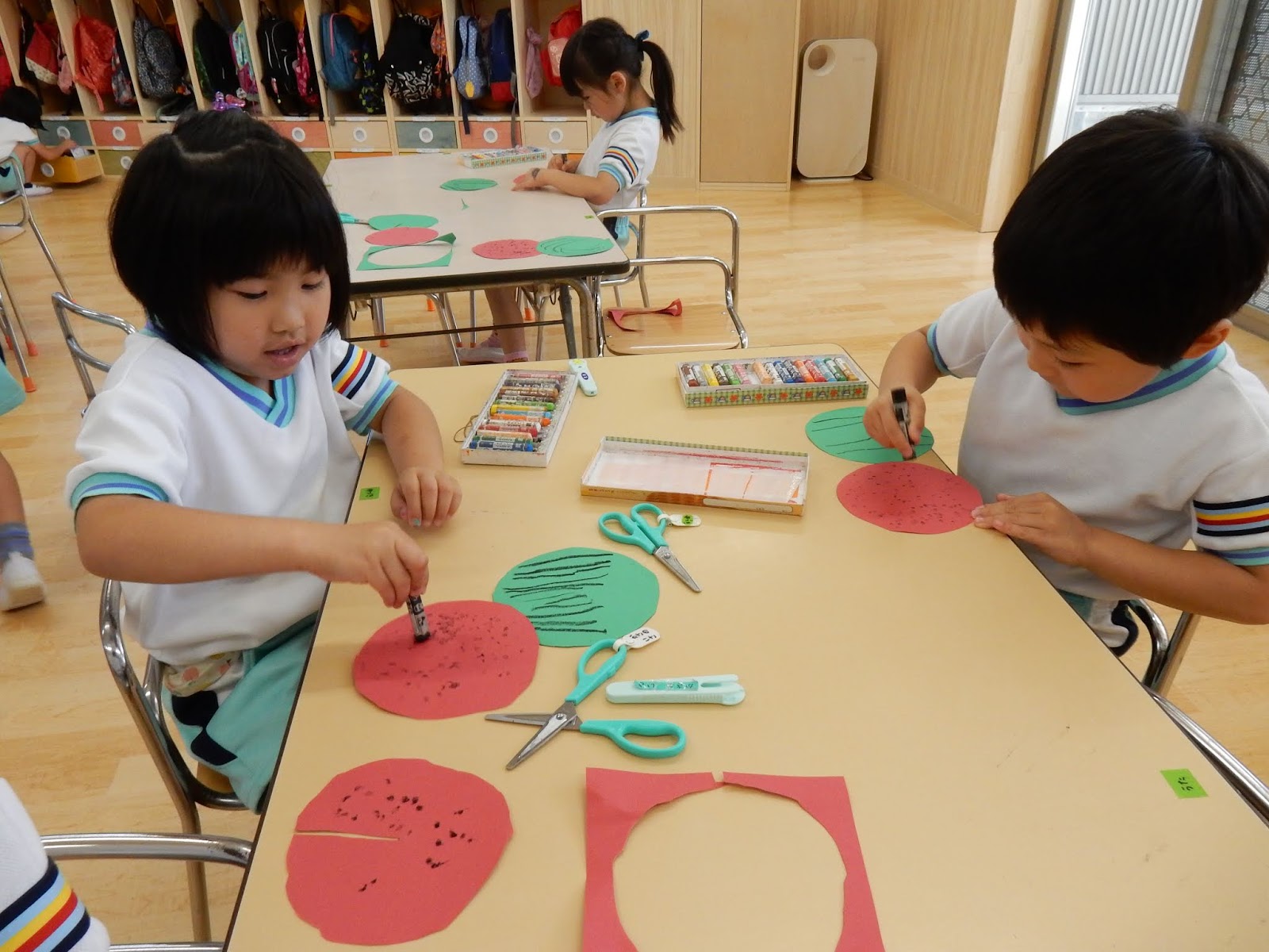 ひまわりさんはスイカを作りました。丸く切った画用紙に切り込みを入れて組み合わせると、立体的になります。縞模様と、タネを書いたらスイカの完成!ひまわりさん、張り切ってコンコン!と音が響く感じで種を書いてくれました…食べるのが大変そうなスイカ(笑)