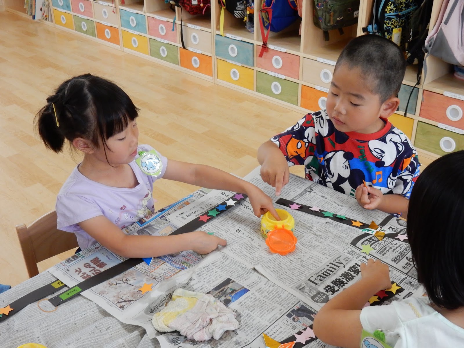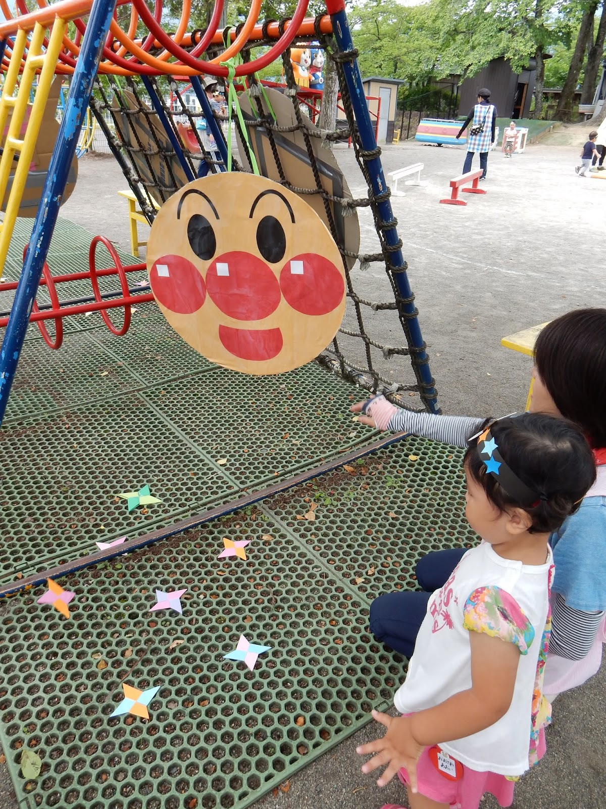 ひまわりさん、ゆりさん、たんぽぽさんは、3クラスがシャッフル!きりんグループ、うさぎグループ、ぞうグループに別れて、まずはお部屋で忍者変身グッズを作りました。手裏剣に色をぬったり、星をたくさん貼ったりして、頭にかぶる冠を作りました。大きい子が小さい子に教えてあげたり、小さい子が大きい子が作る物をじーっと見つめたり。普段はあまりこういった関わりがない分、お互いに刺激を受けているようでした。