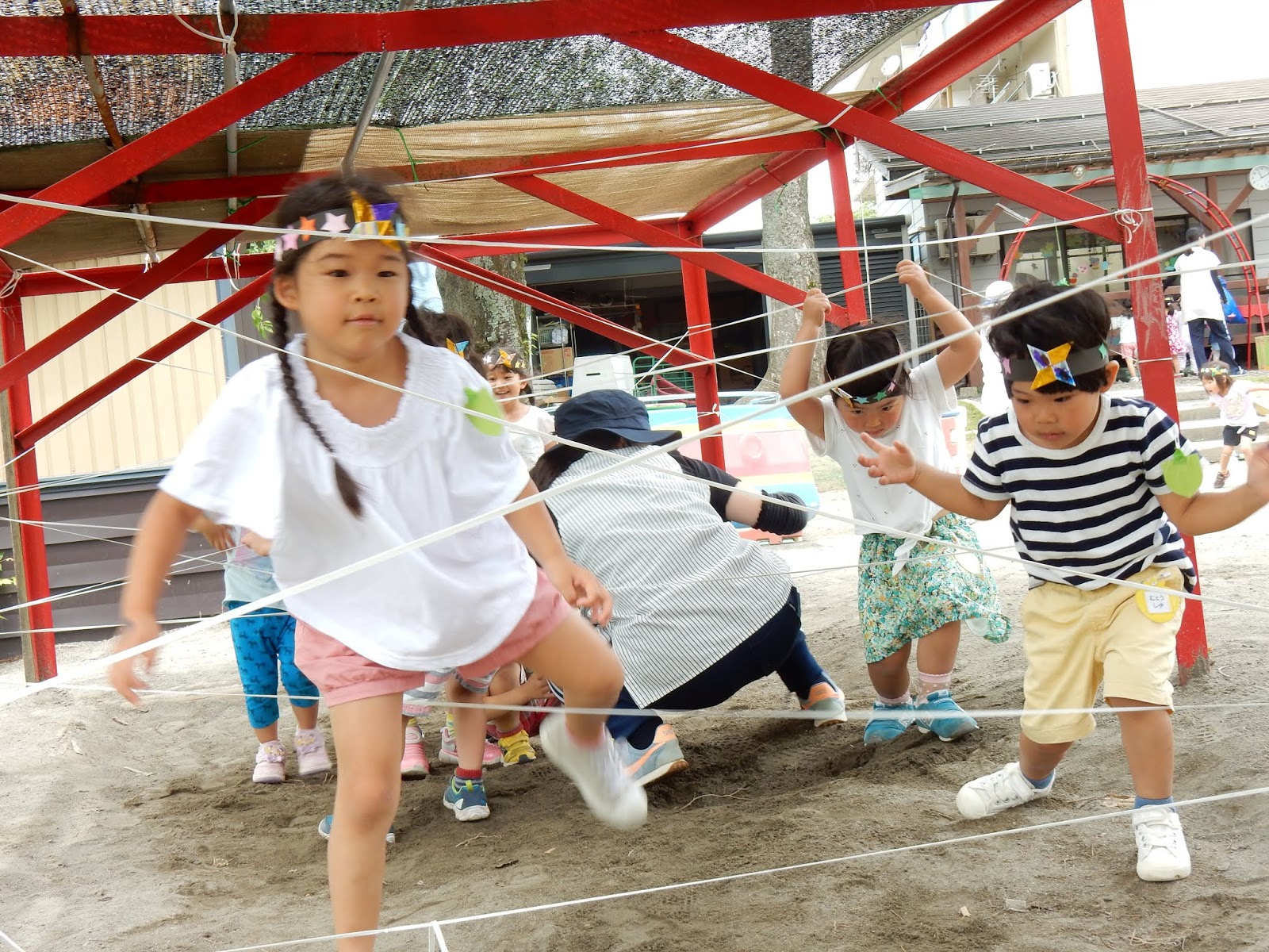 一度捕まってしまうと、からんでなかなか抜け出す事が出来ない、まさにクモの巣!しゃがんでみたり、かき分けたり、みんな頭を使って、全身を使って挑戦しました!
