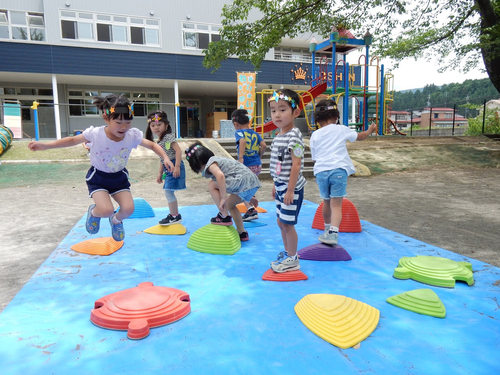 冠でパワー全開!園庭にたくさん用意された修業に早速挑戦!いつも、体操教室で使っている運動器具も、“忍者の修業”と言われると、なんだかやる気もアップ!ジャンプするときには、格好よく『とぉっ!!』と言ってみたり、大きい子の姿を見て挑戦してみたり。