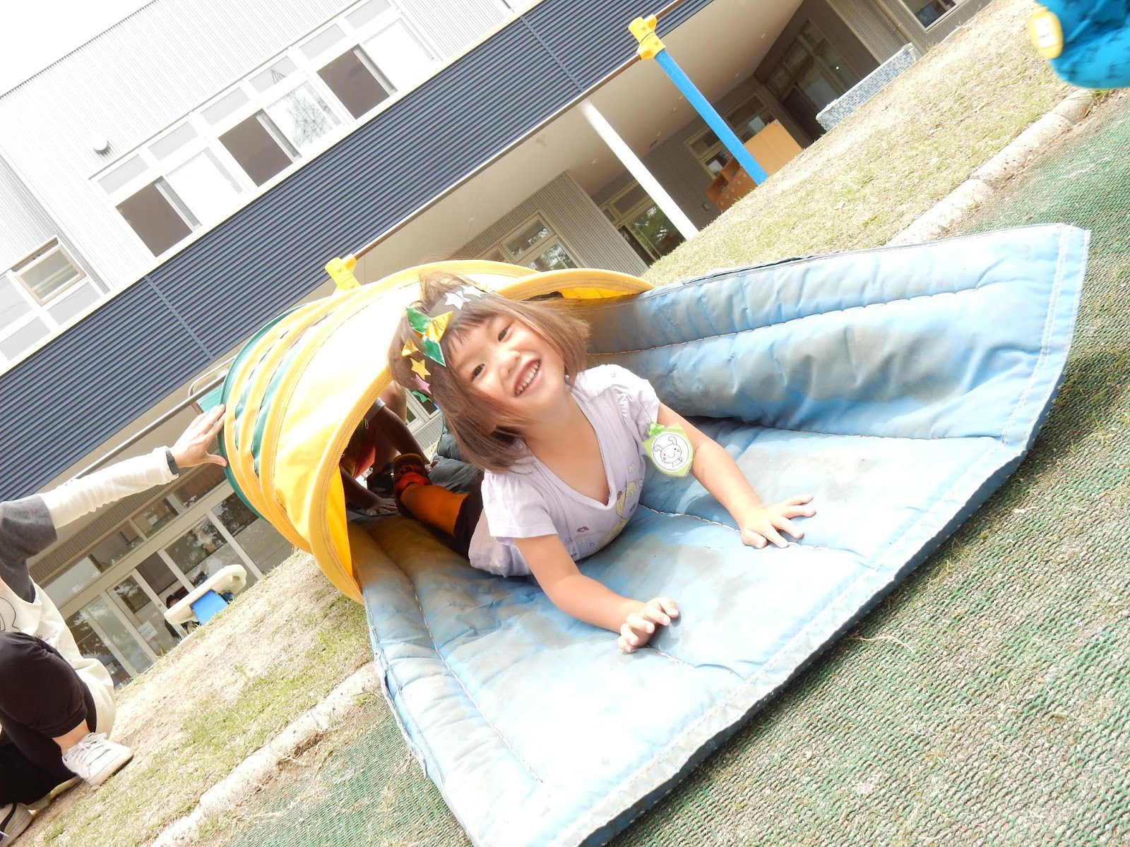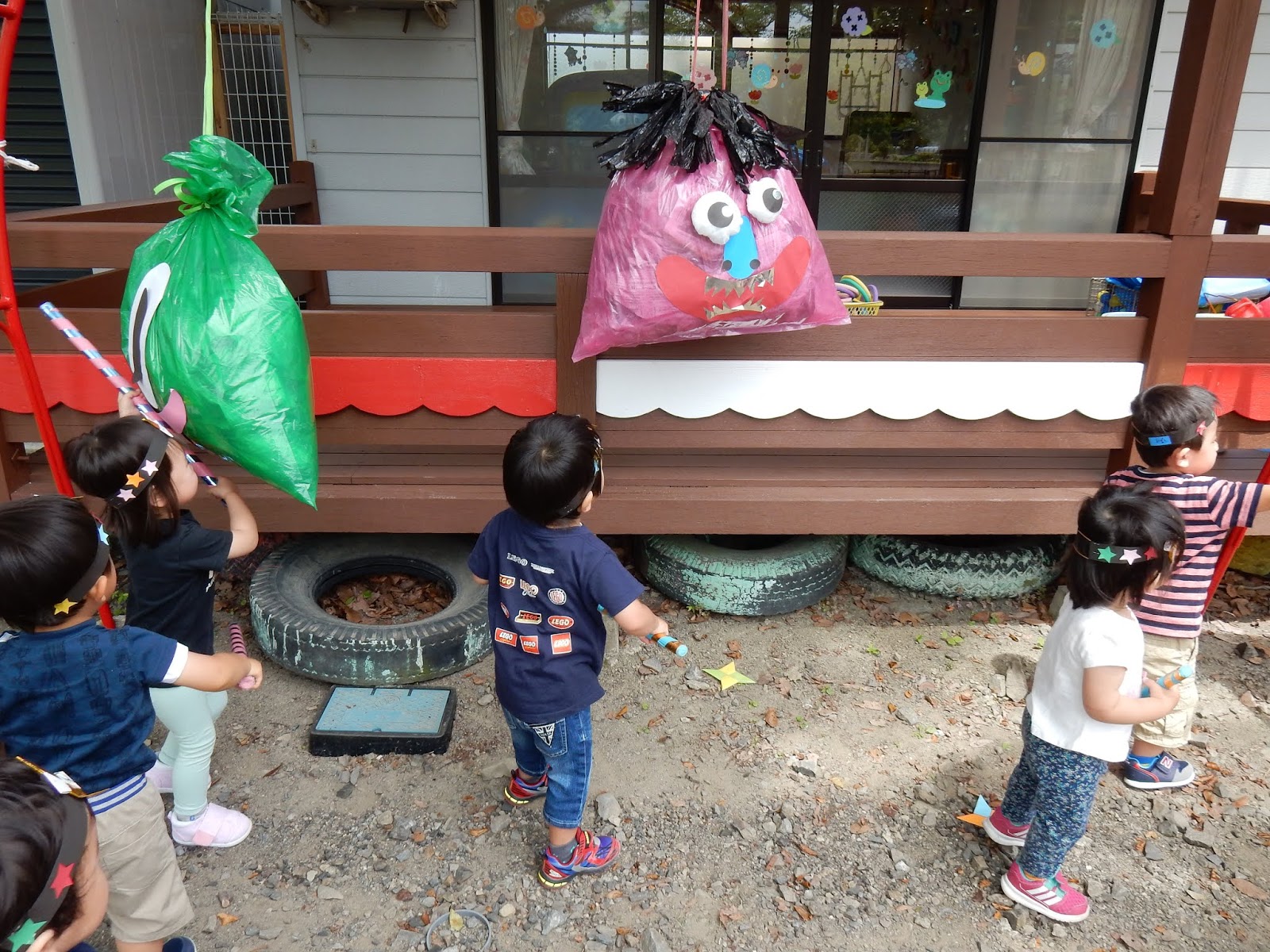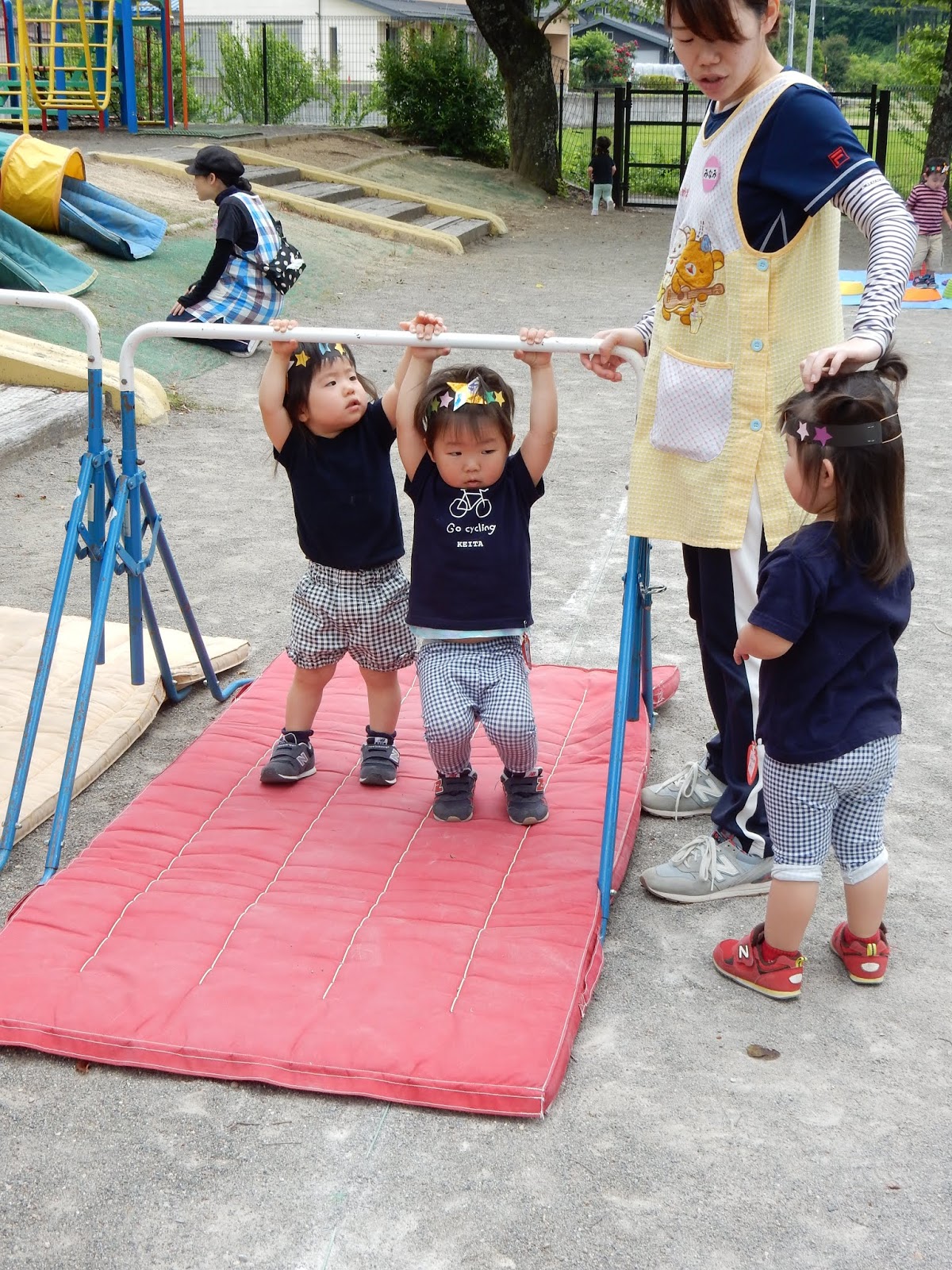 もちろん、すみれさんや、ひよこさんも楽しみましたよ!事前に作っていた冠を頭に着けたら、大きい子が製作をしている間に園庭を広々使って、大きい子と同じ修業に挑戦!のぼったり、とんだり、先生と一緒なら、安全に楽しむことができました!