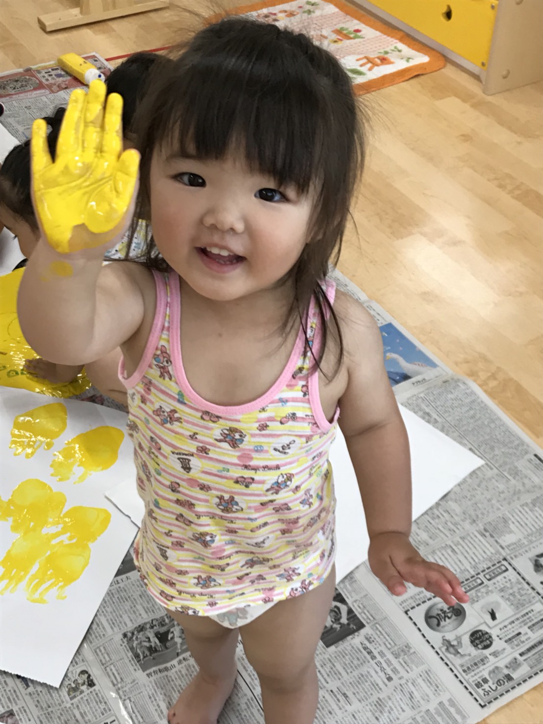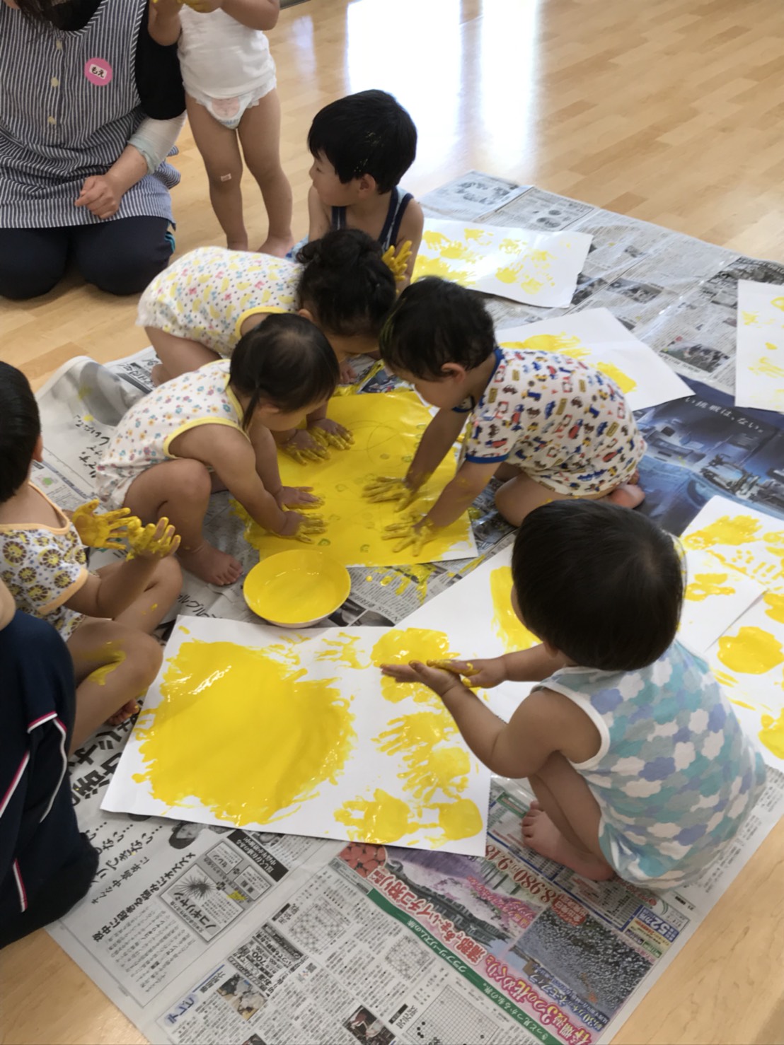 すみれさんは、絵の具を使って製作をした後に、そのまま全身お絵描き!うわ~!!!楽しそう!!絵の具の感触も、紙がどんどん黄色くなっていくのも、楽しいね!