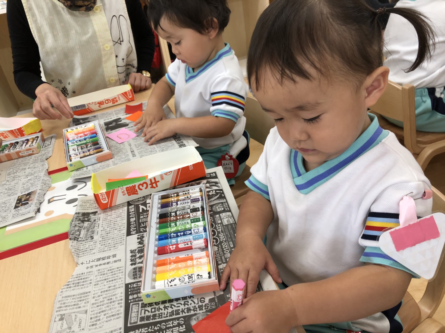 たんぽぽさんは、はさみでカラフルな折り紙を切って、おりひめ、ひこぼしの服を作ります。真剣な表情で切って、のりでたくさん貼りました。今度、お顔を描くそうです。どんな2人が完成するのか、楽しみですね♪