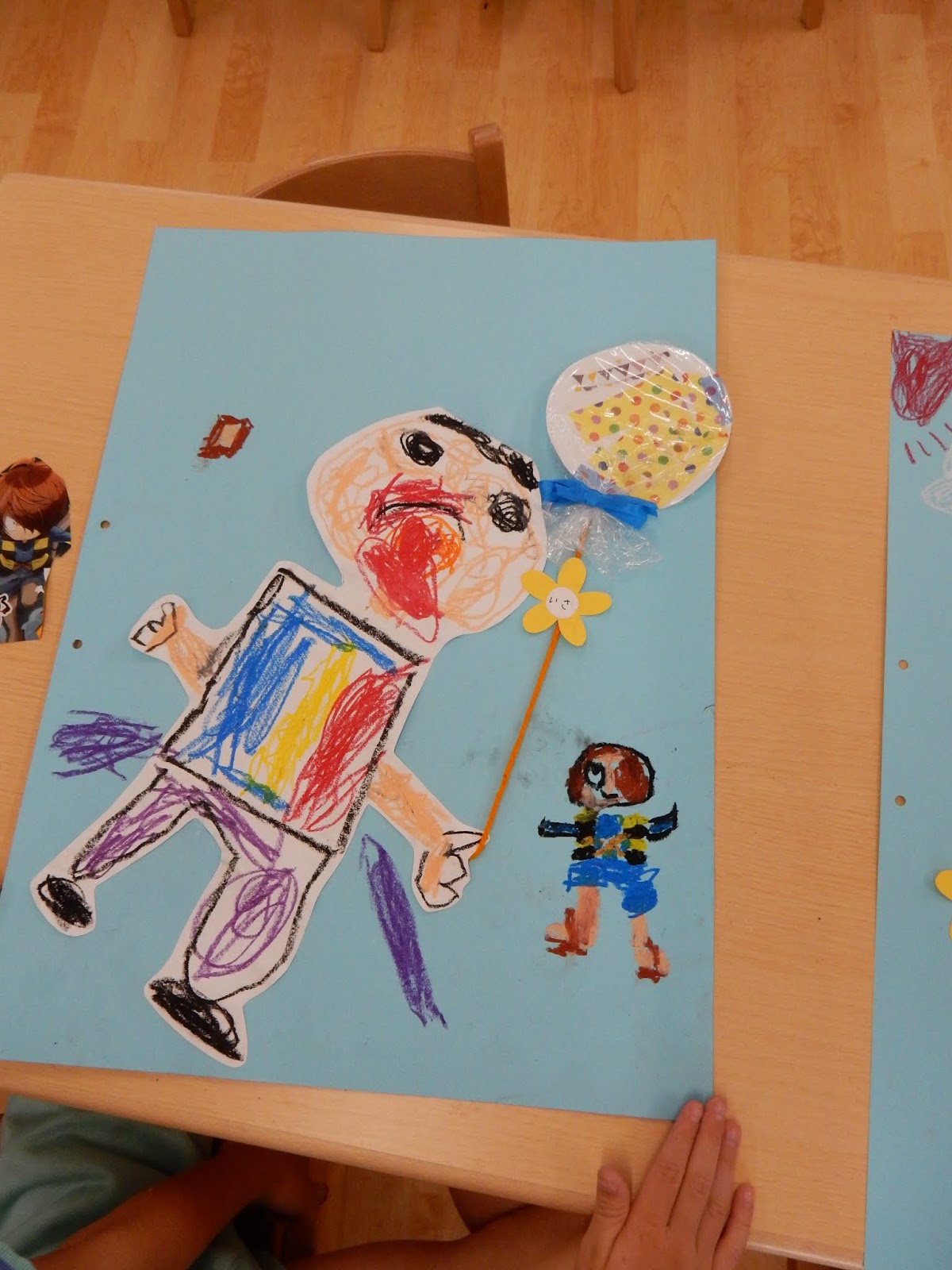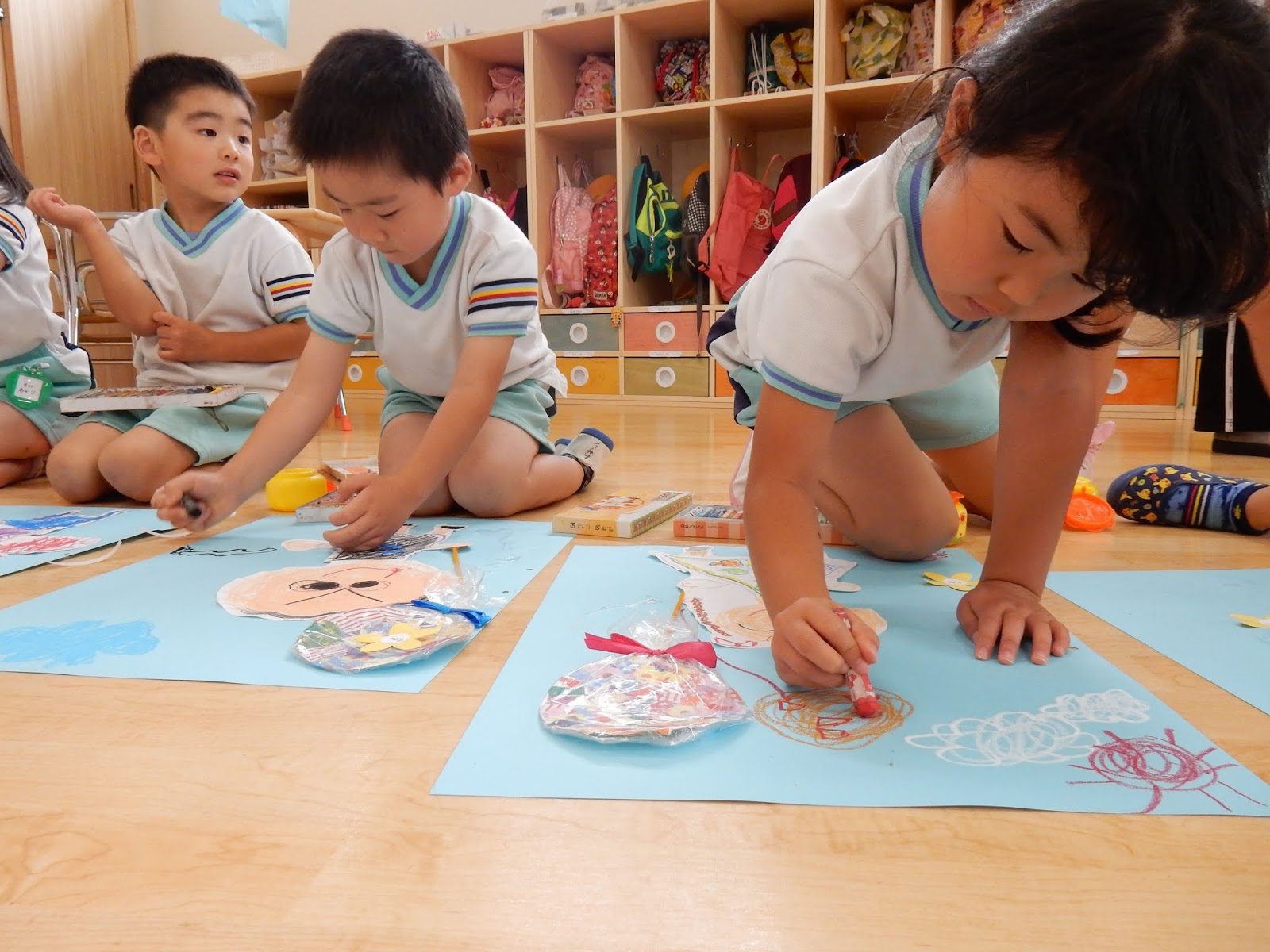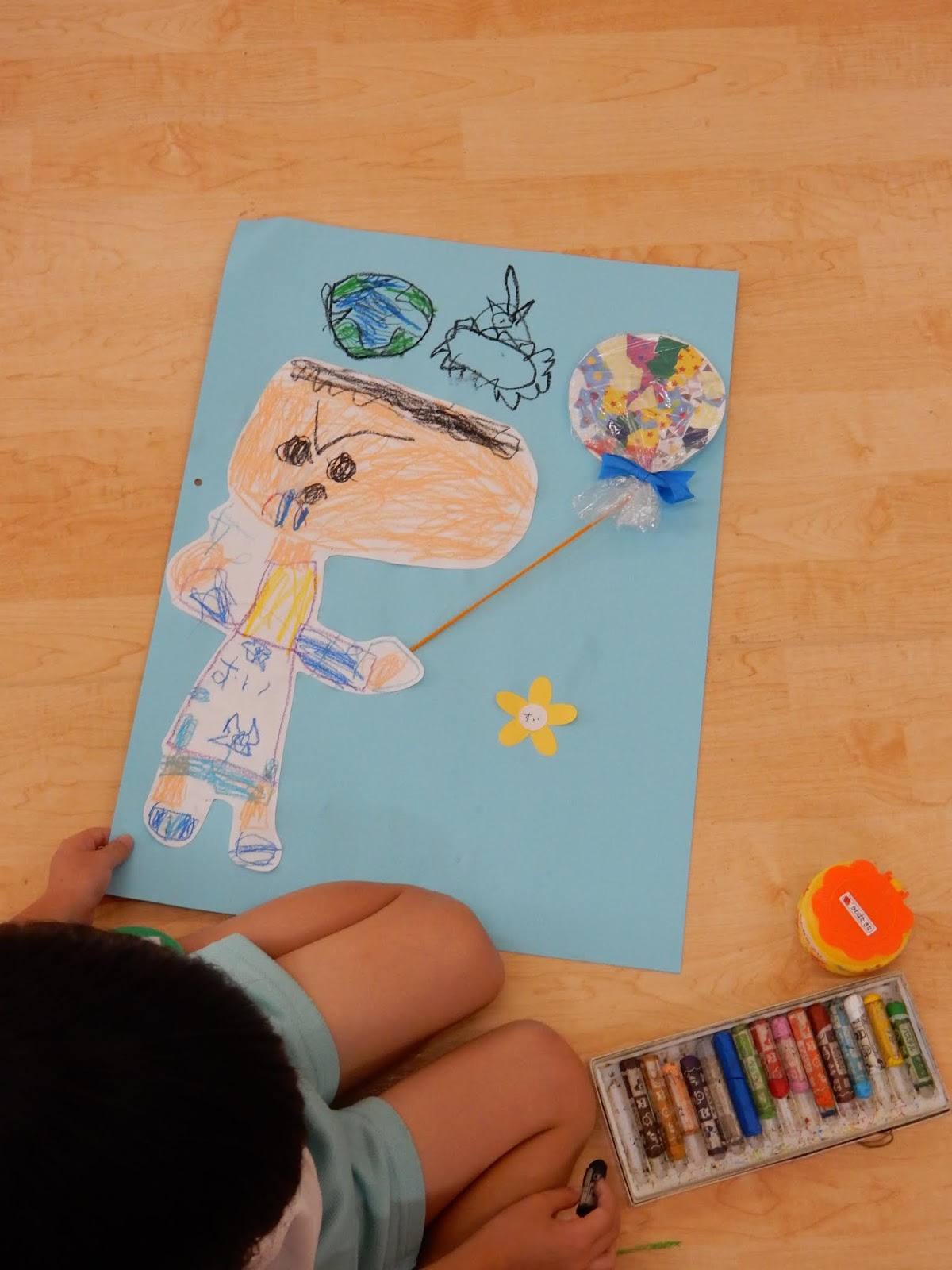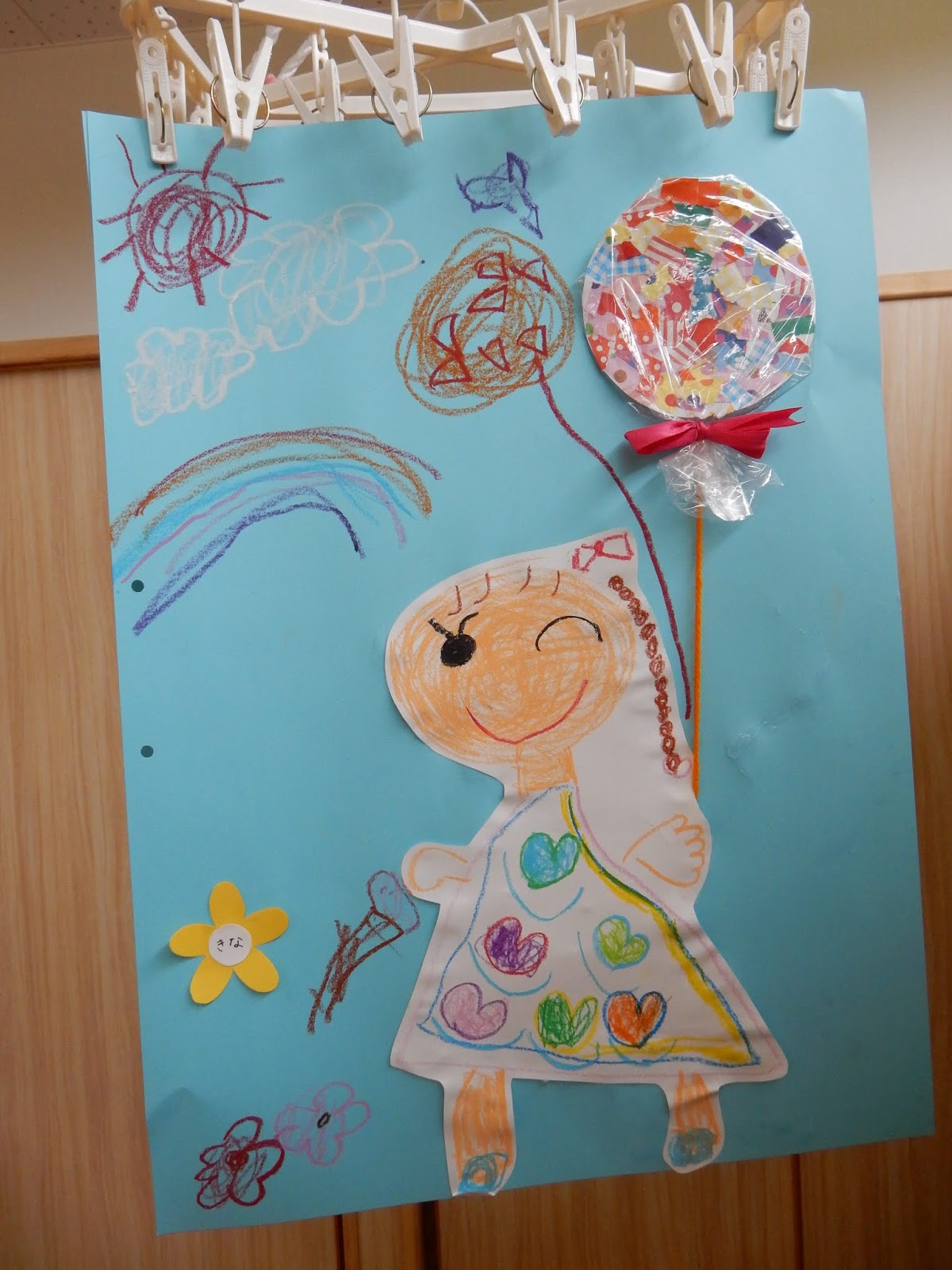 ひまわりさんも、大きな画用紙に風船を持って空を飛んでいる風景を描きました。こちらもいろんな思いが詰まっていて、楽しかったですよ!『空に浮かんでいる物なんだっけ??』と話したり、『ぼくは宇宙まで跳んでいく!』と宣言して、きれいな地球を描いたり、『キタロウと一緒に跳びたいなぁ』と話してくれたり、なんだか、とっても夢いっぱいの絵が完成しました!描いているひまわりさんとお話をするのも、楽しかったですよ♪