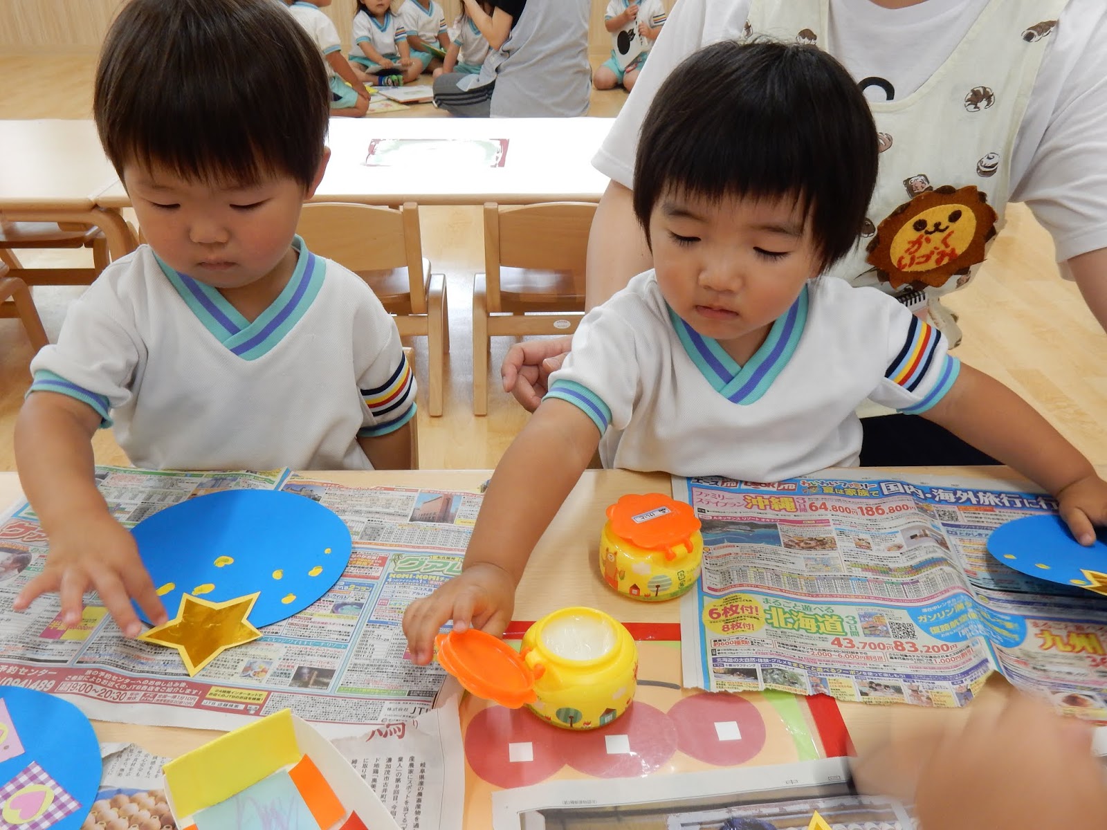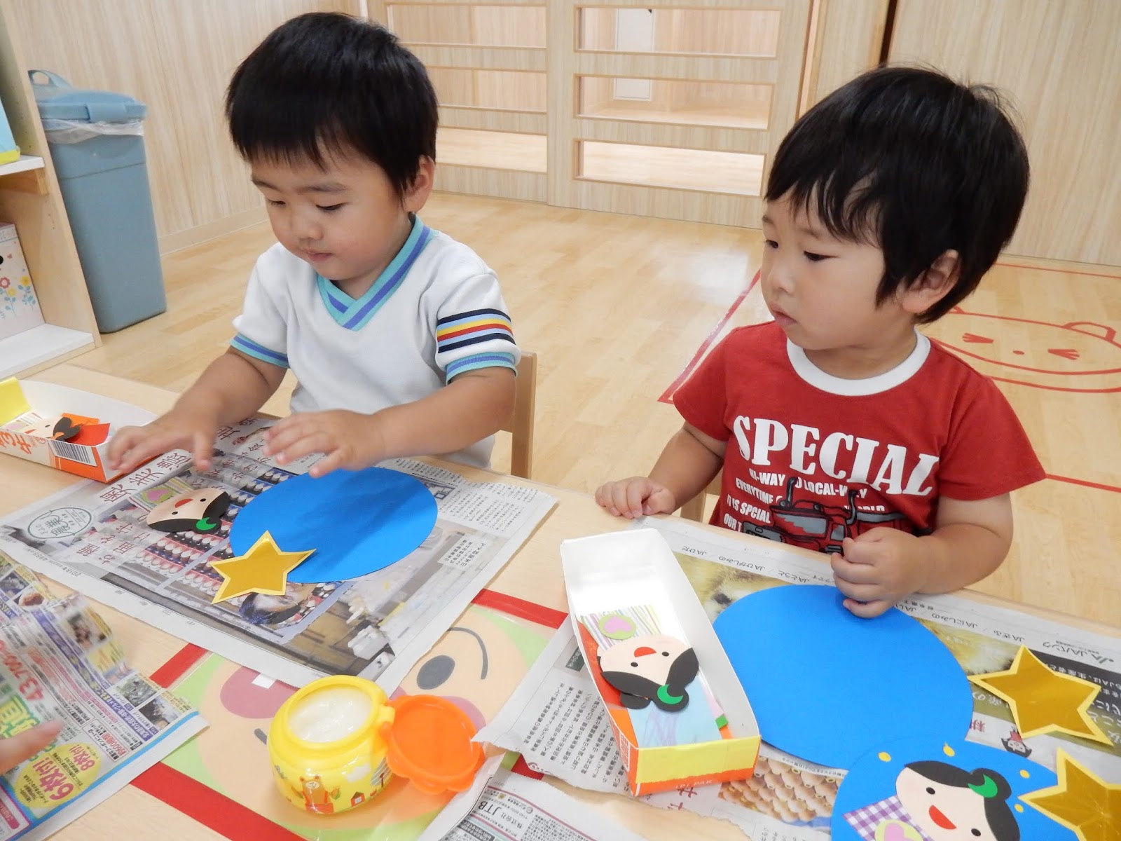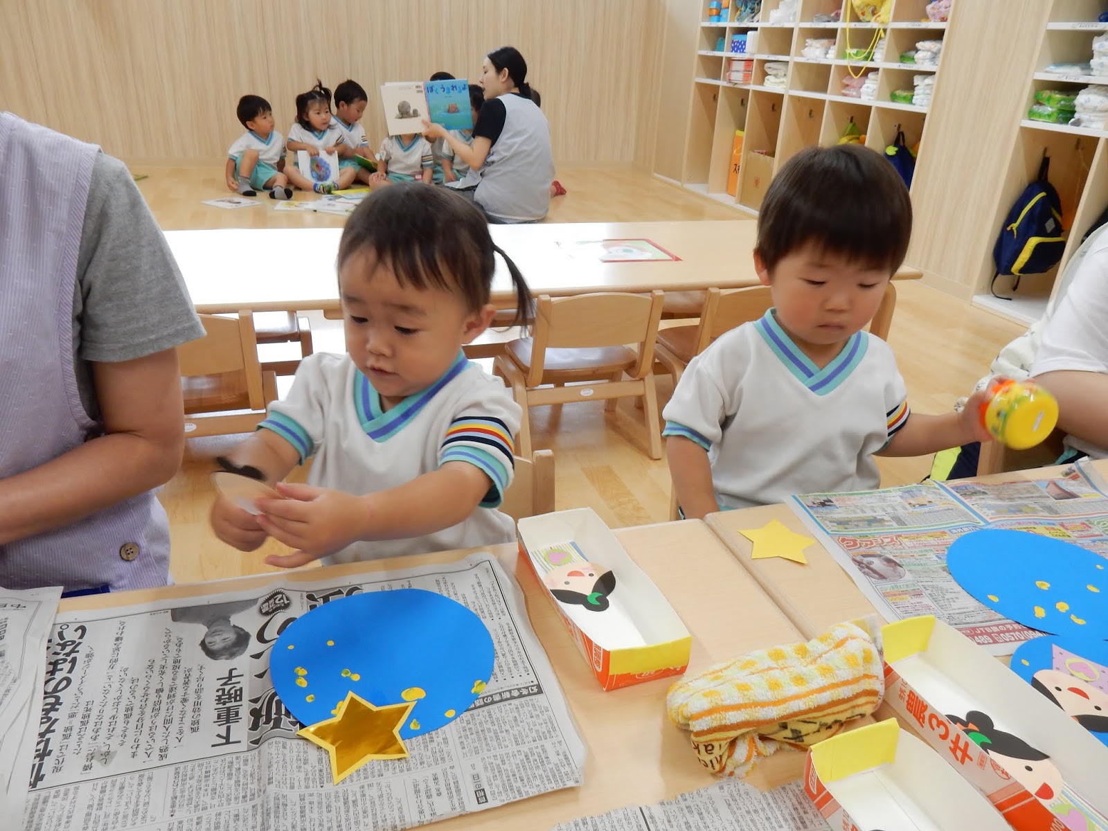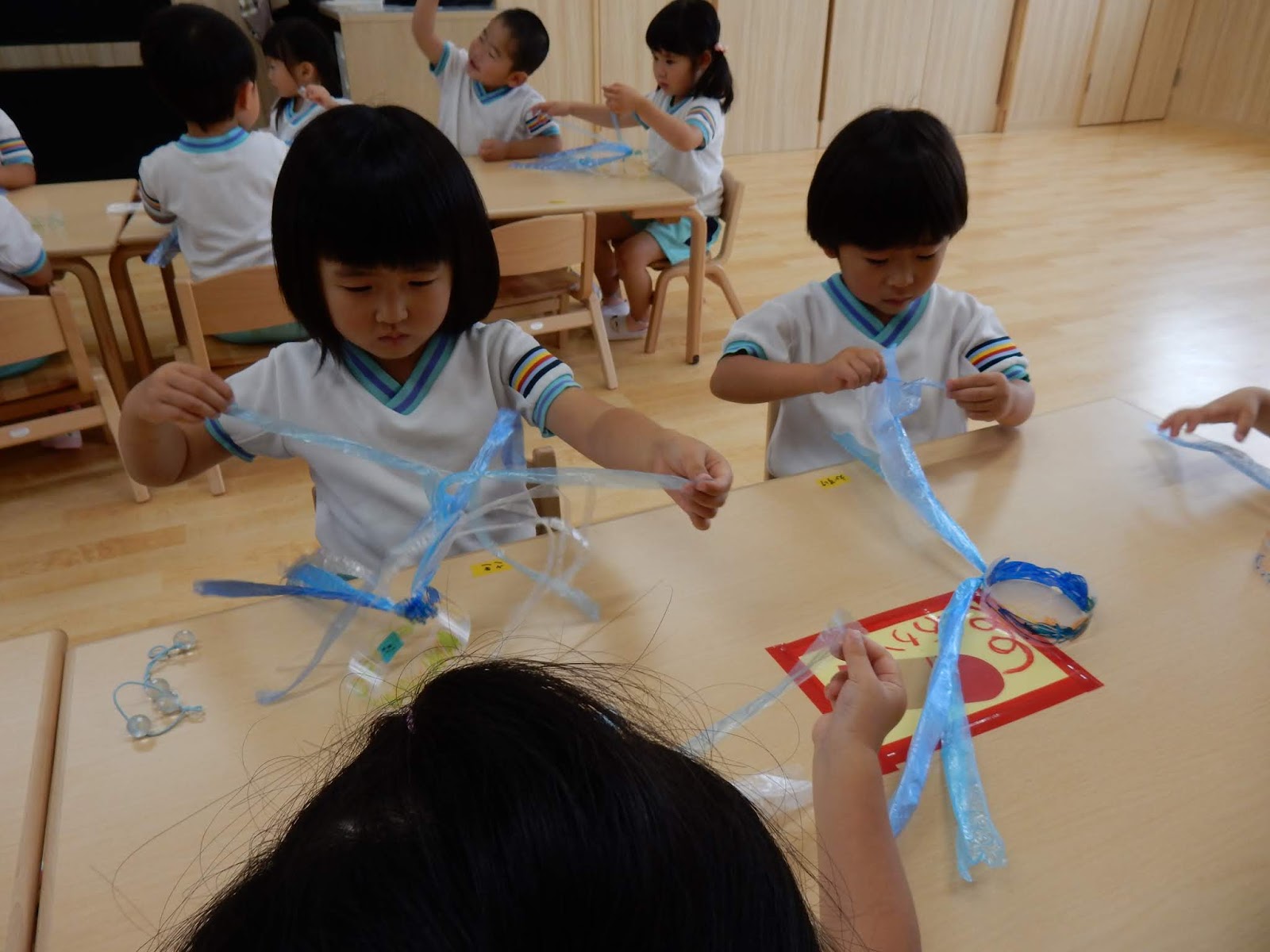 たんぽぽさんと、すみれさんは、それぞれ七夕の製作をしました。各クラス、毎日少しずつつくっていますが、本当に色々な素材が出てきて、見ていて楽しいですよ!