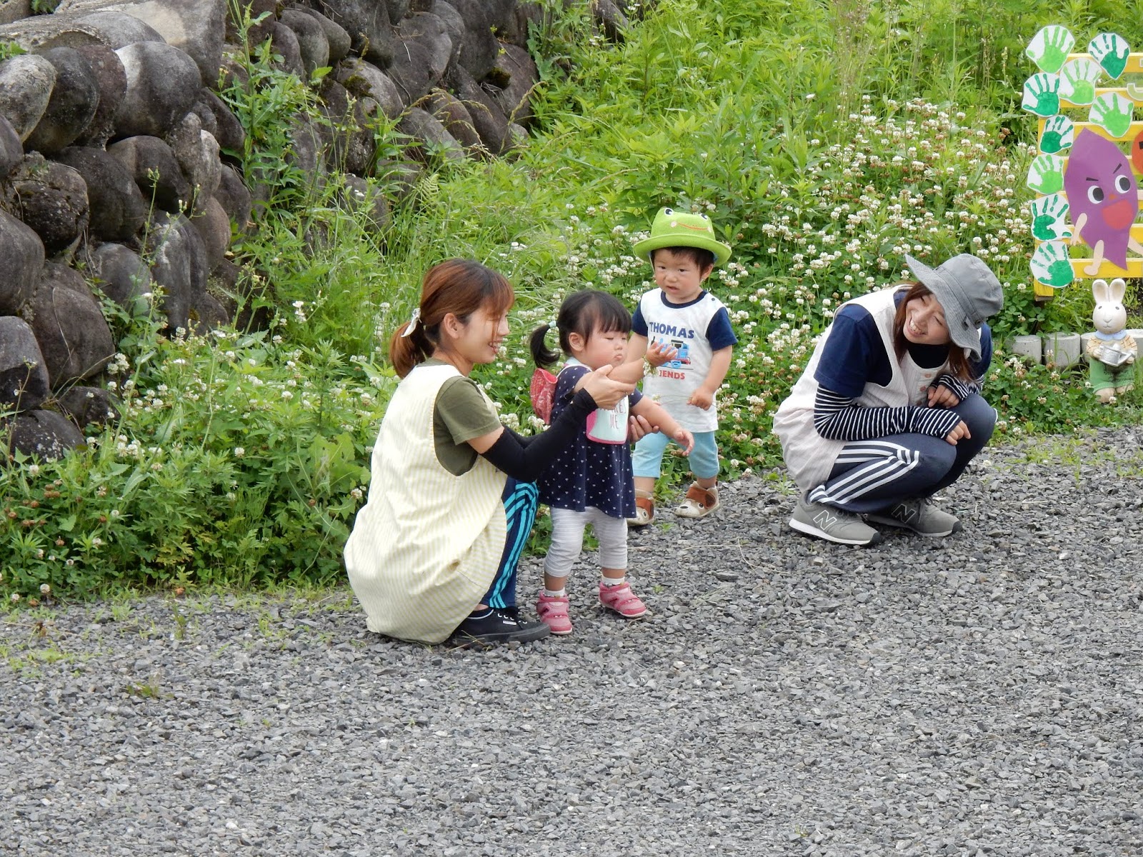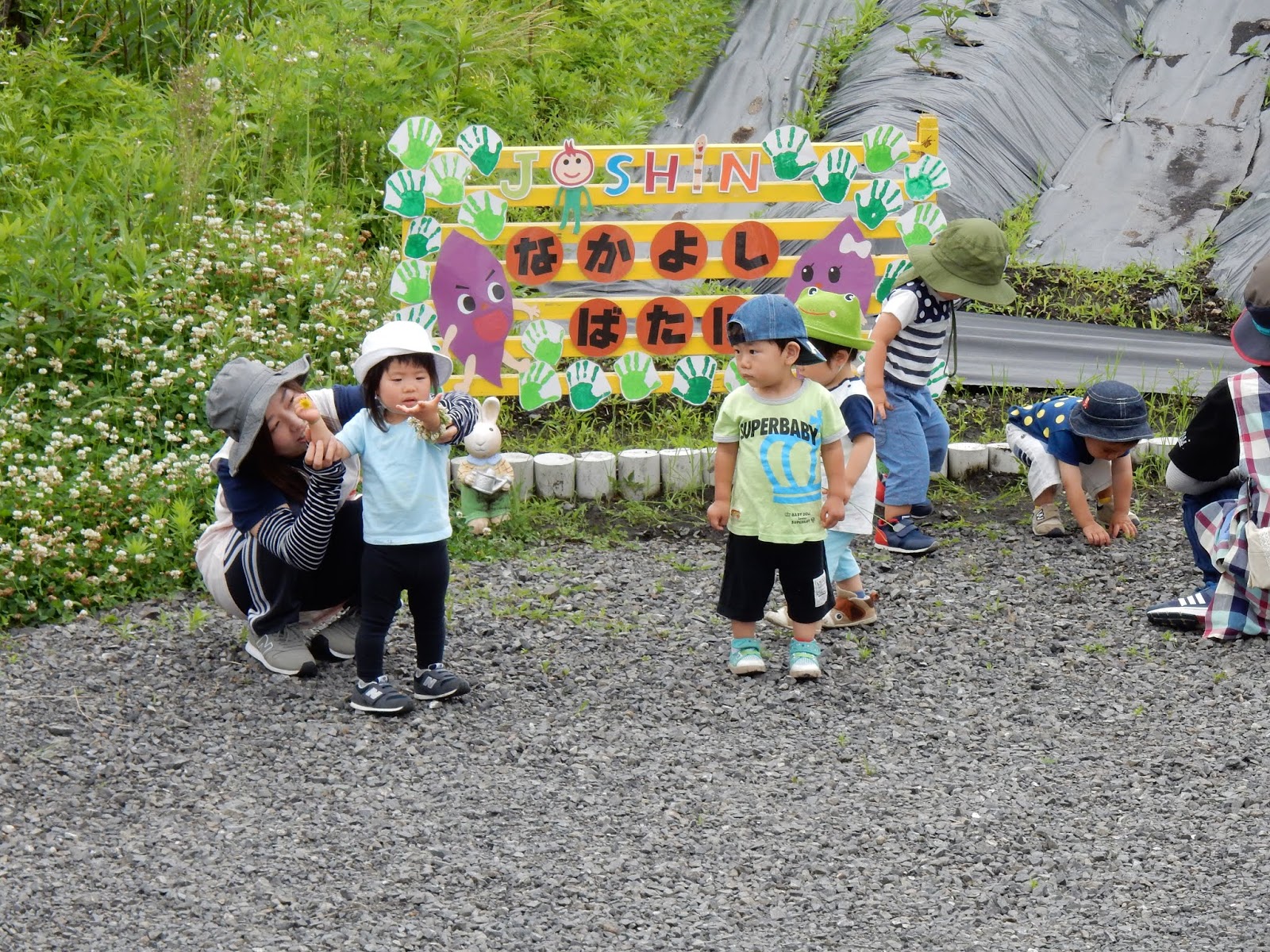 お散歩の帰りに畑に寄ったひよこさん。2階からカメラを向けると、数人のお友達は気付いて手を振ってくれました♪サツマイモの成長を見守り、シロツメクサの腕輪を先生に作ってもらったのかな♪近場でも楽しめる環境がまだまだたくさんあります!