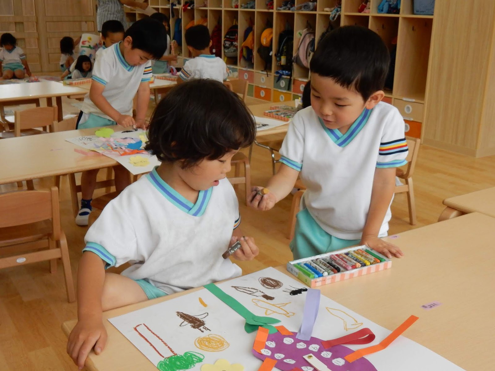 ゆりさんは、飾っていた時計を作品ファイルにとじました。お花の時計と一緒に、虫を描いたり、花を描いたり。お友達とお話しながら、楽しそうにお絵描きしていました。虫を描く男の子の絵が、なかなか特徴を捉えていて感心しました!