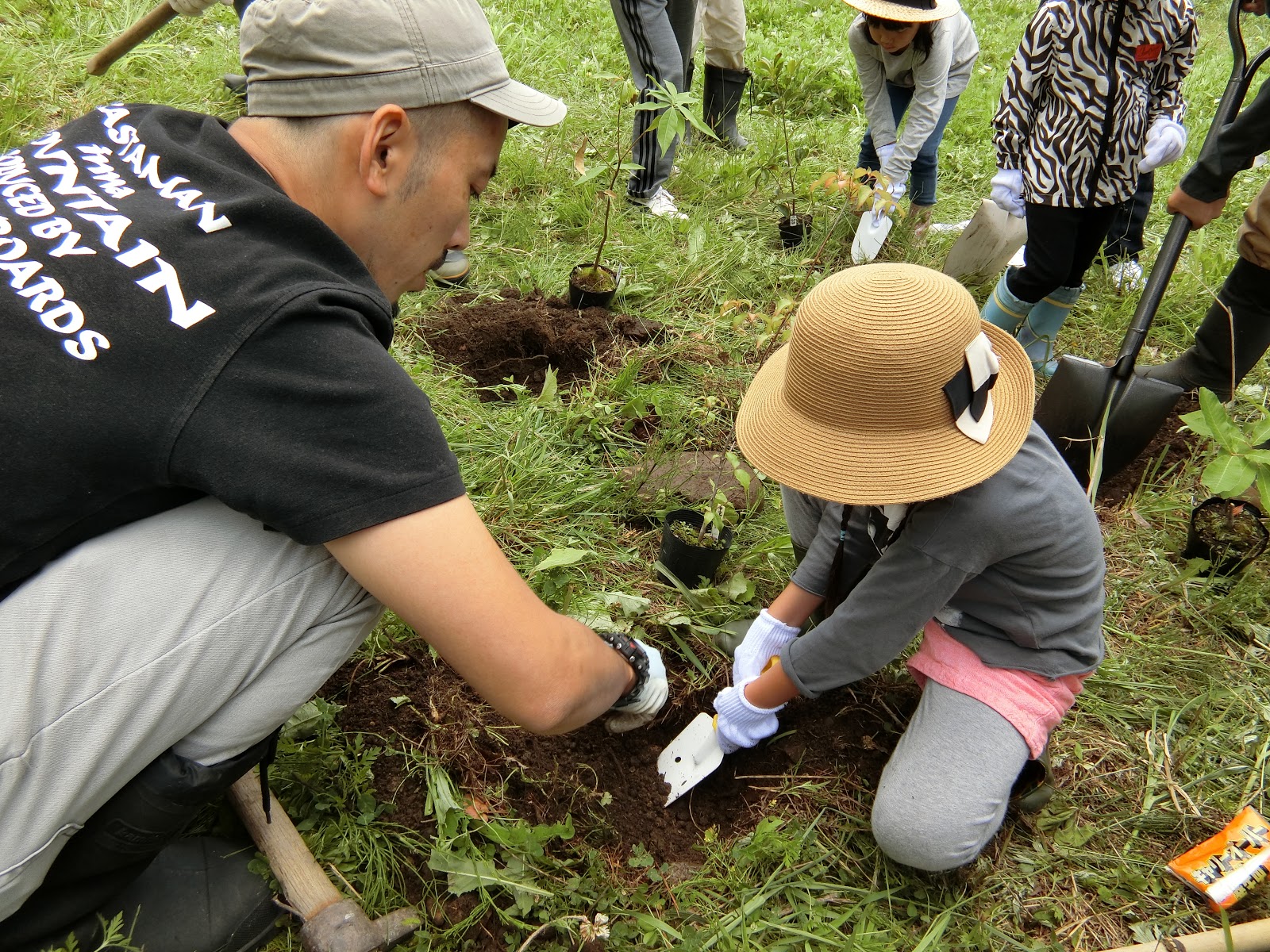 1人1本ずつ苗木をもらうと、親子で力を合わせて土を掘ります。力持ちのお父さん大活躍です!苗木を植えたら、水をたっぷり汲んできて、土にかけました。自分の名前の入った杭を打ち込み、完成です!