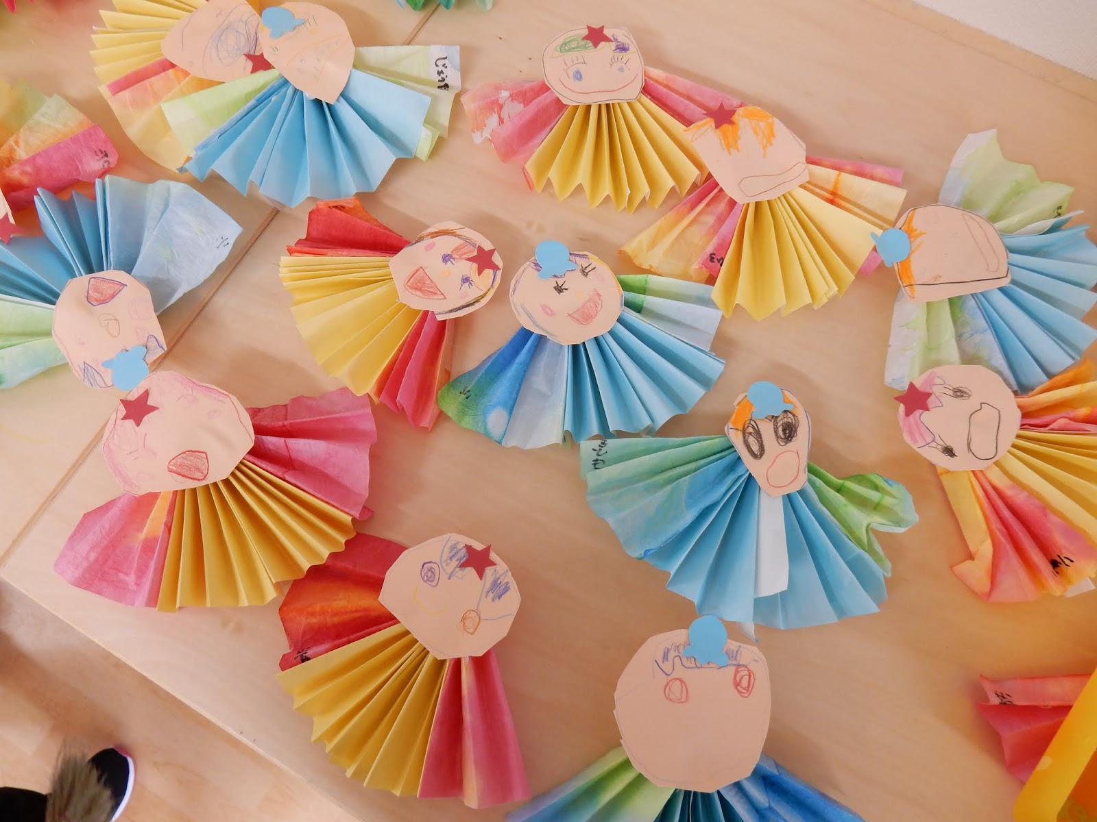 おりひめさまと、ひこぼしさまの製作をしていたゆりさん、ひよこさん。ゆりさんは、自由にお絵描きをしたので、髪の色も、目の色も、みんなそれぞれ!個性的なおりひめさま、ひこぼしさまができましたよ!