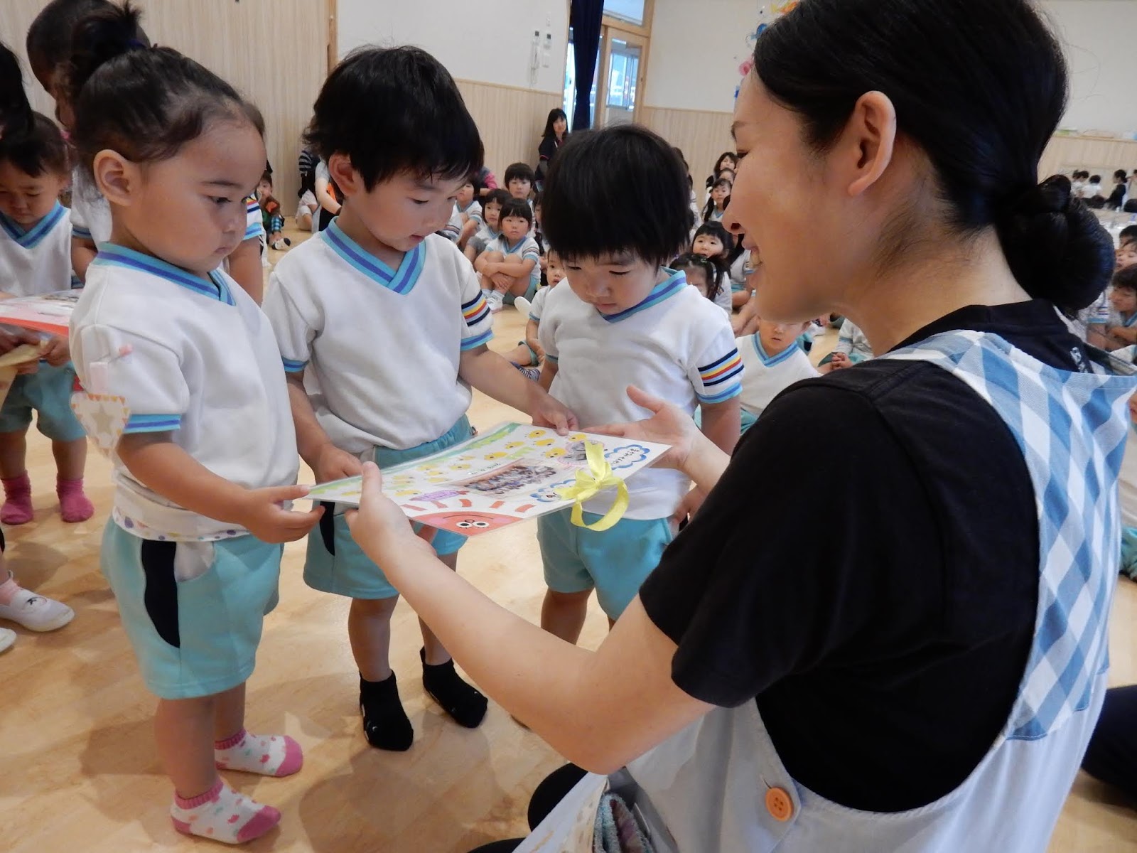 8月に出産を控えたまさみ先生が、明日まででお休みに入られます。そのお話を子ども達にしました。大きなお腹になっても、すみれさん、ひよこさんをはじめ、園のみんなとたくさん遊んでくれたまさみ先生に、みんなで『ありがとう!!』を伝えました。