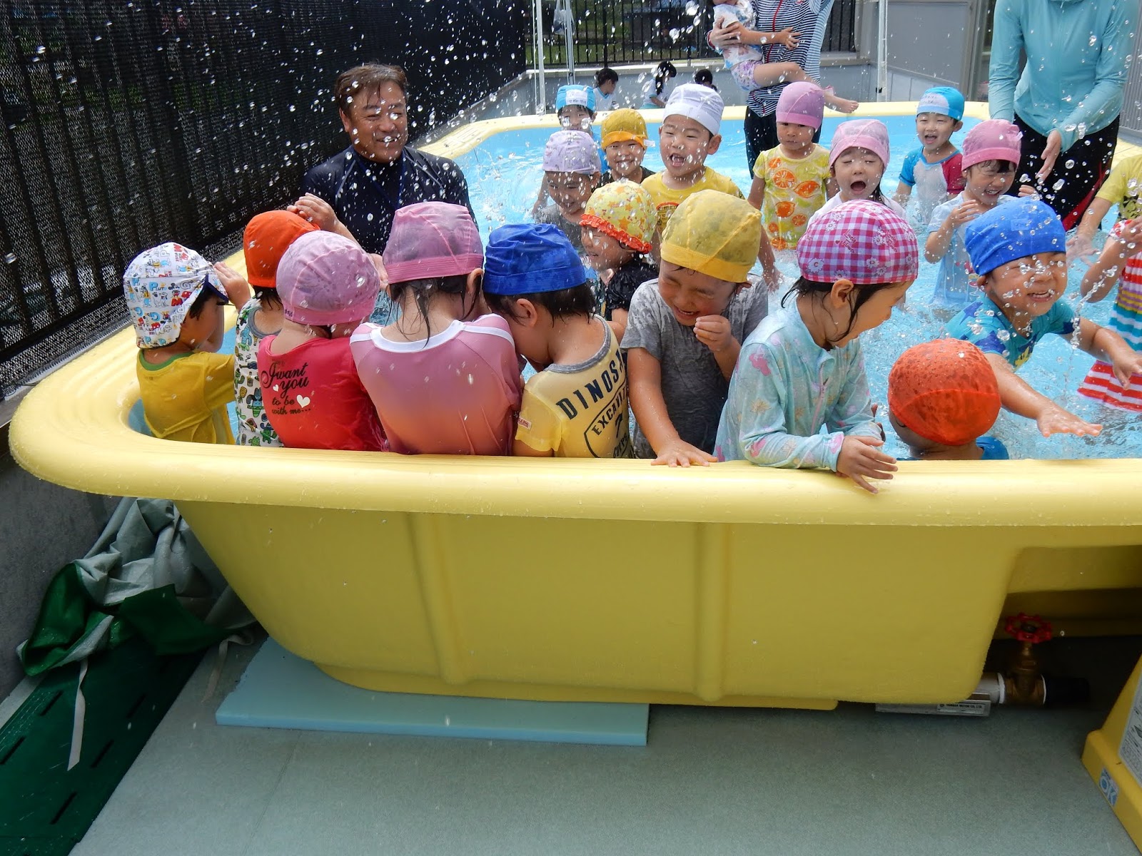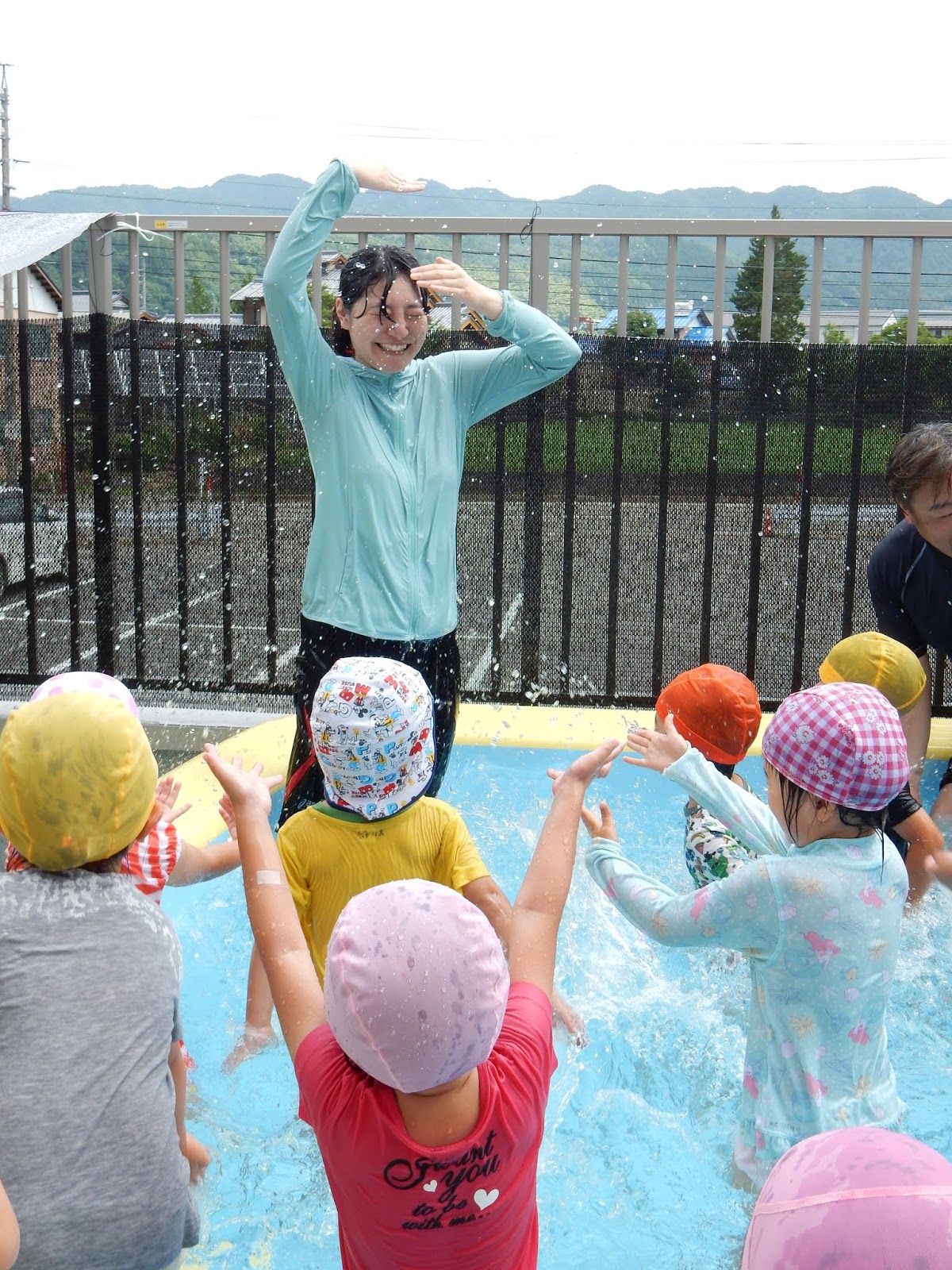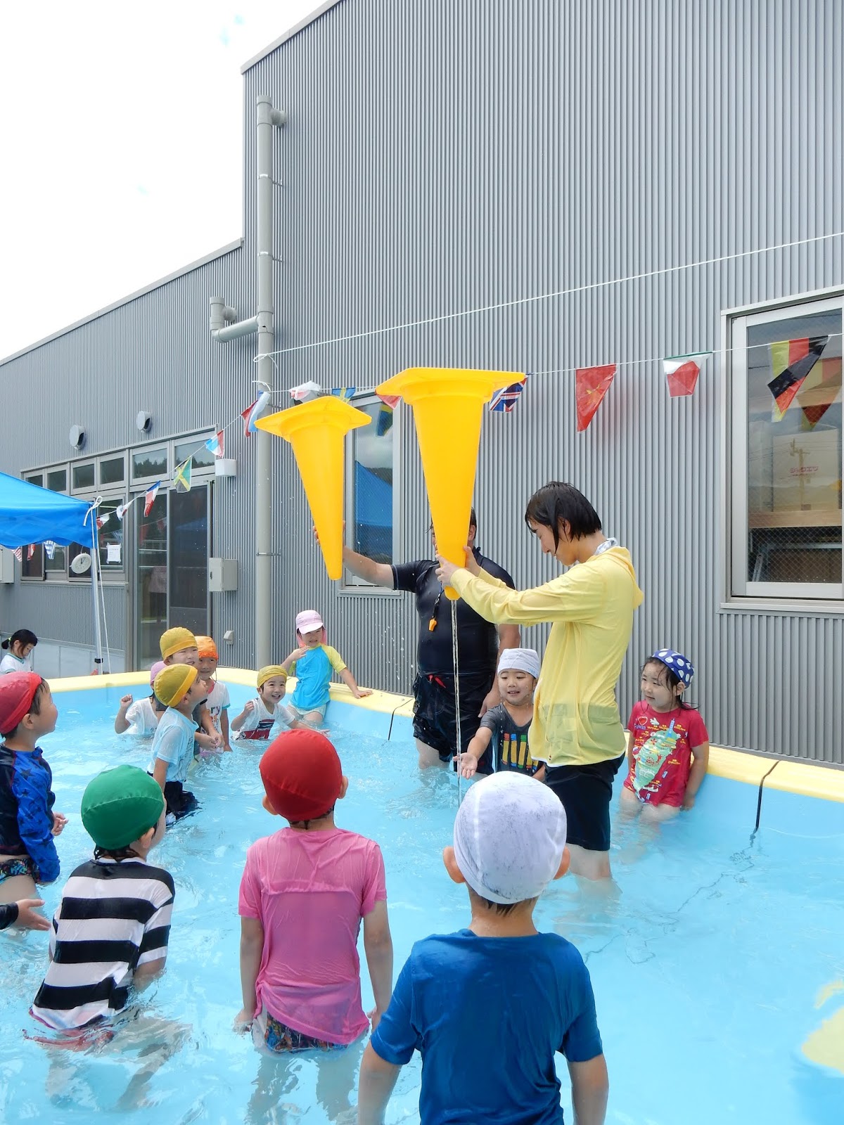 楽しく水遊びをして体をクールダウンさせる事はもちろんですが、加えて、少し難しい事に挑戦することや、ここまで頑張ろう!と子ども達自身が目標設定してそれに向かって努力しようとする心をこの時期のプール遊びや、その後の運動会練習で育てていきたいと考えて関わってます。