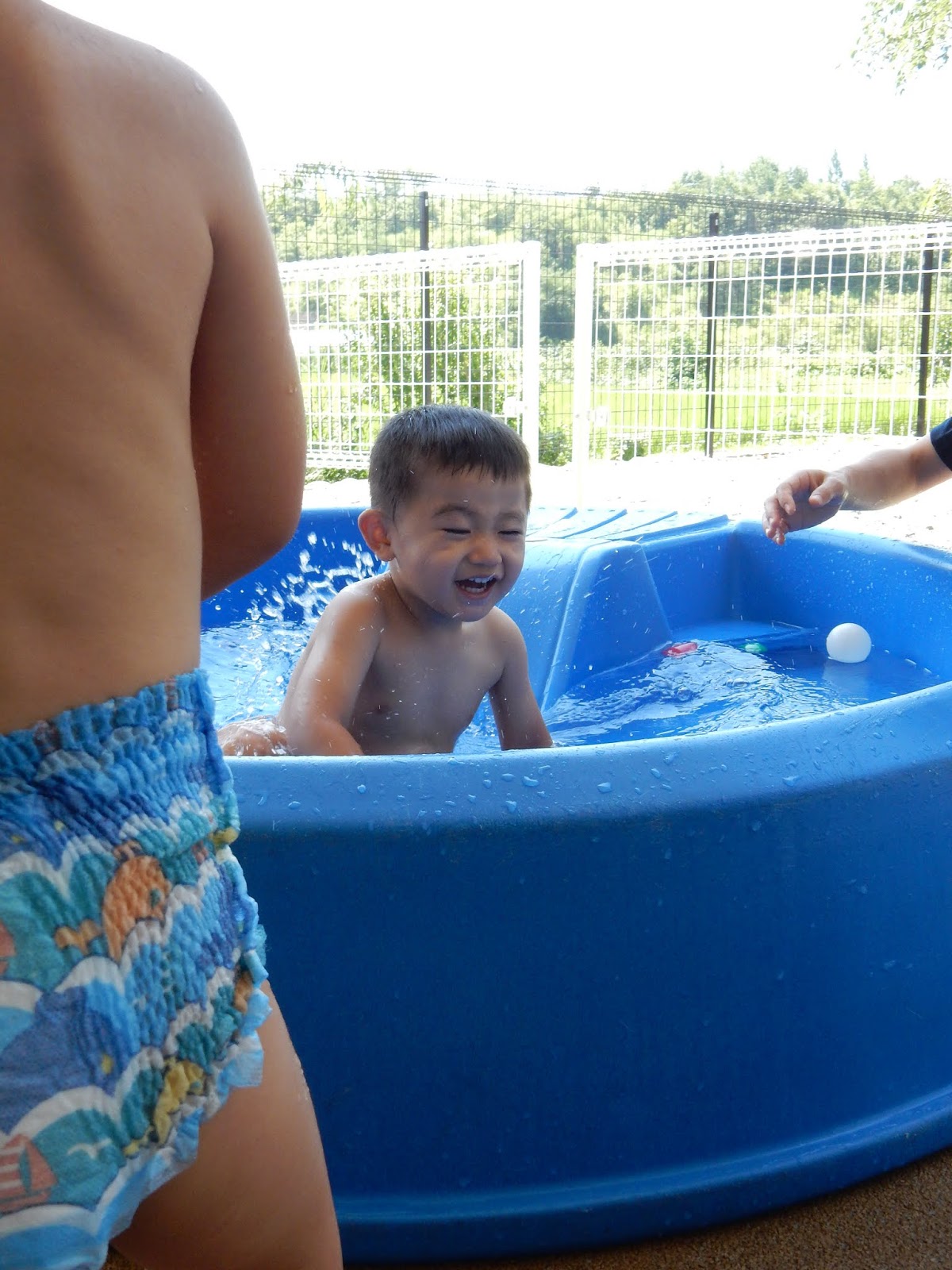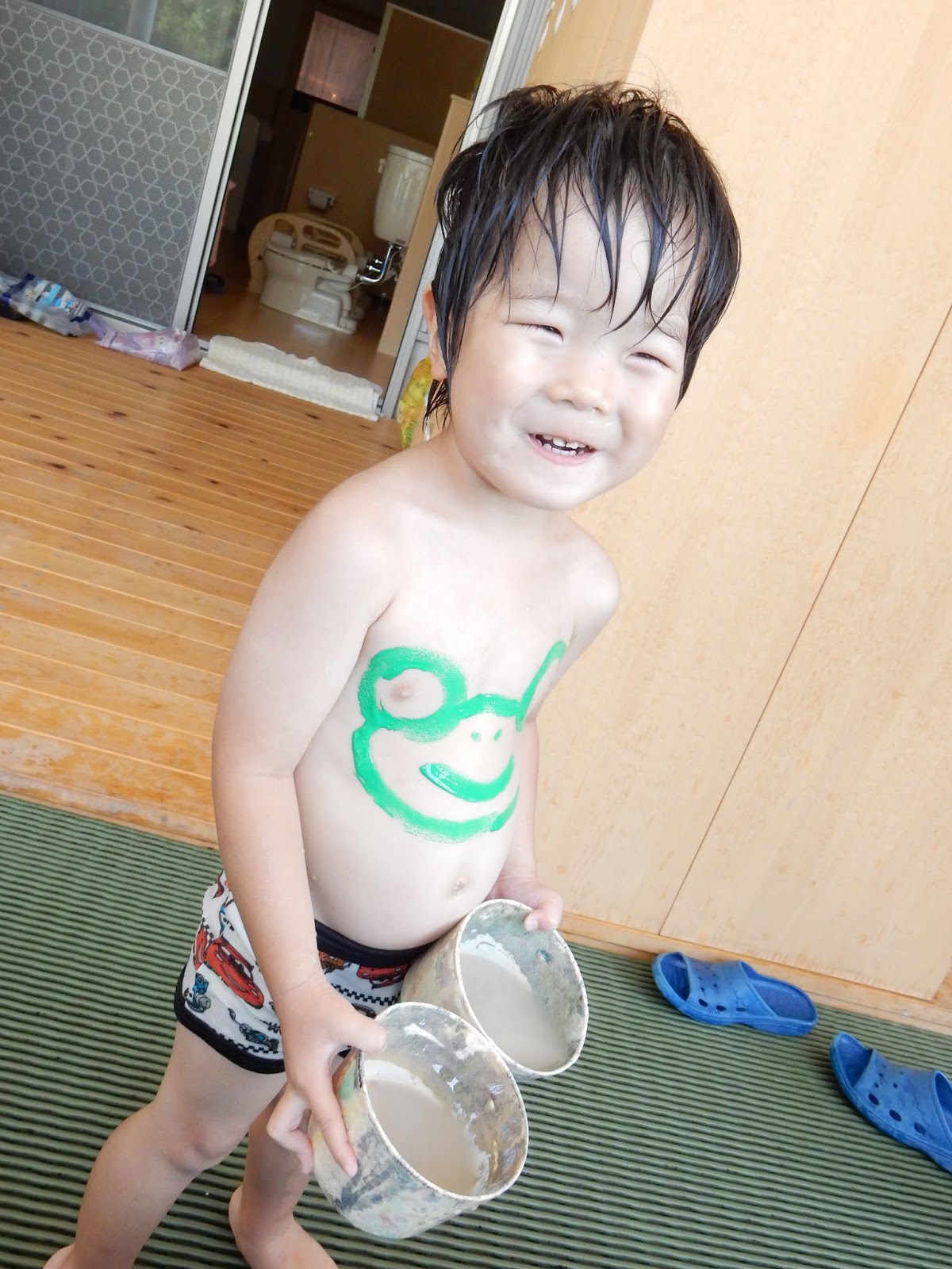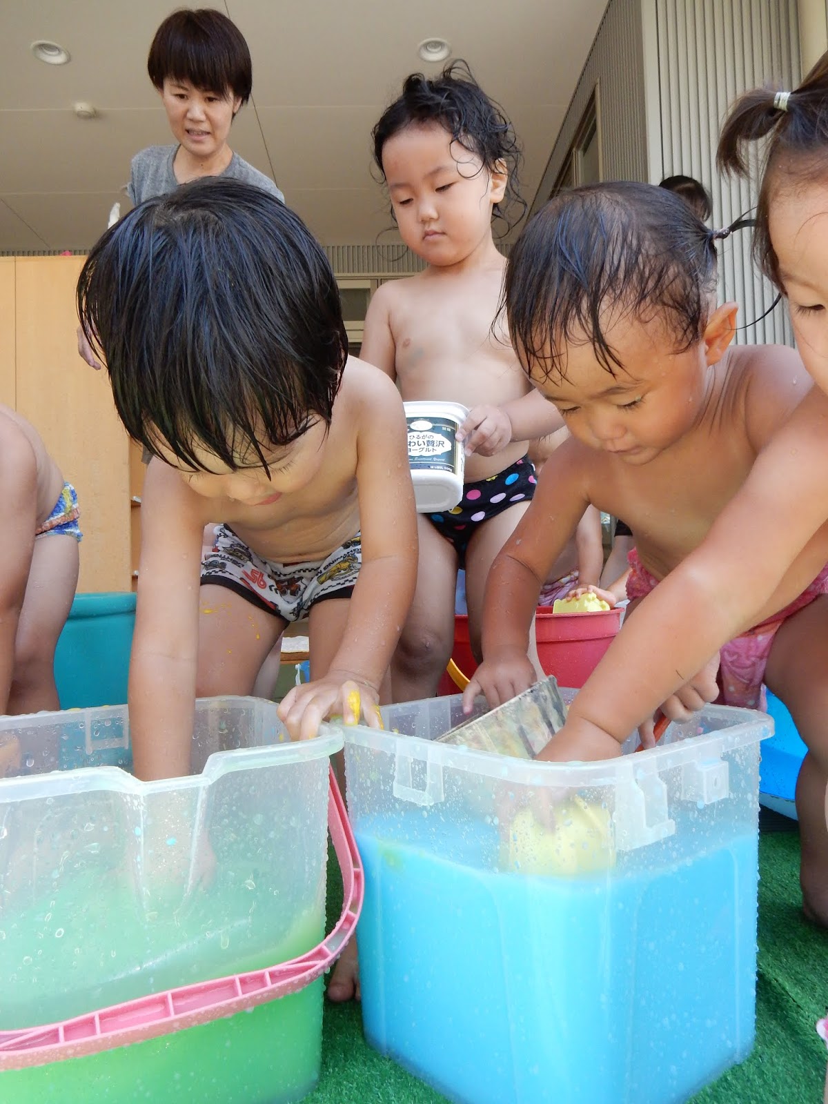 牛乳パックに色んな色のジュースを入れて楽しみました!お腹にお絵描き♡カエルさんが遊びに来ましたよ♪水遊びも、プールだけでなく、いろんな遊びを楽しんでいますよ!