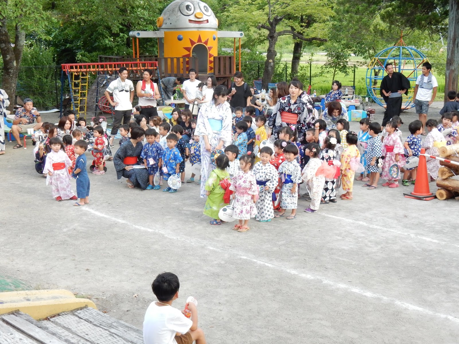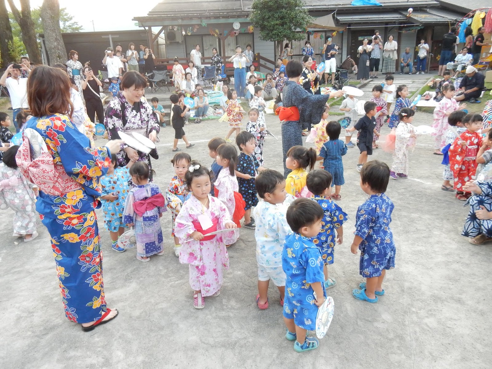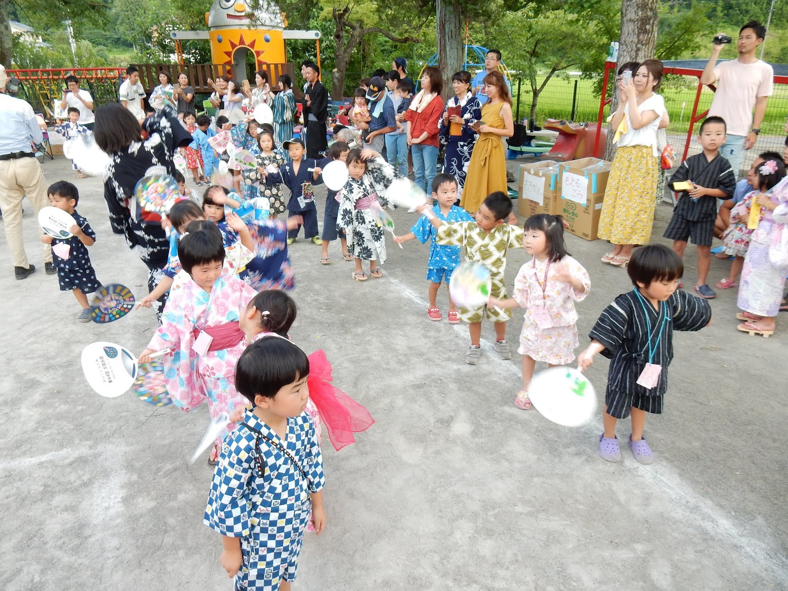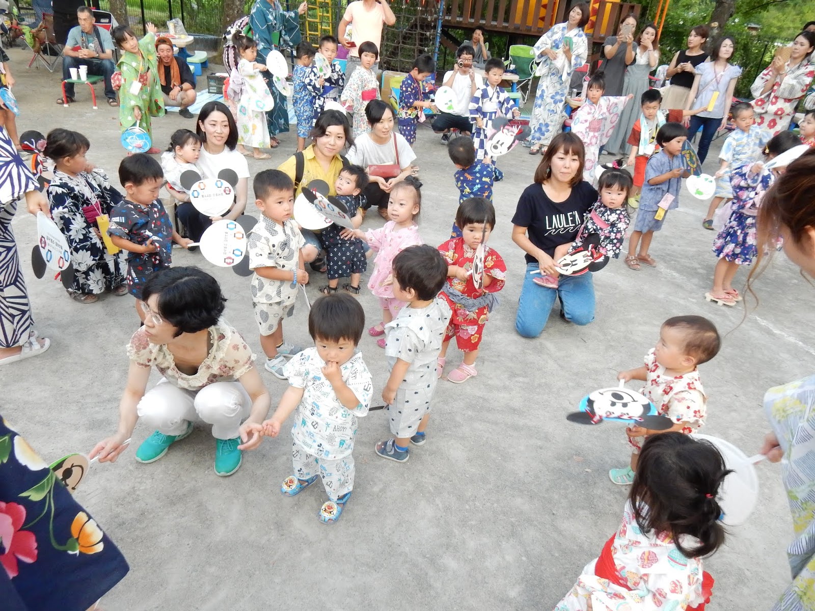 いつもと違う、浴衣姿の登園に、最初は少し緊張気味に見えたみんなの表情も、練習してきた盆踊りを踊る頃にはすっかりにこやかになり、手作りのうちわを片手に“わっしょい!わっしょい!!”元気いっぱいの声が響きました。お父さん、お母さんも混ざっての源助さん。音楽が聞きにくかったようですみません!一足早い夏祭り気分を味わっていただけたでしょうか!