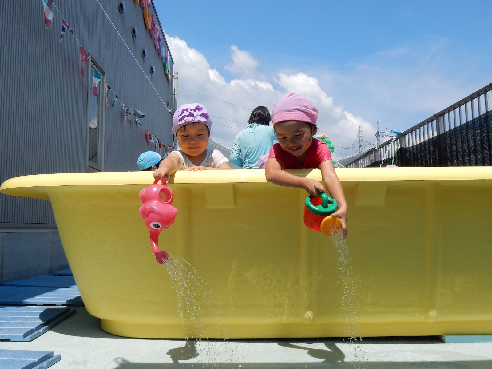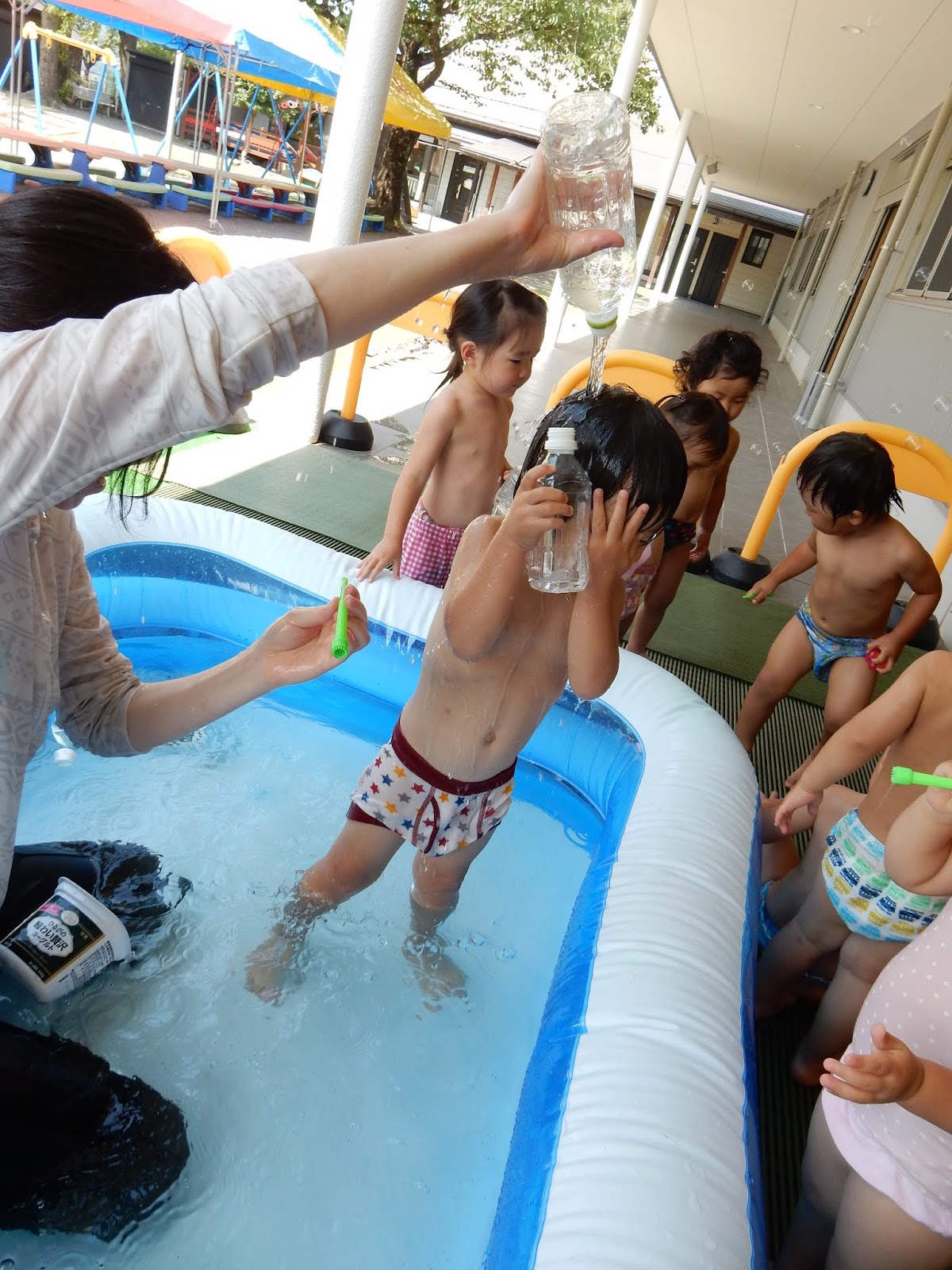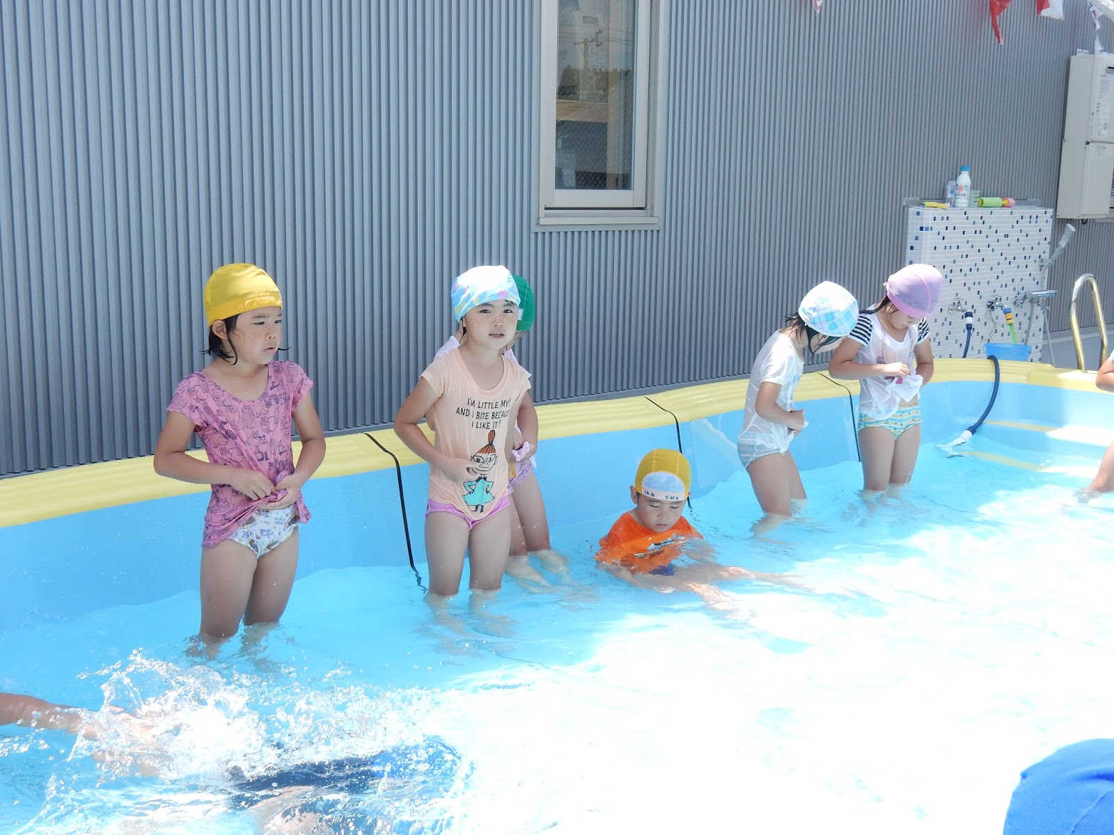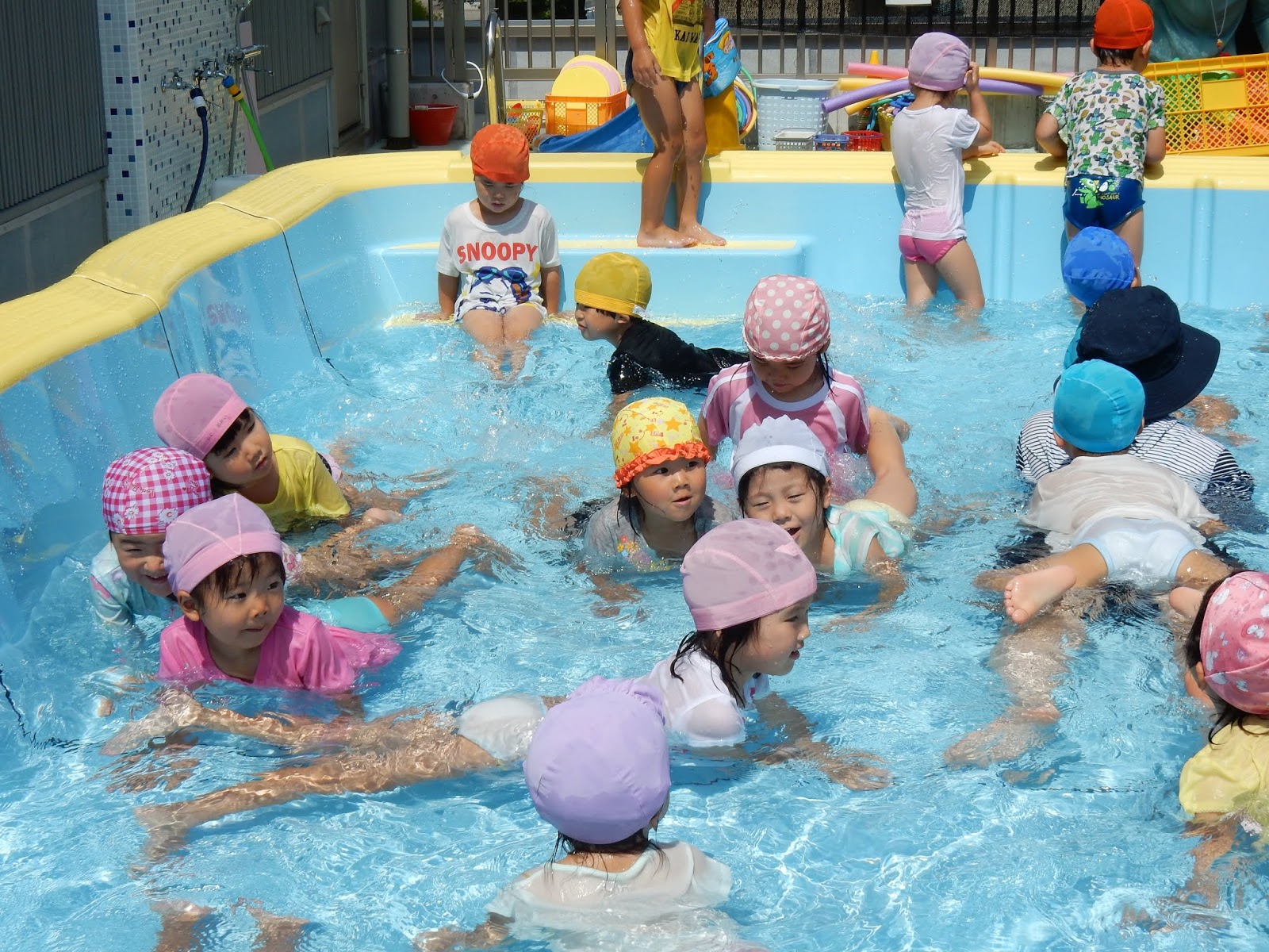 7月は本当に毎日が暑く、絶好のプール日和が続いています。たくさん遊んで、水遊びで涼んで、ご飯を食べて、午後から体を休めて…という夏の生活リズムも身に付き、また衣服の着脱も、それぞれが自分でやろうと頑張っています!すみれさんや、ひよこさんも、服がひっくり返しになりながらも、“自分で!”と取り組んでいますよ!お風呂上りなど、お家でも声を掛けてみて下さいね!