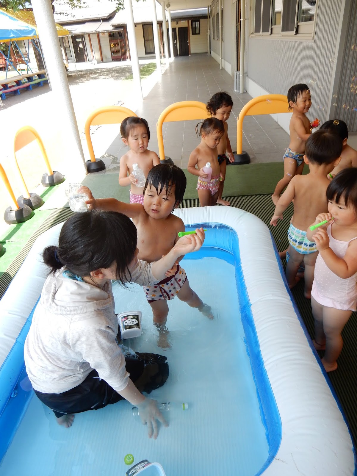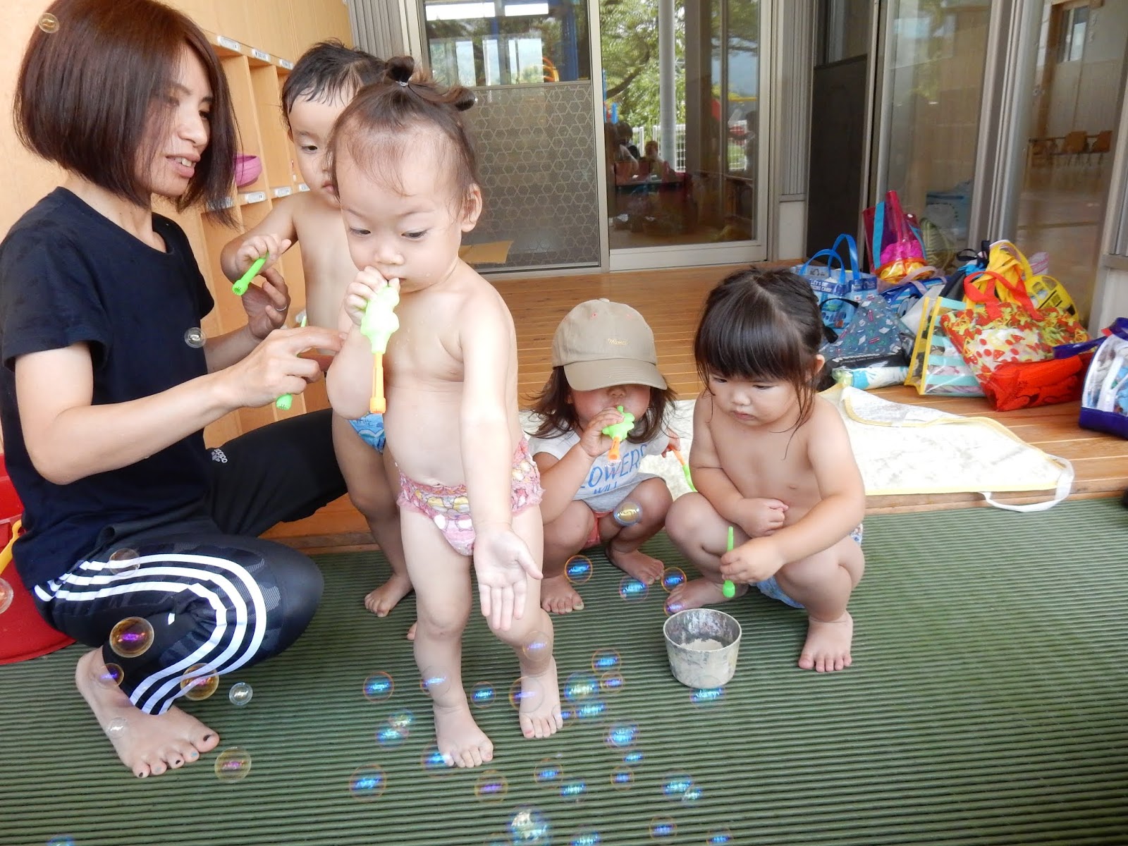 泡あそびや、しゃぼんだま、色水遊びを楽しんでいるすみれさんや、ひよこさんです。