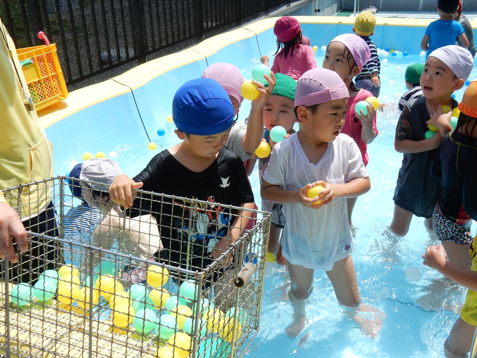 水中ビー玉ひろい大会開幕!!真奈美先生が連覇中だそうで、打倒真奈美先生!!とみんな気合十分!制限時間内にたくさん拾って、みんなで数えます。その結果…!!!ついに!真奈美先生よりもたくさん拾えたお友達が!みんなから、大量の水しぶきでお祝いしてもらいました(笑)