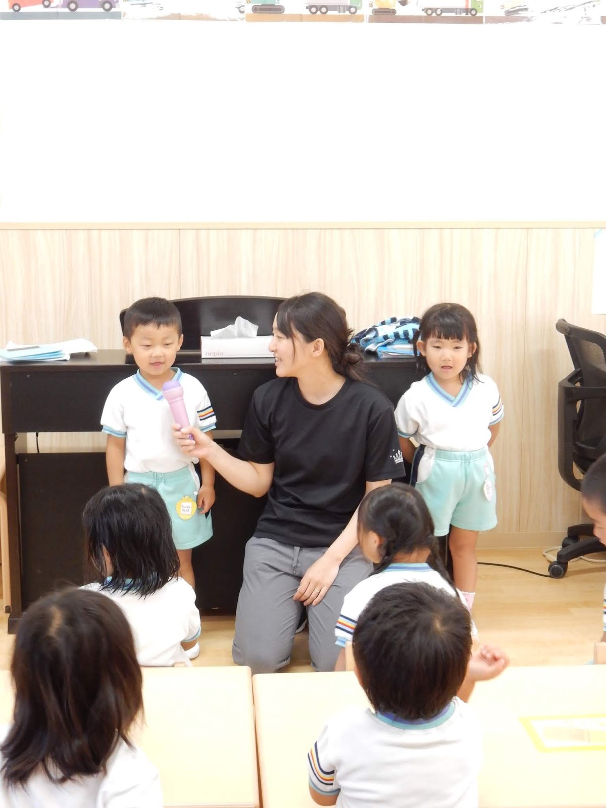 お当番さんのインタビューも、何回か繰り返し、みんなとっても上手にマイクに向かって答えてくれているみたいです。名前や年齢はもちろん、好きな色や、朝ご飯は何を食べてきましたか??なぁんて質問にも、しっかしお返事できましたよ!