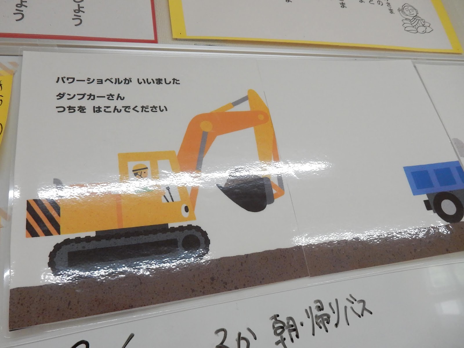 元気一杯のたんぽぽさんのお部屋から聞こえてきた、聞きなれない歌。『なんの歌?』と聞いてみると、まい先生が先日、研修会で教わってきた歌で、絵本のストーリーが歌詞になっていました。絵本を見ながら、力いっぱい歌うたんぽぽさんの表情が何とも可愛らしかったです!