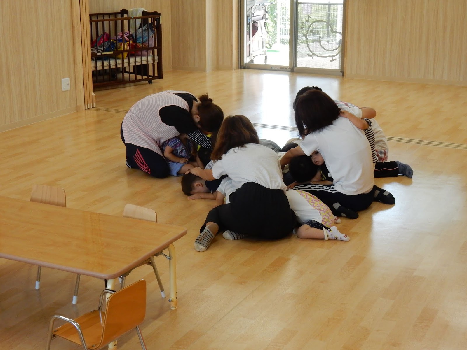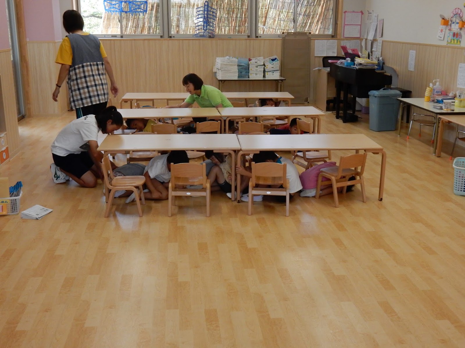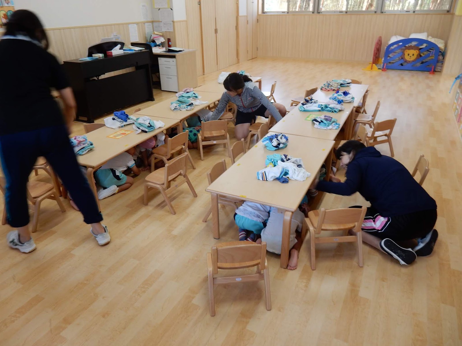 地震の訓練を知らせる太鼓の音がした直後の各クラスの様子です。みんな机の下にかくれて、頭を守る行動をしています。お部屋で遊んでいたひまわりさんは、ブロックや粘土がそのままおいてありますね。地震は、いつどんな状況で起こるか分かりません。子ども達自身が、自分のおかれた環境で、どう行動したら良いかを考えて動くこともとても大切です。