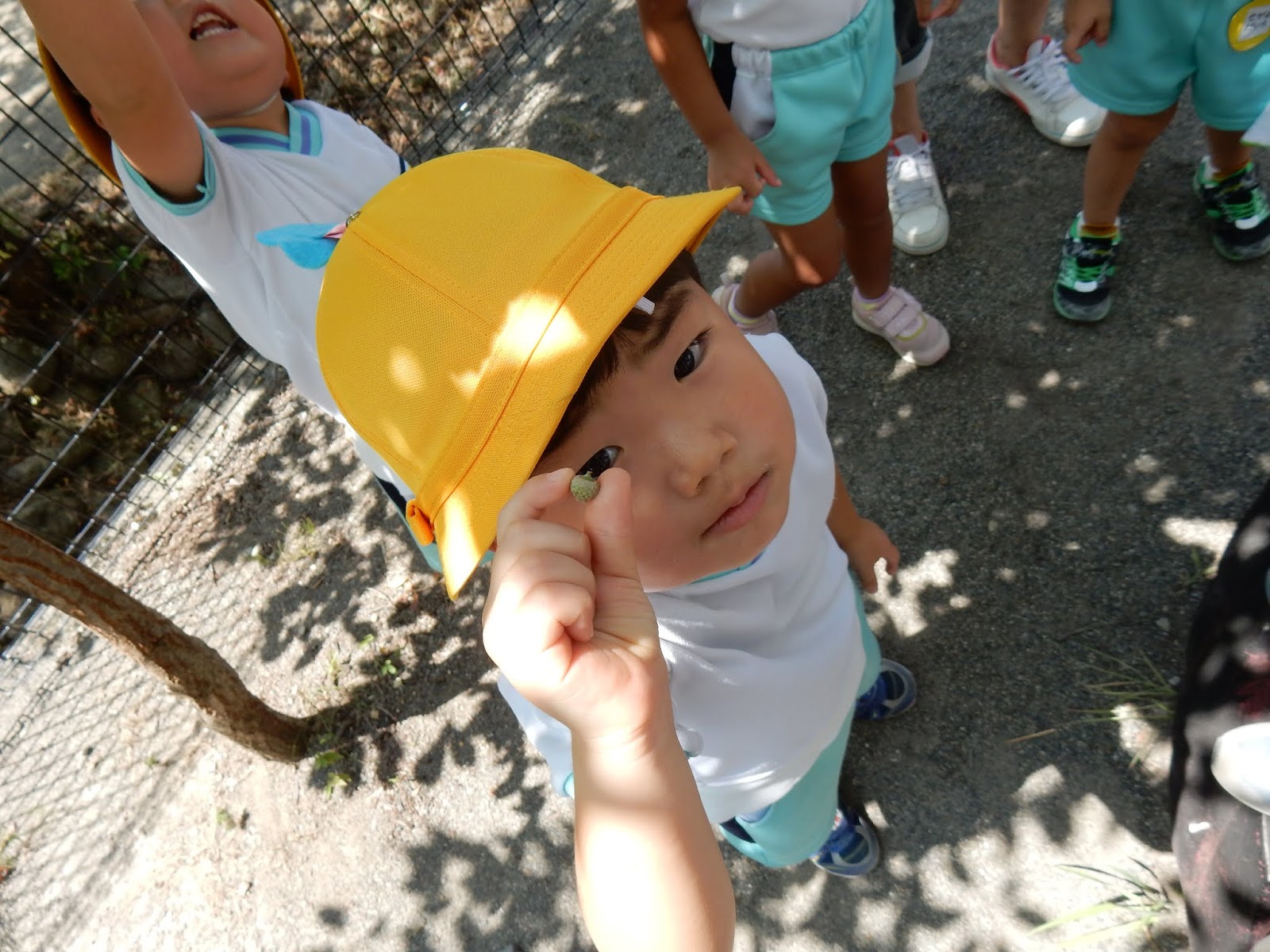 『せんせ~い!!!!』と大きな声で呼びながら走ってきてくれたたんぽぽさん。『どうしたの!?』と聞いてみると、『どんぐりのあかちゃん、みつけた!』とのご報告!これは行かなくては!!と急いで外へ飛び出し、案内してもらいました。園庭の1番奥、今の場所(さくらパーク)に植樹する前に園庭に植えたドングリの木が、ゆっくり、ゆっくり育っているんですが、昨年、初めて1つ実がなっているのを見つけたんです!その木がまたこのお天気でぐんぐん成長し、小さな、小さなドングリの実をつけました!まだ、帽子に隠れてしまうほどの小ささですが、嬉しさのあまり、思わず1つ採ってしまいました(笑)その後、髙い場所にあと2つ見つけたので、こちらはこのまま成長を見守りたいと思います♪