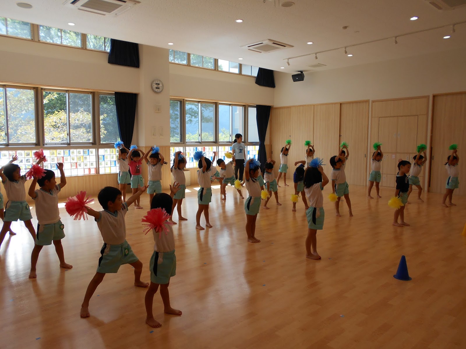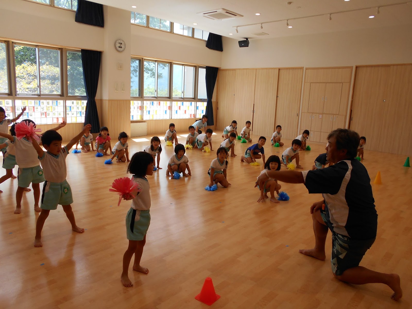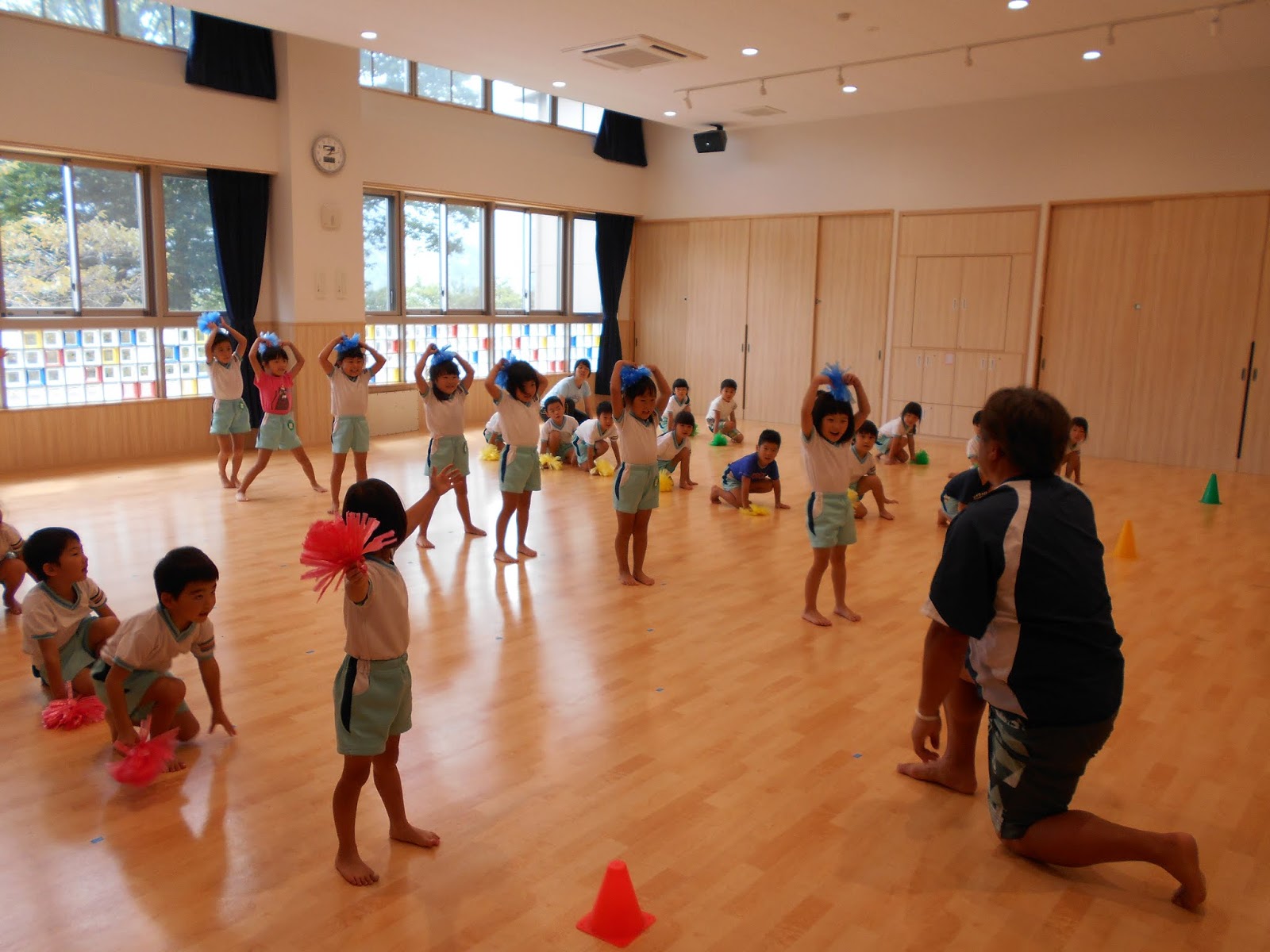ごろごろ先生の体操教室がありました!今日の朝は雨だったので、ホールにて体操教室となりました・・・