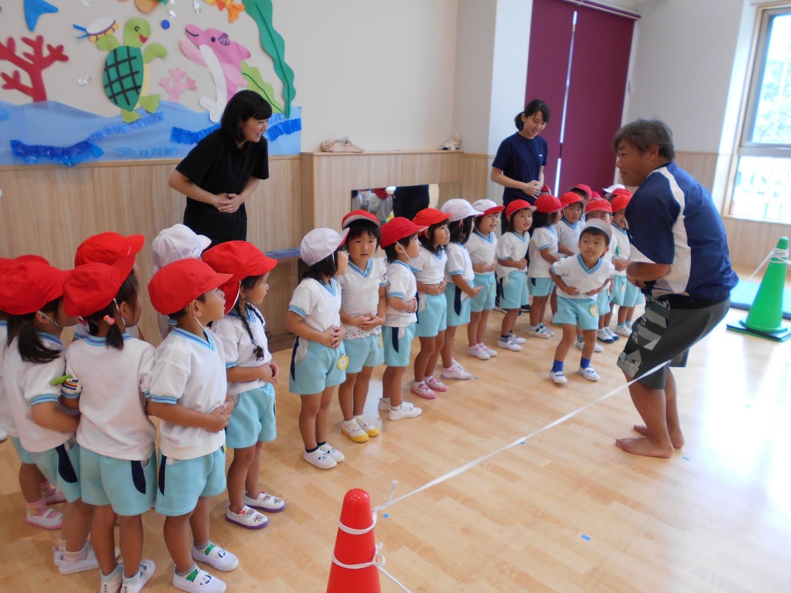 今日は、ホールでサーキット。たんぽぽさんは”ぶたのまるやき~”