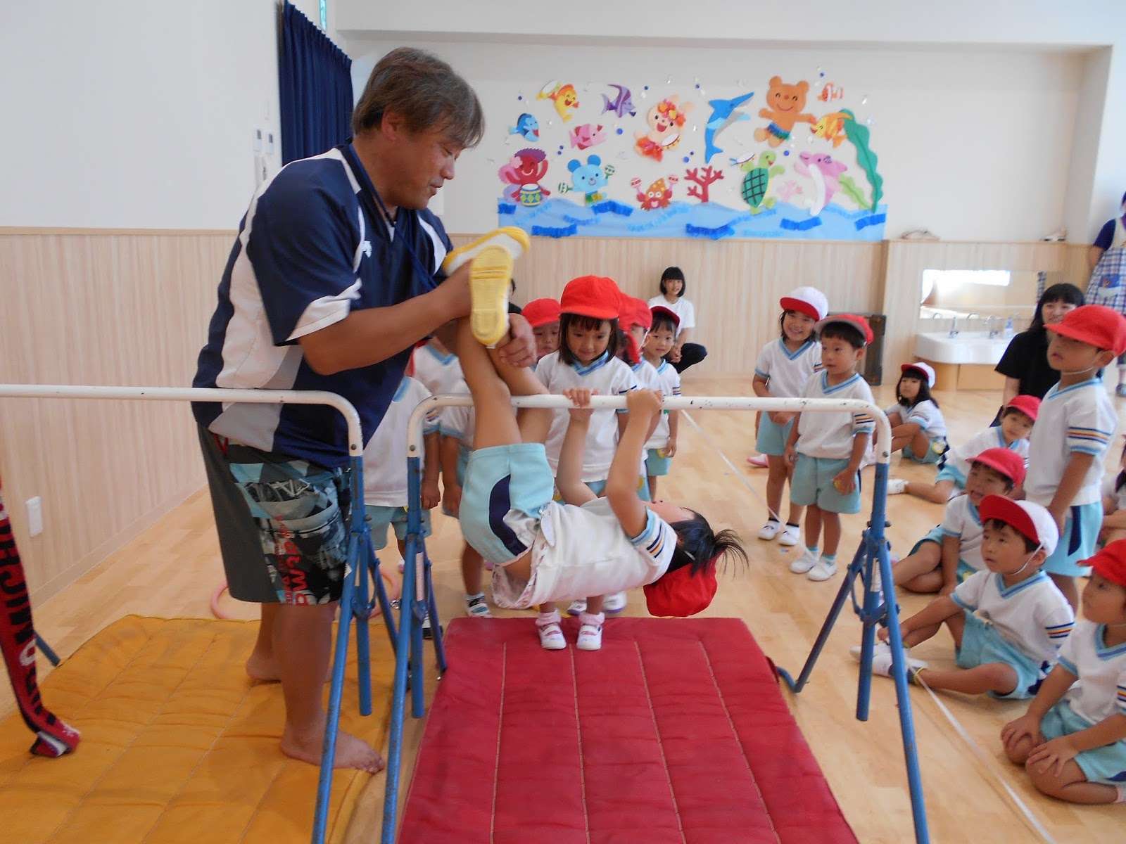 ゆりさんは、鉄棒の前まわり。おなかとおへそを”チュッ”と棒につけて~、ん~できるかなあ~ガンバレ!