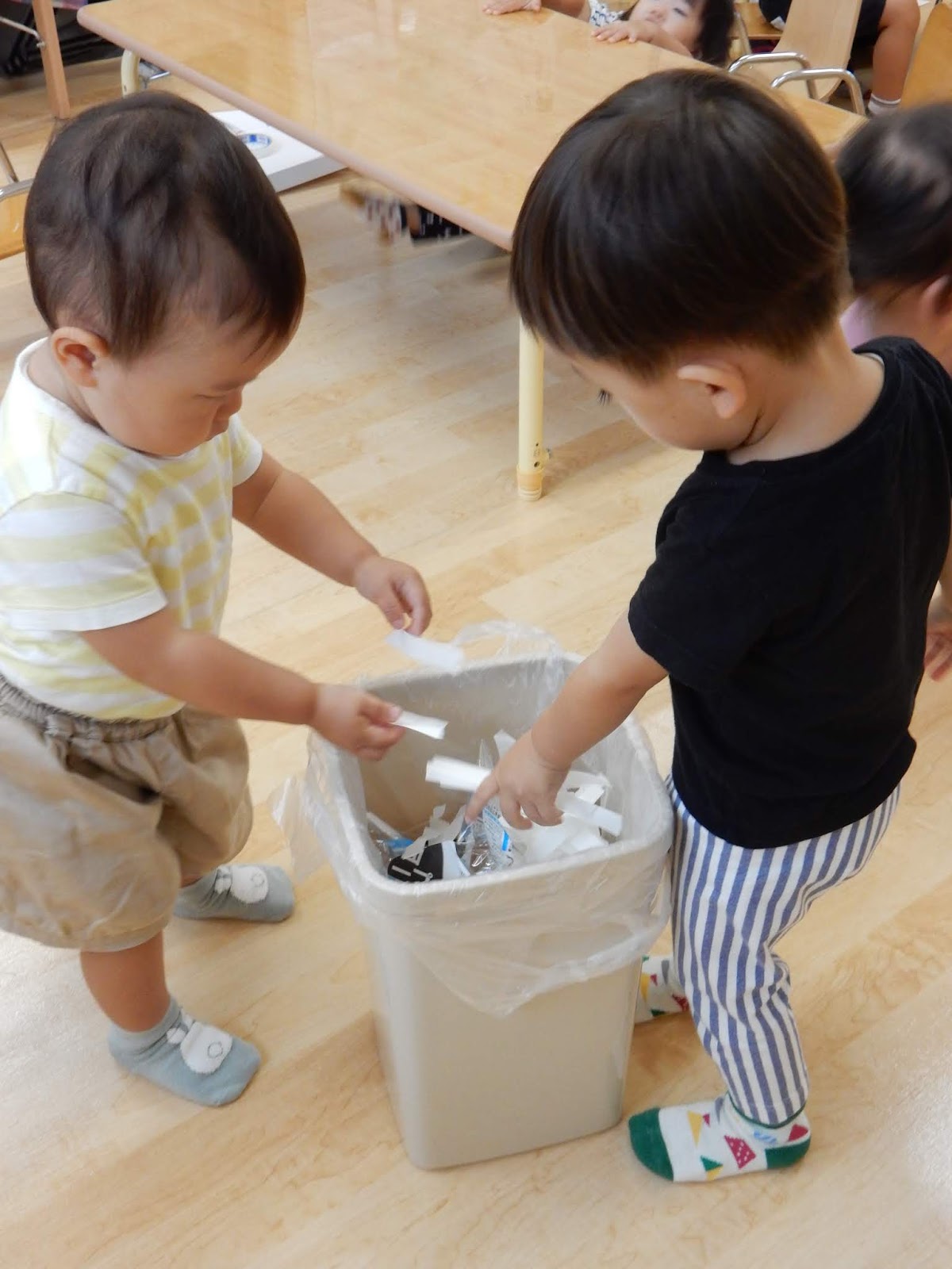 お片付けも自分たちでできますよ!両面テープのゴミを集めて拾って…ゴミ箱へポイ!!