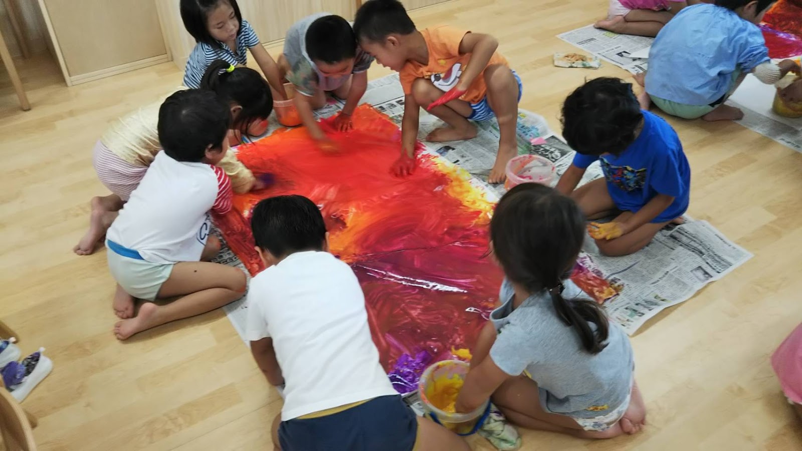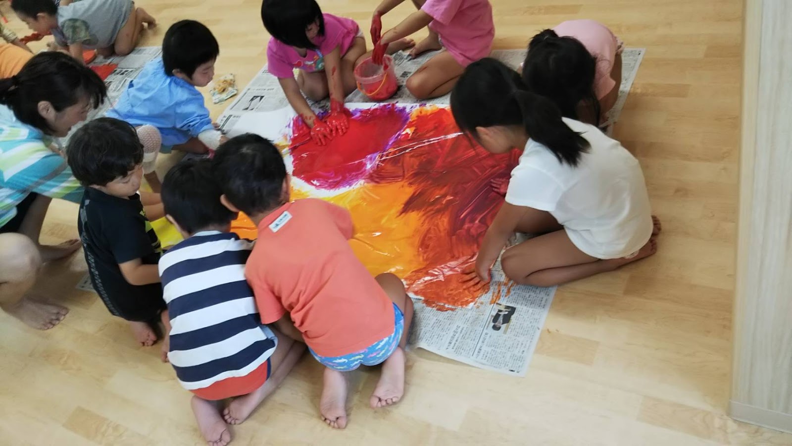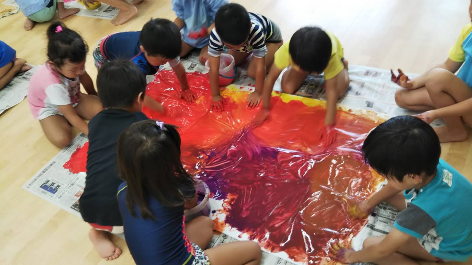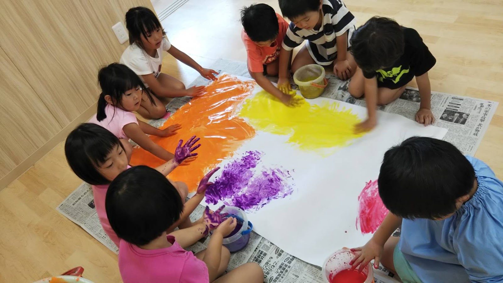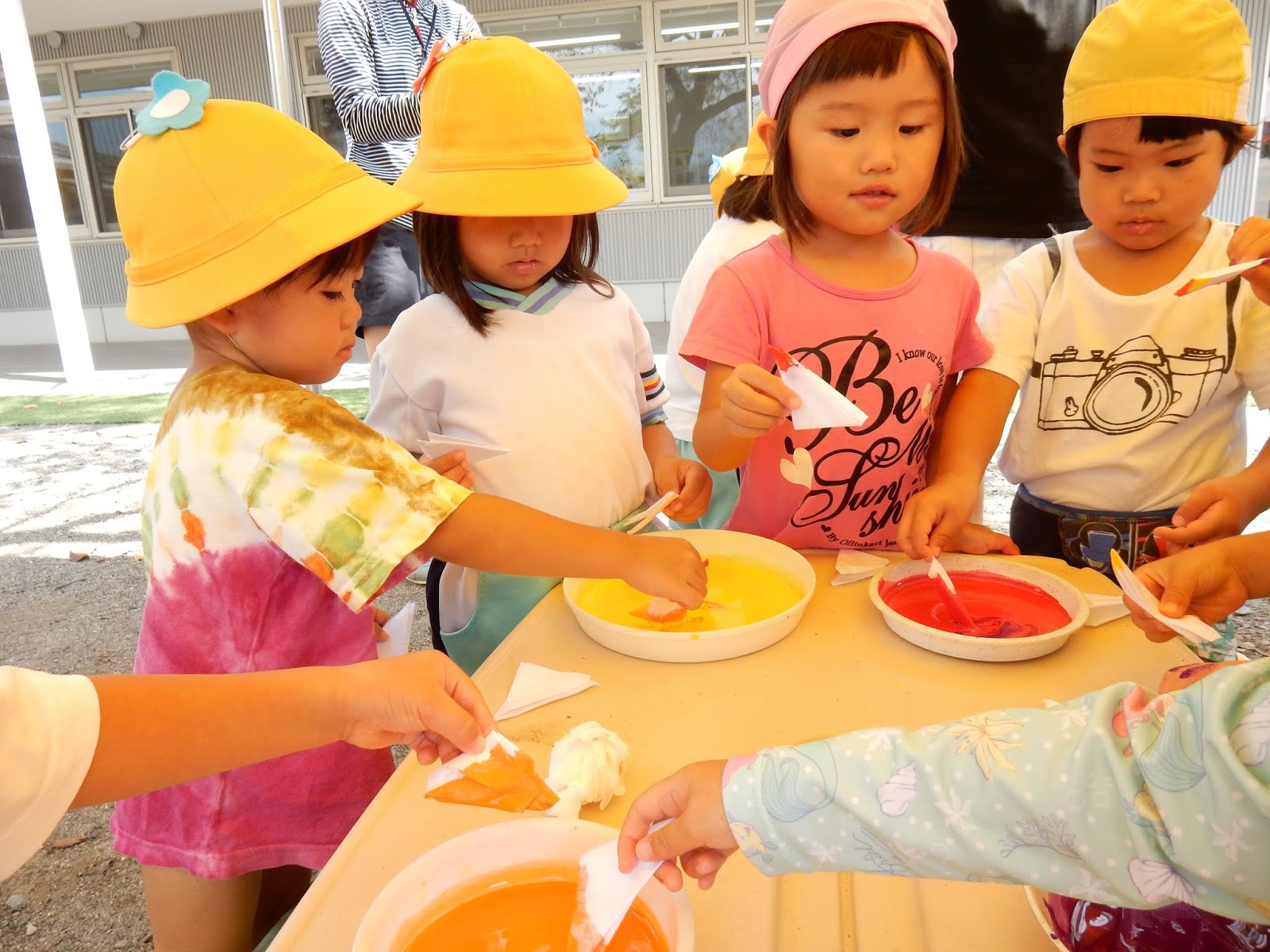 3つの角に少しずつ違う色をつけていくお友達。好きな色の絵の具の入れ物に、大胆に髪を突っ込むお友達。全部の色を使いたくて、どんどん色を重ねていくお友達…大きいクラスのお友達と違って、まだ“こうやったら、きっとこうなる…”という予想がつきにくいたんぽぽさんの年齢だからこそ!の仕上がりになったように感じます。どんな出来上がりになっても、全部正解!先生が開いてくれた紙を見守りながら満足そうな表情を浮かべるみんなが印象的でした。