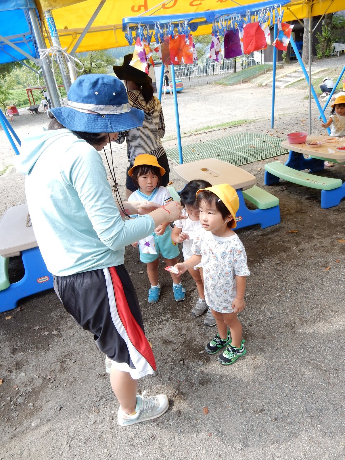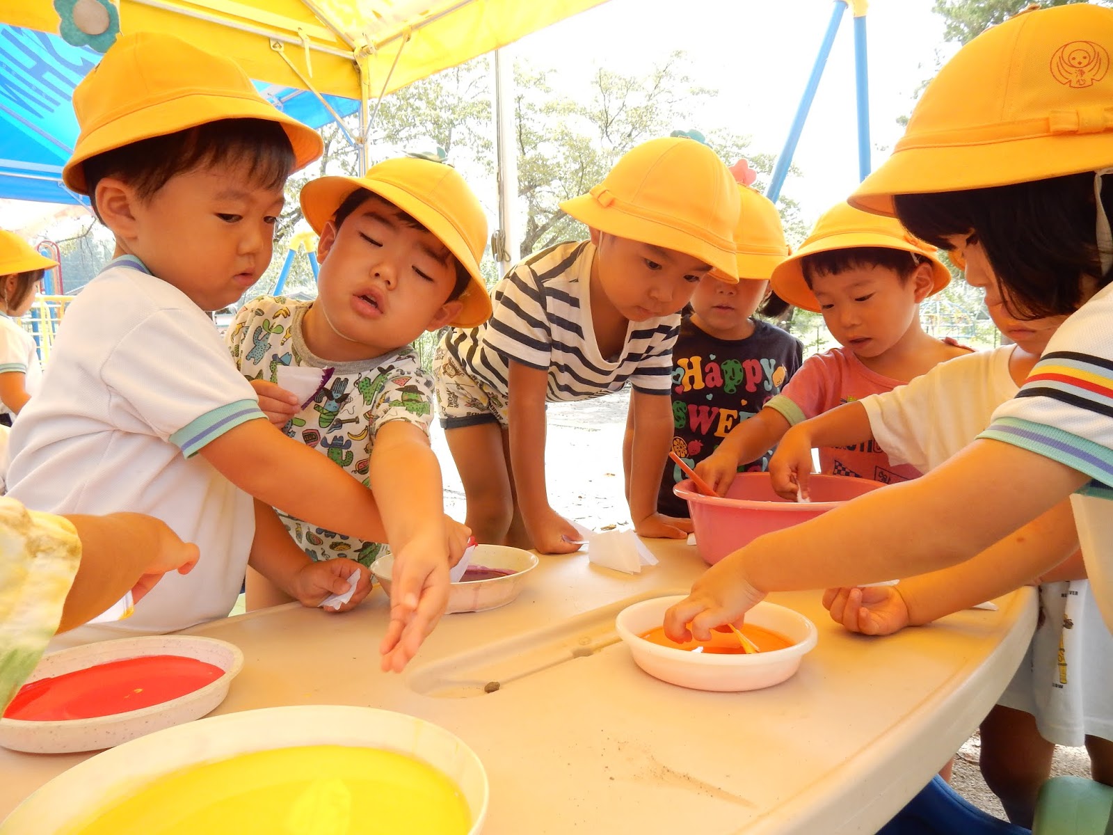 たんぽぽさんが、障子紙を染めていました。三角に折った紙を両手に持って、嬉しそうに外に出てきたかと思ったら、何色か用意された絵の具の前はすぐにお友達でいっぱいに!!