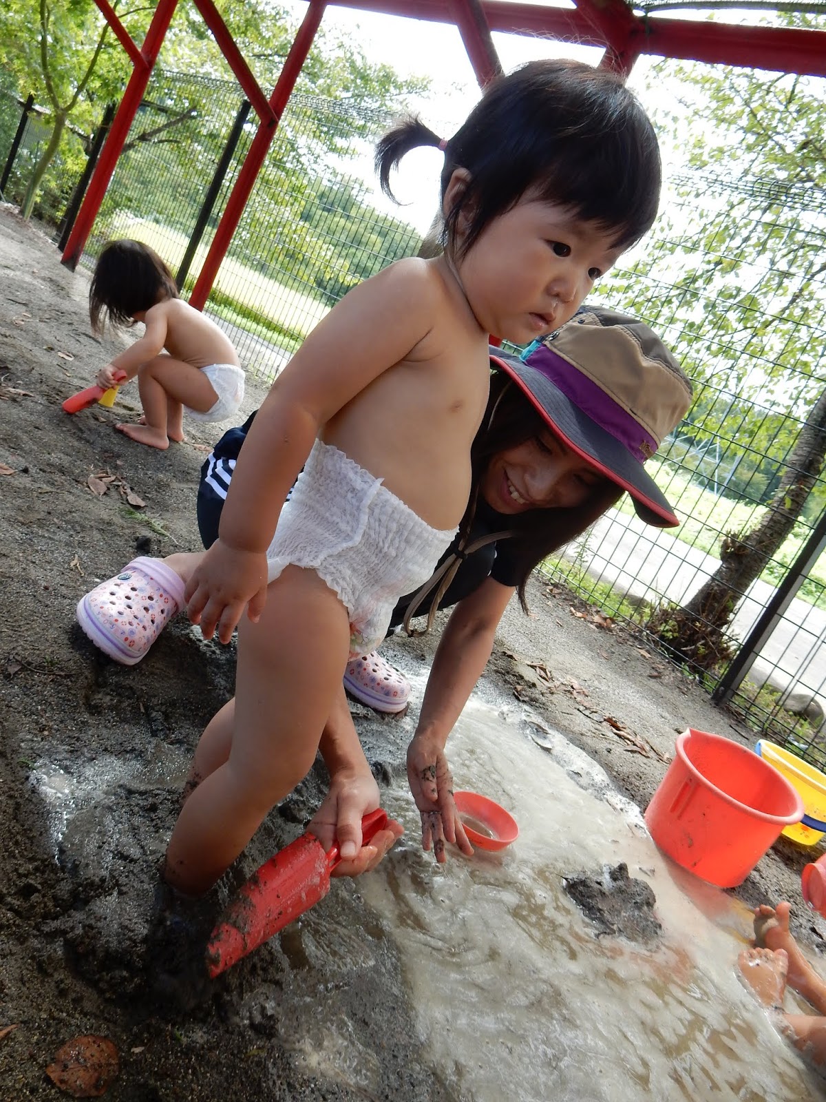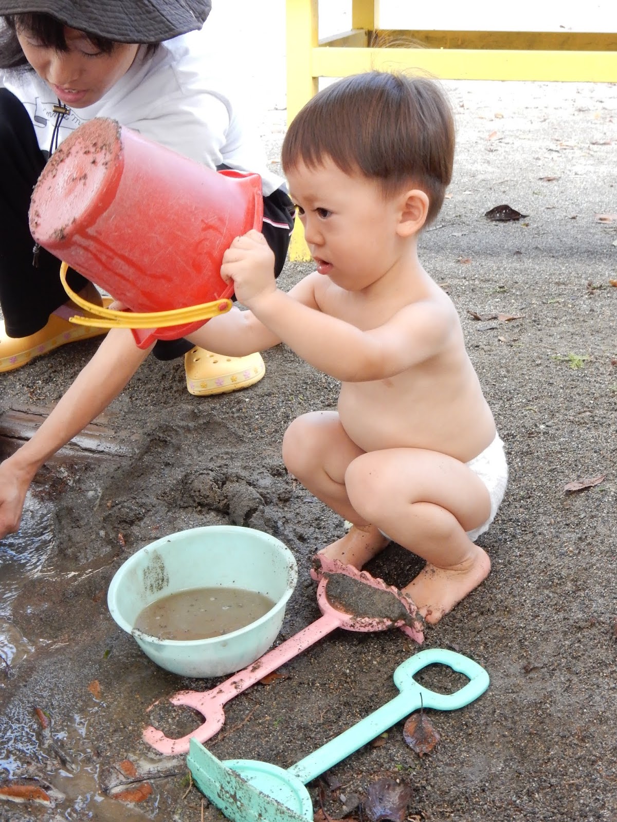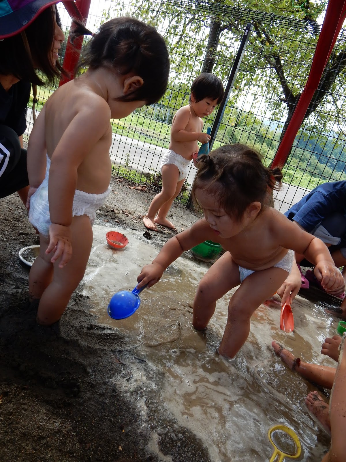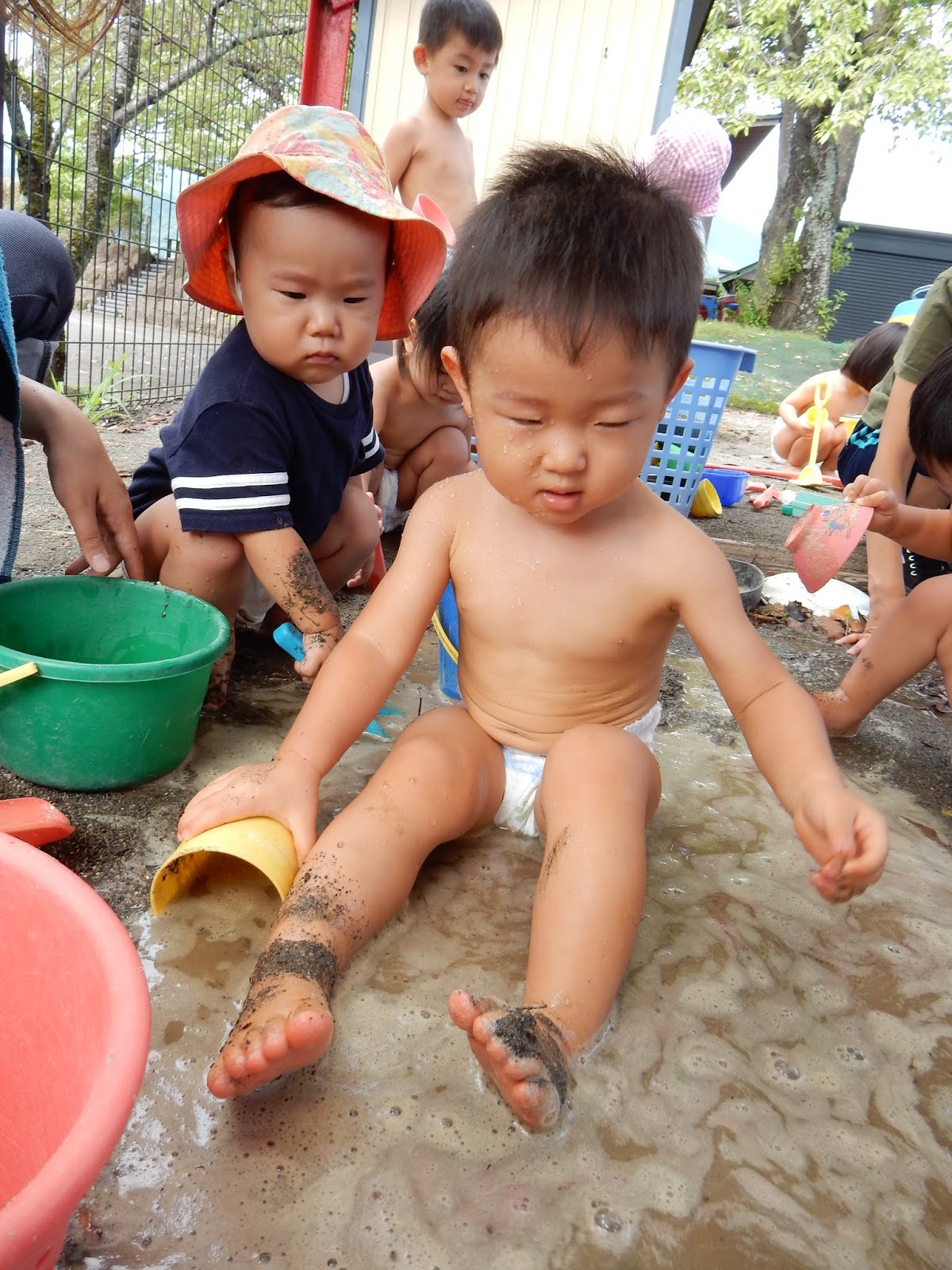 ひよこさんも、泥んこをして遊びました。最初は、裸足で歩くのも恐々でしたが、慣れてくると、泥んこの中にお尻をつけて見たり、足を埋めてみたりと、楽しんでいましたよ!いろんな感触を実際に感じる事で、様々な感覚が身に付き、それが、ことばの理解へもつながっていきます。冷たいね。サラサラだね、うわ~ドロドロ!!いろんな会話を楽しみながら、ことばの数を増やして行くひよこさんです。