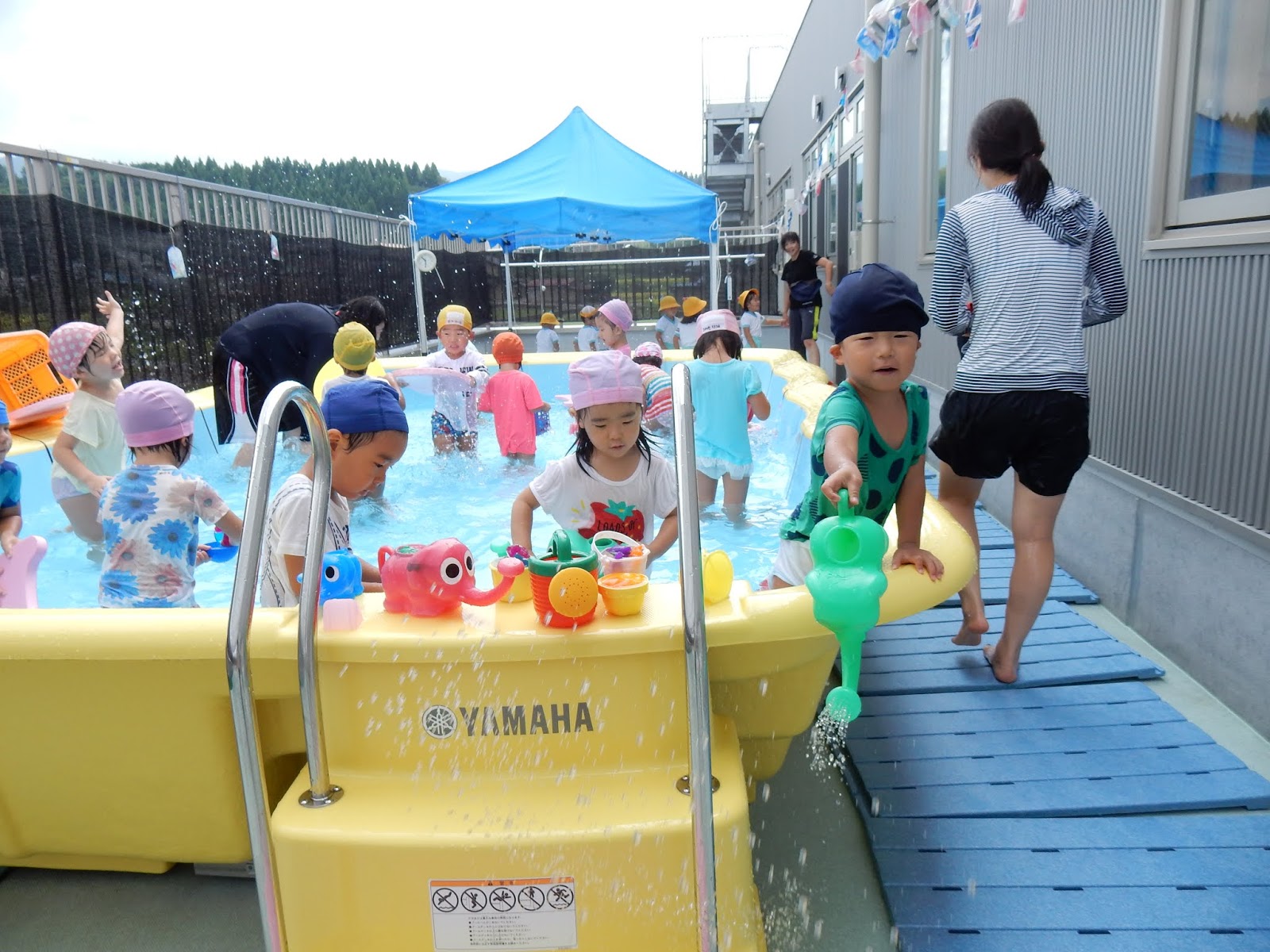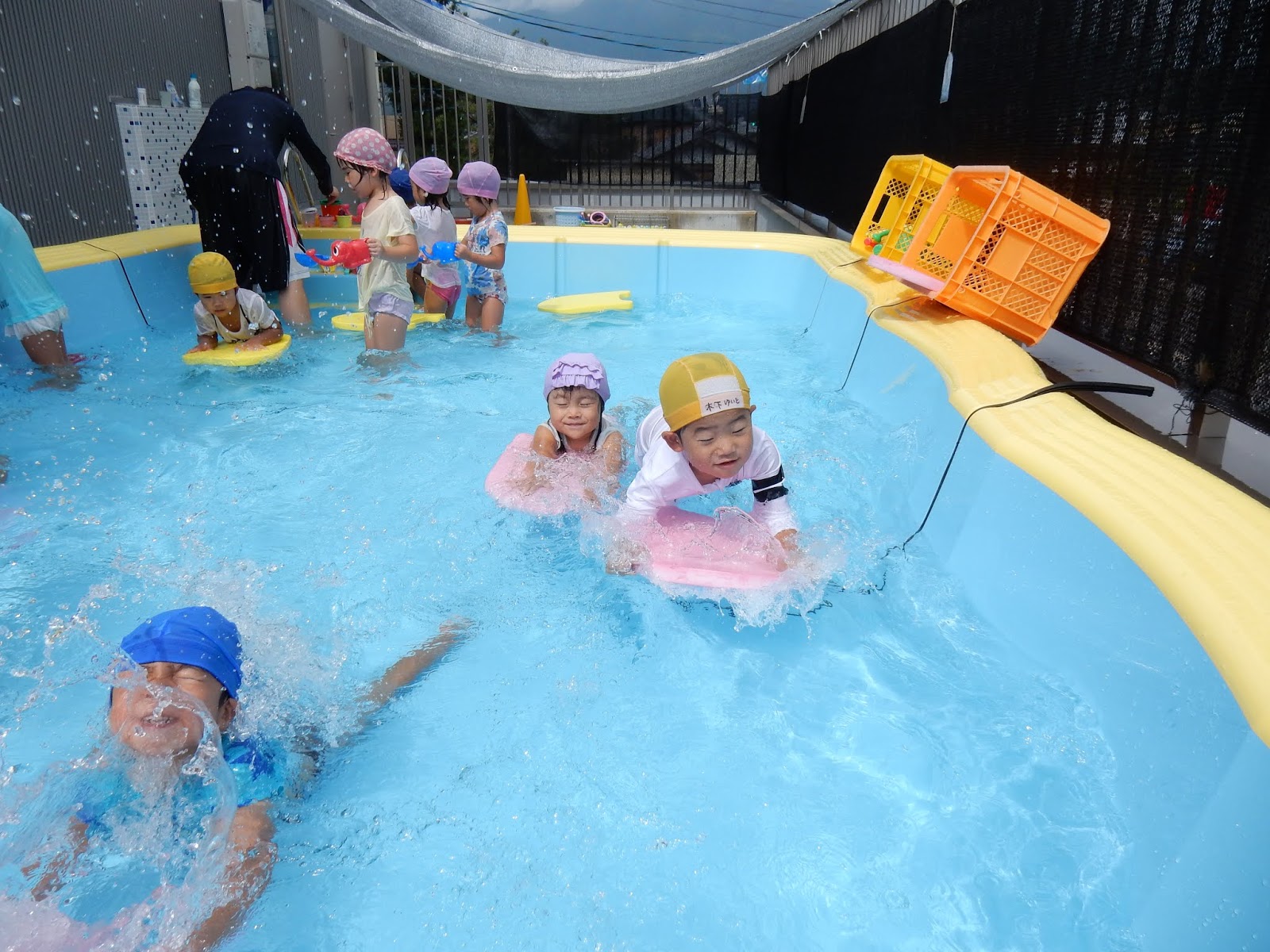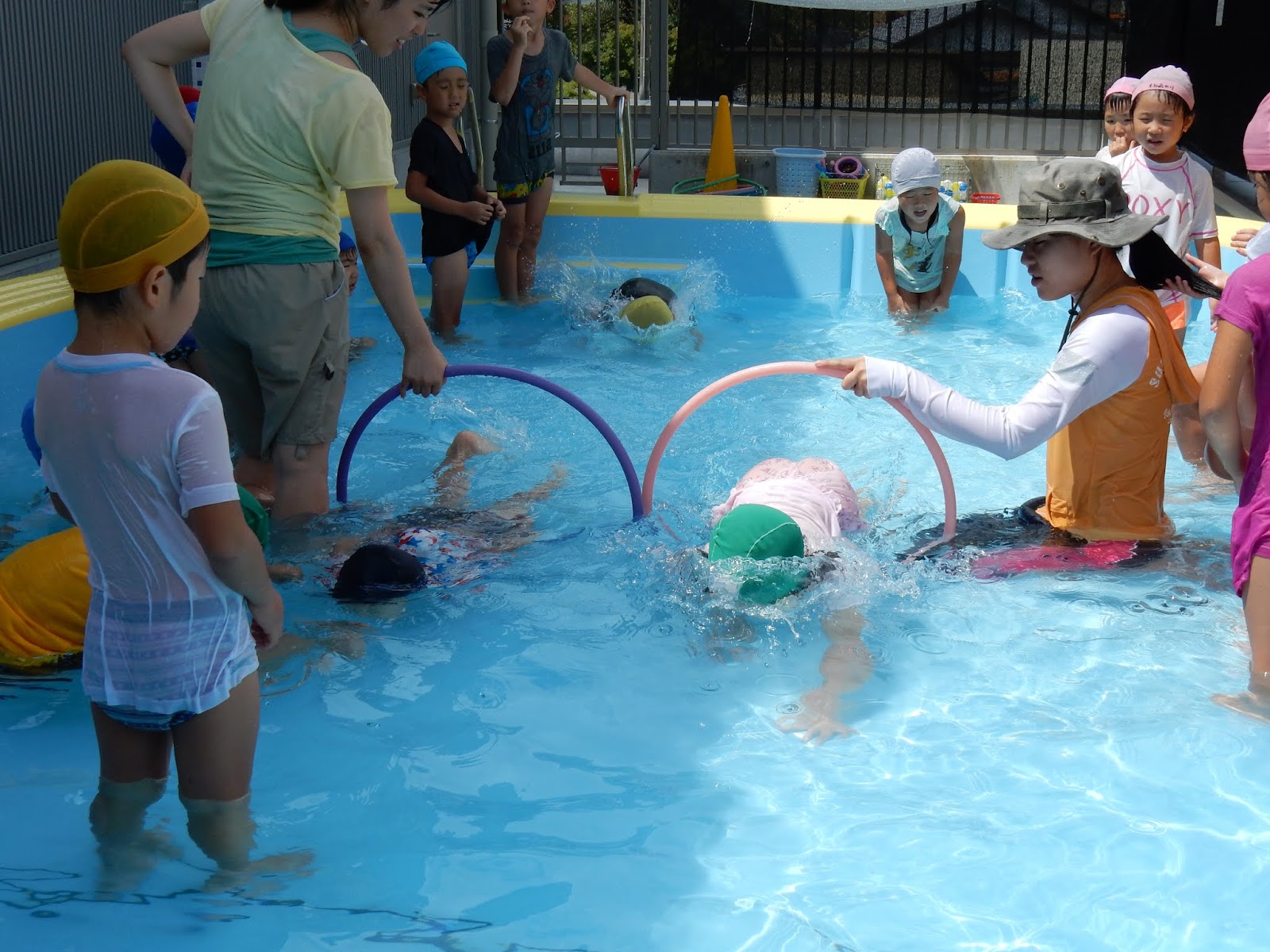 6月のプール開きから約2ヶ月。最初は寒くて、プールの外で遊んでいたお友達も、暑い日差しの中で徐々に自ら出ている時間が短くなり、またおもちゃ遊びが中心だったころに比べ、ビート板で泳いだり、水の掛け合いをしたり、遊びもダイナミックになって、最後には、プールが狭く感じるほどに。
