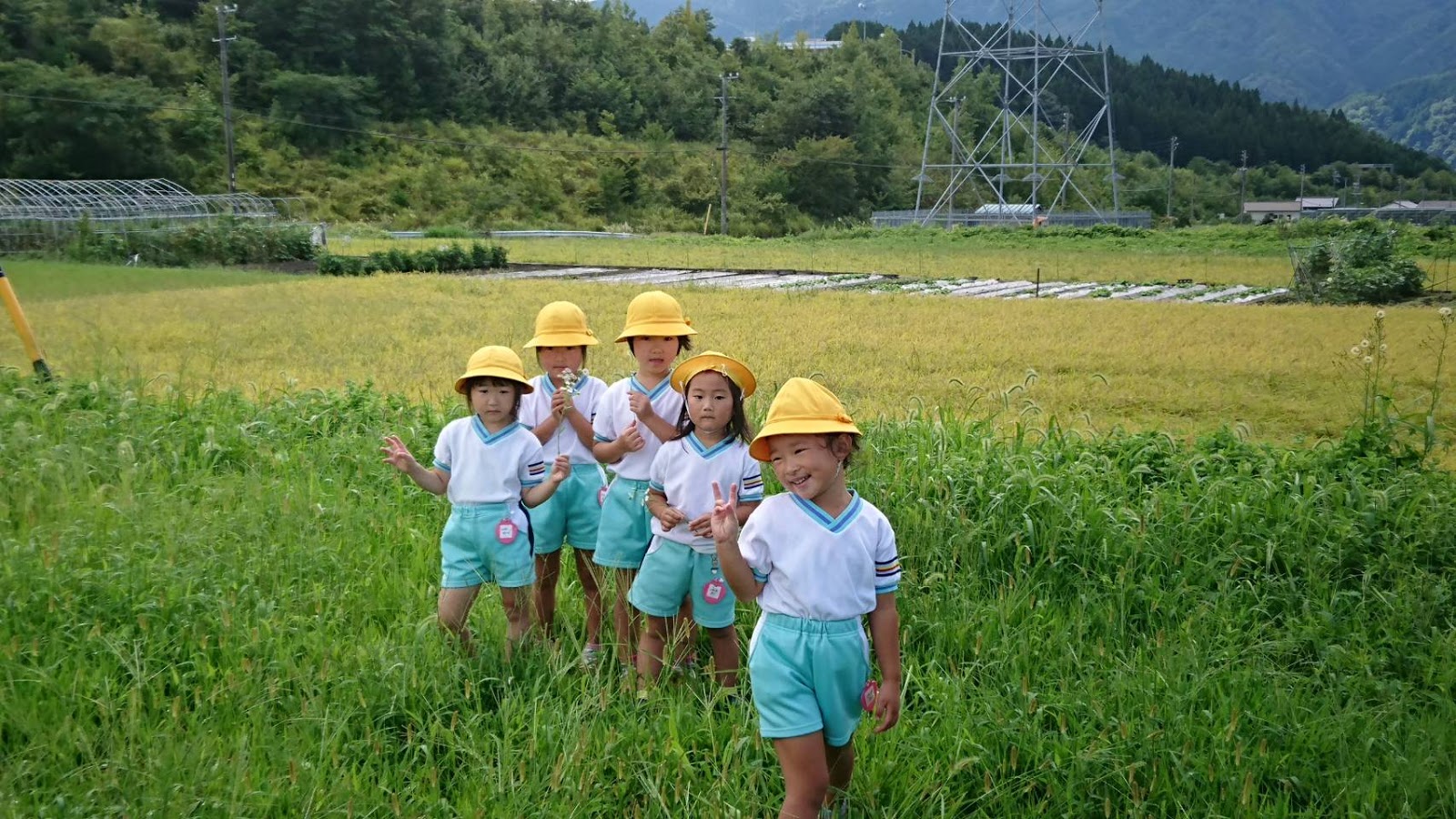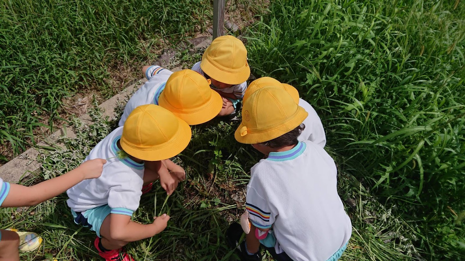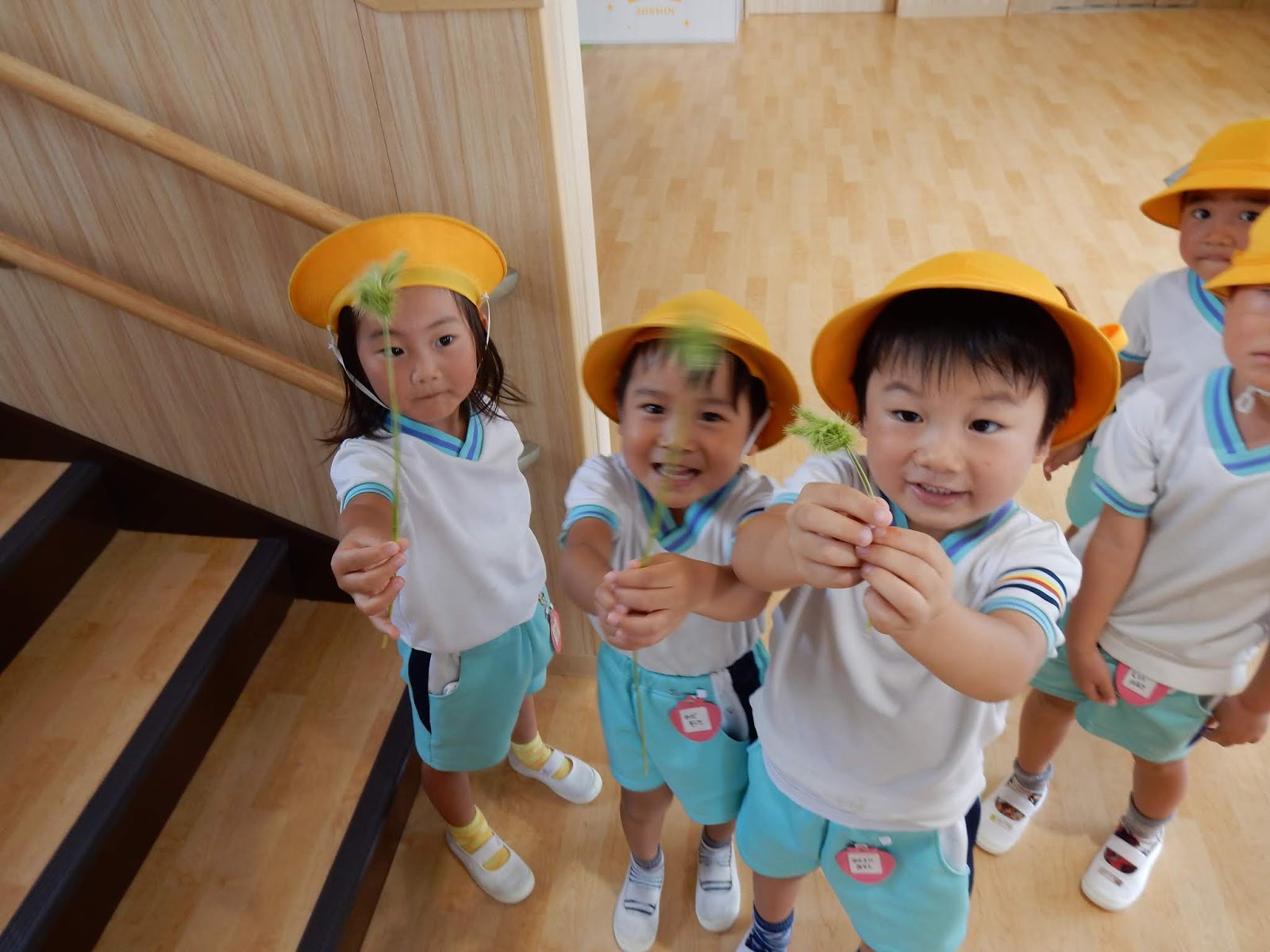 お散歩に出かけたゆりさんから届いた写真です。園庭近くの草っぱらに遊びに行くと、力いっぱい走り回ったり、ねこじゃらしを見つけたり。2本のネコジャラシをくるりと結ぶと、かわいいウサギさんができますよ♪
