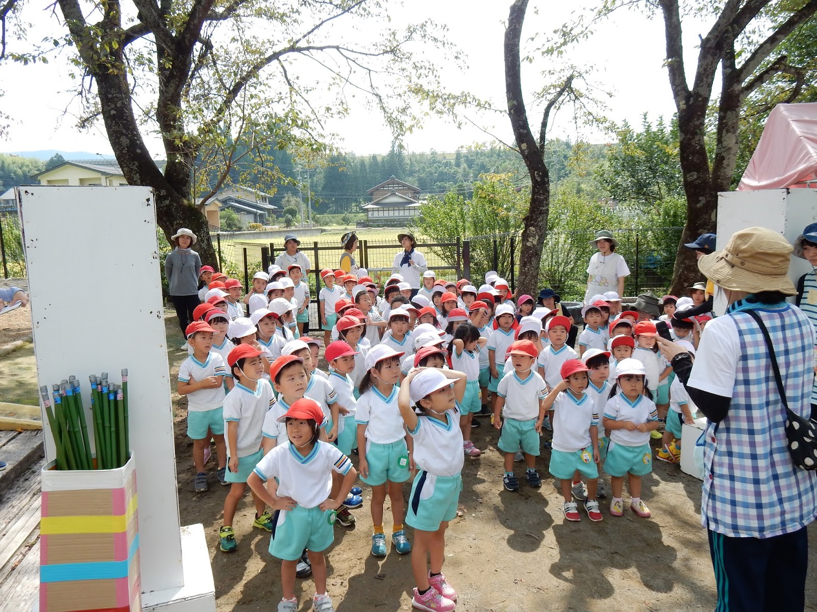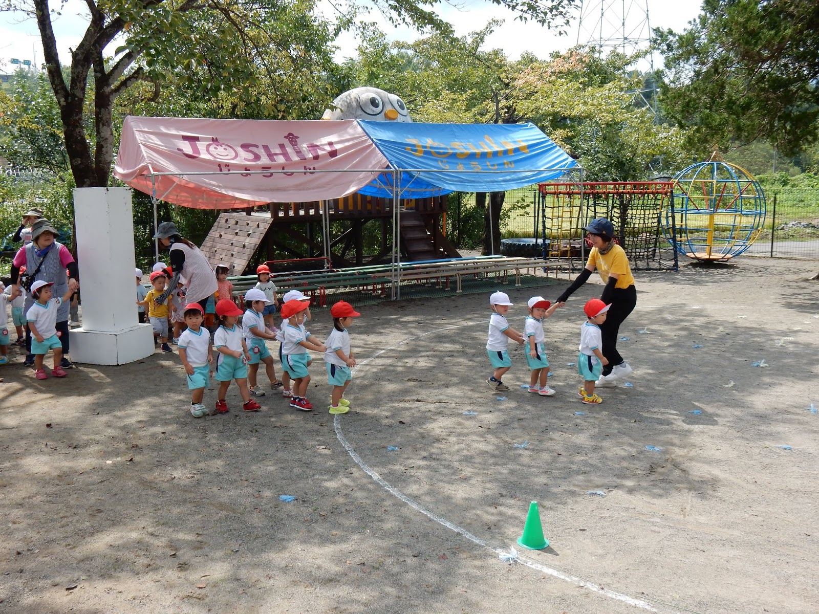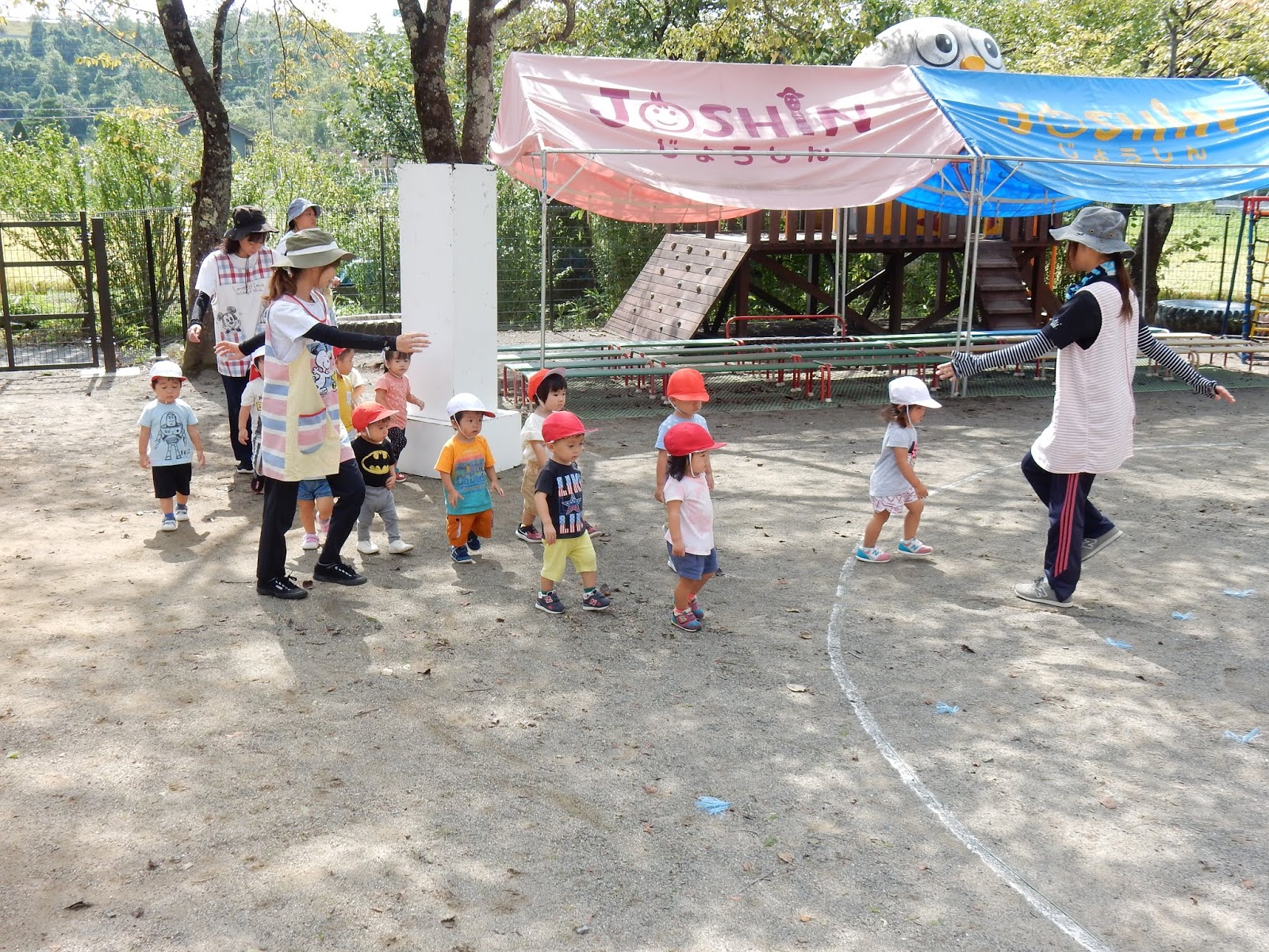 赤白帽子をかぶってみんなが入場門に整列すると、運動会らしい雰囲気です!ちいさいクラスのお友達も、先生について歩いて行く姿が可愛らしいですよ♪