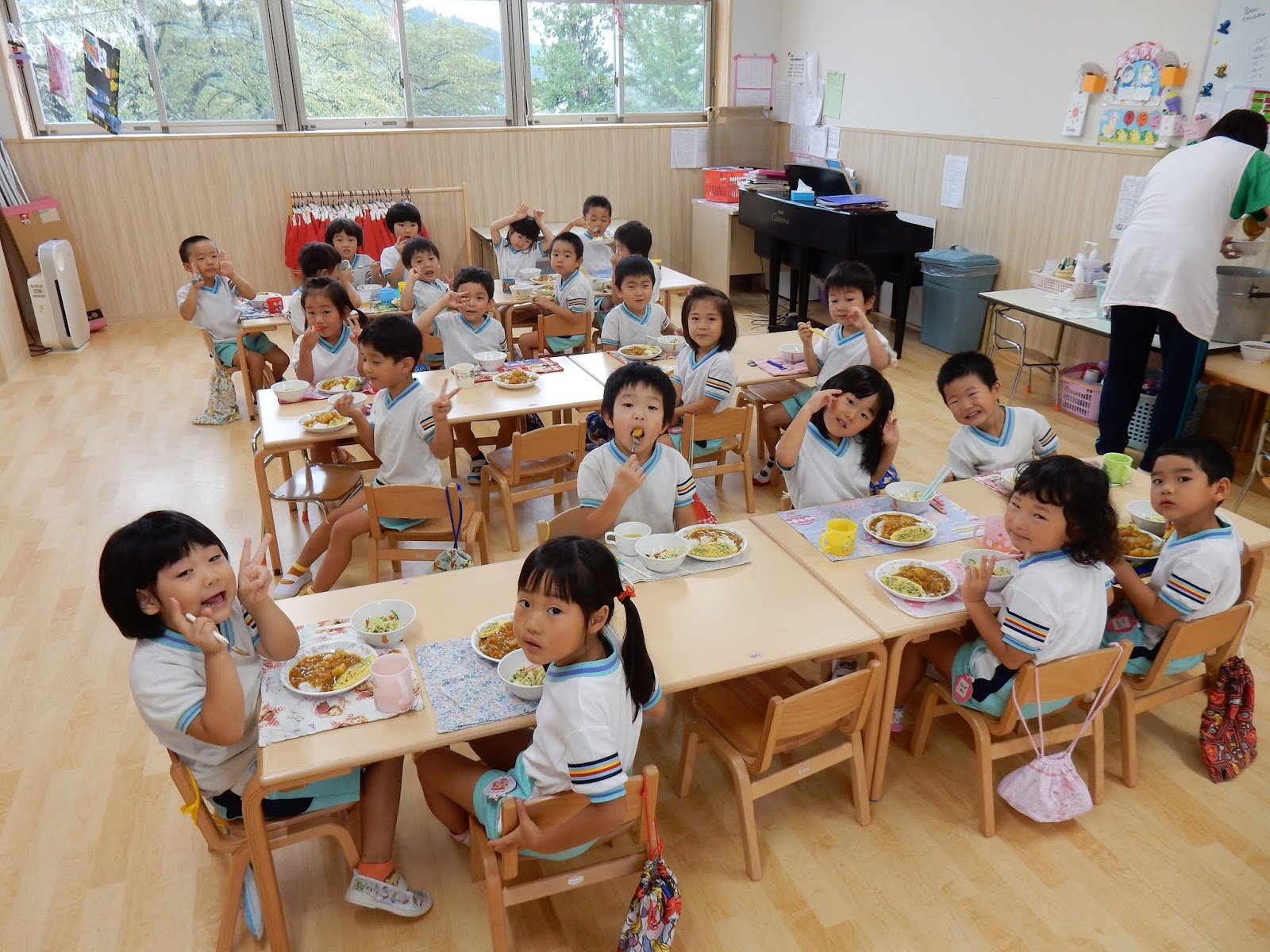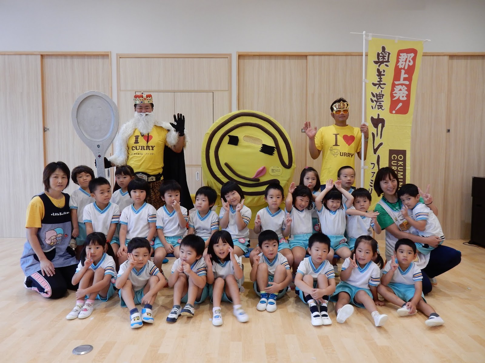 カレーの王様のお話を真剣に聞くみんな。カレーの中には、沢山のお野菜が入っていて、とっても栄養がある事。カレー以外にも、美味しい食べ物はたくさん!これから、運動会で頑張るためにも、毎日たくさんご飯を食べようね!というお話に、『はーい!!!』と元気に答えていました。