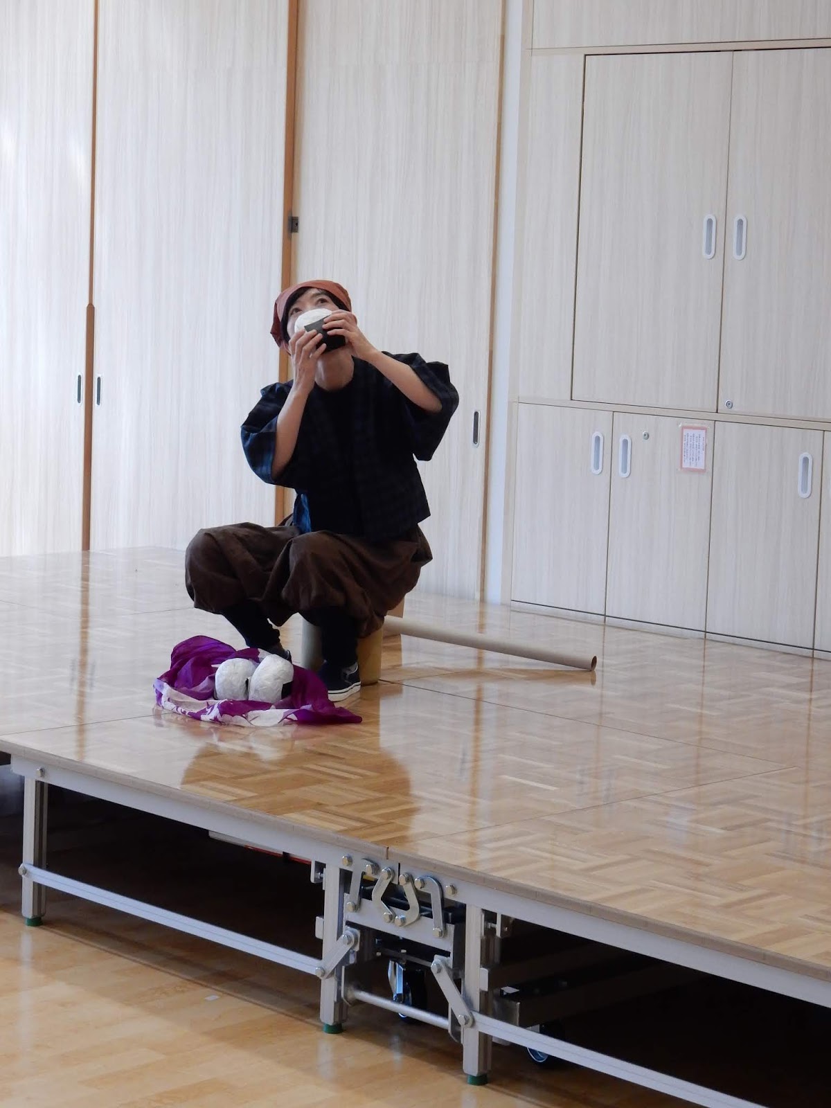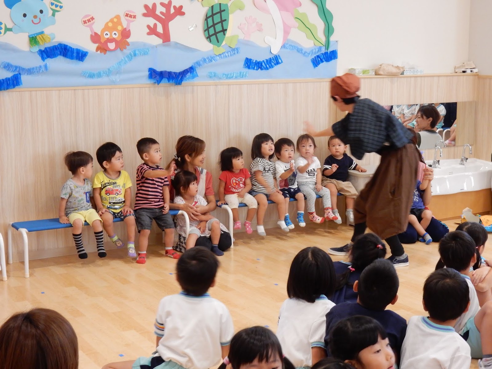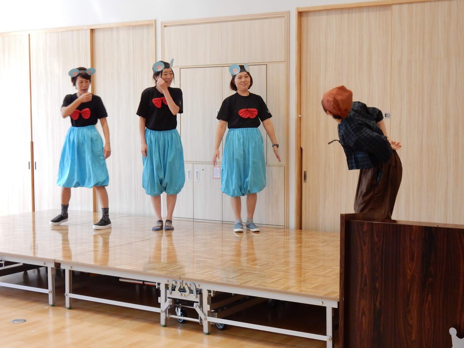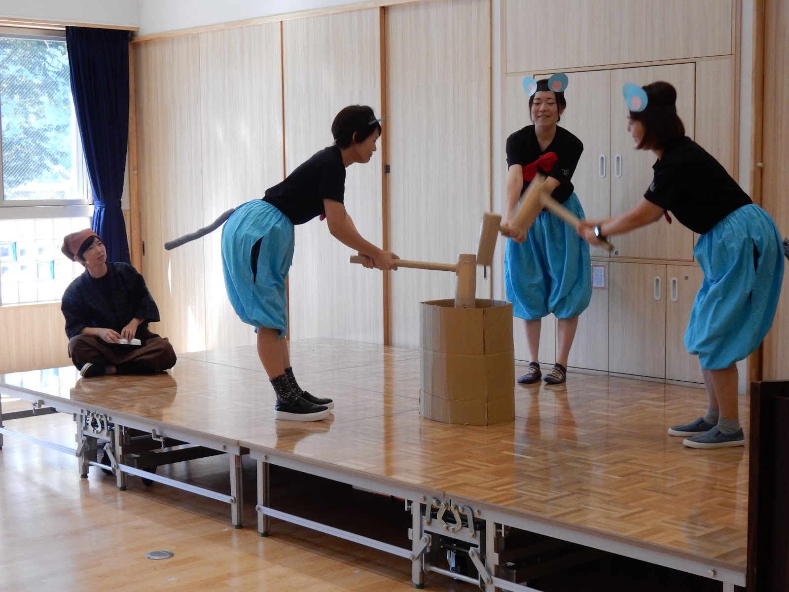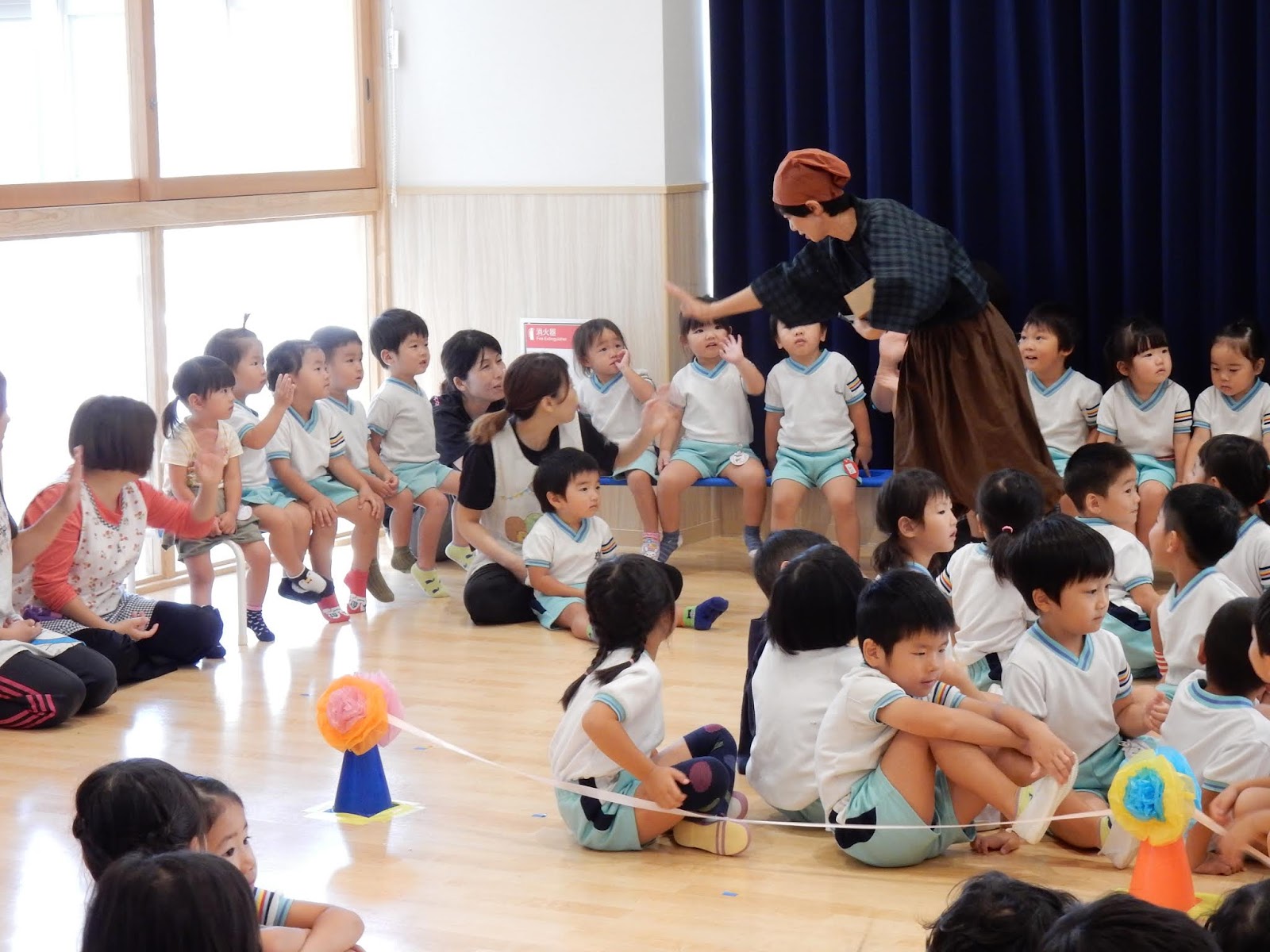 今月の、先生達からのお話のプレゼントは、“おむすびころりん”でした。おじいさんの食べていたおにぎりが、穴の中へころりん!!すると、何とも楽しそうな歌声が聞こえてきます。その声を聞いて、思わずおじいさんも、穴の中へころりん!!!そこは、ネズミの国!かわいらしいねずみさんと、踊ったり、歌ったり、楽しい時間を過ごしたおじいさんでした♪お部屋の先生の変身した姿に、大興奮!の子ども達。いっぱい笑える楽しい劇でしたね!