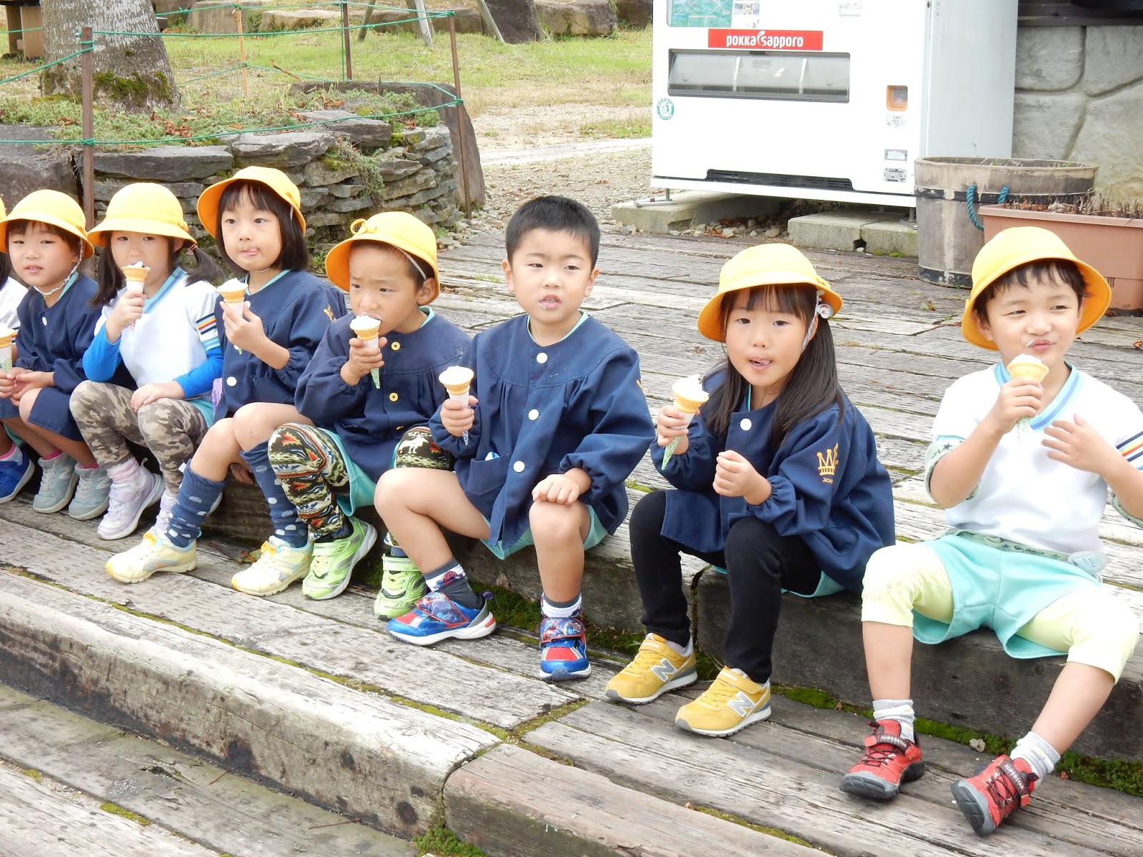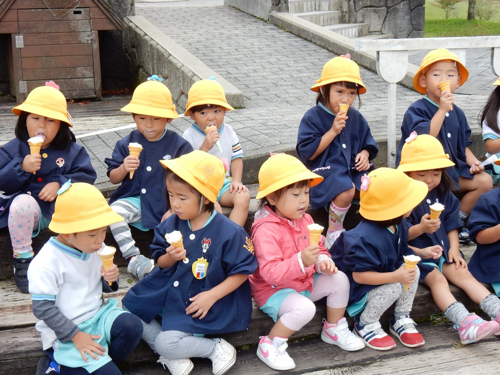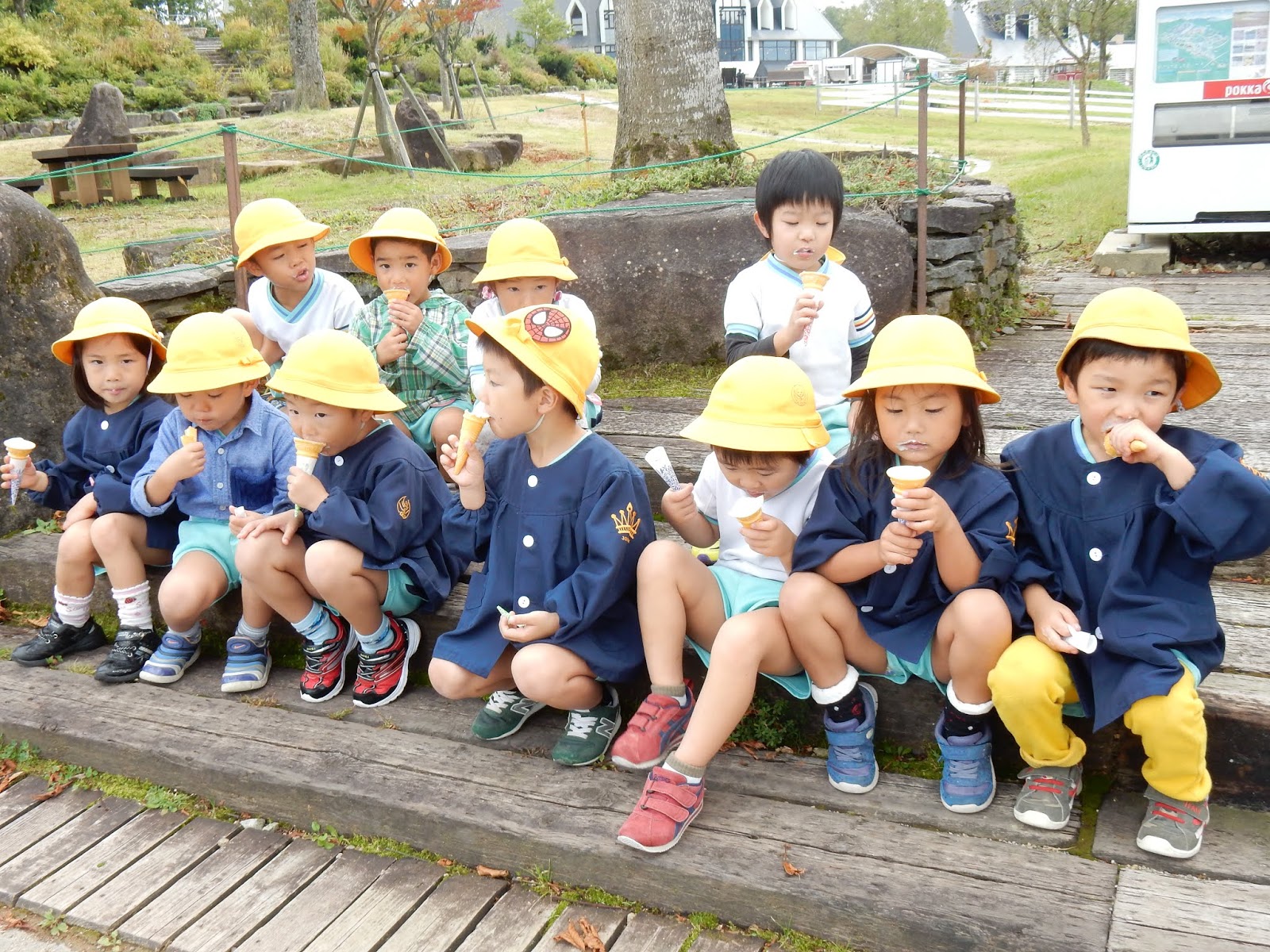おやつに食べたソフトクリームは、お弁当の後でしたが、みんなペロリと食べてしまいましたよ!お口の周りの真っ白なお髭も可愛らしいポイントです♪お昼寝をしに先に帰ってきたすみれさんや、ひよこさんも、おやつには牧歌の里で購入したヨーグルトをいただきました!