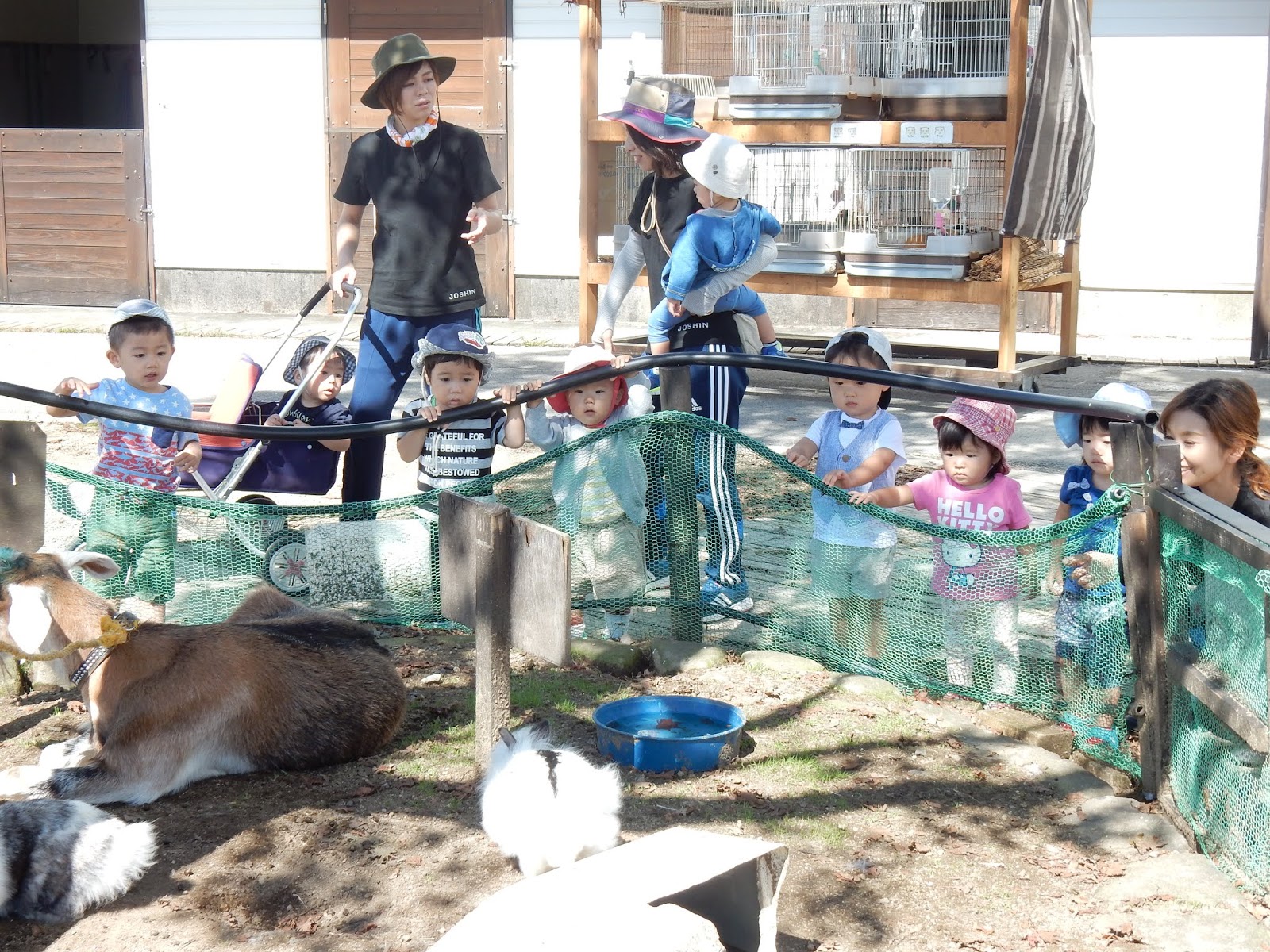 きぼっくり館を見学したり、ロードトレインに乗った後は、お待ちかねの動物触れ合いコーナーへ。小さなウサギやモルモットには、すみれさんや、ひよこさんも触ってみることができました。ふわふわで、暖かい感触に、『かわいい~』という声がたくさん聞こえました。柵の中にいるヤギやウサギに向かって、『お~い!』と話しかける姿や、覗き込む姿は、かわいらしいかったですよ!
