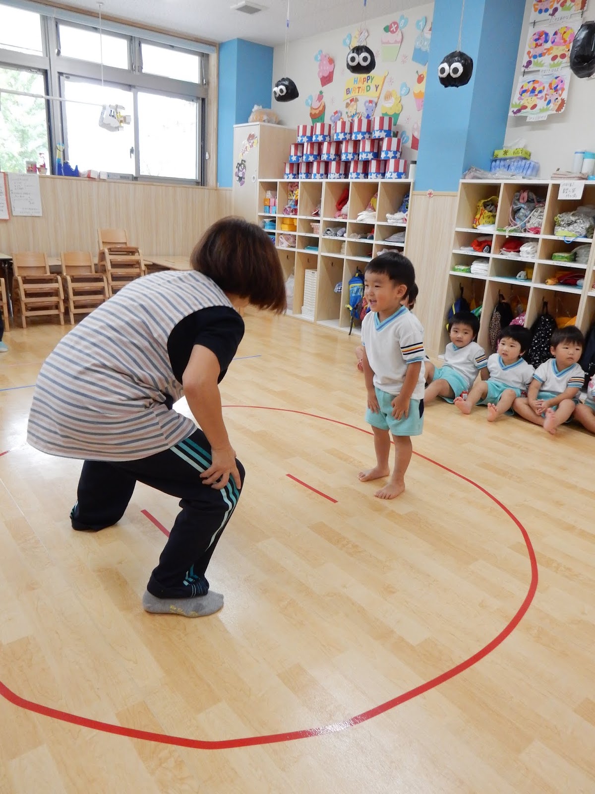 『はっけよーい!!のこった!!!』みんな最初はきょとん…としていましたが、力一杯先生を押して、押して!!!途中、即席の“まわし”も登場して気分を盛り上げます!お友達同士でも、やってみると、押したり、押されたり…こうやってぶつかり合う事も、友達との関わりの中での力加減を知る大切な機会になります。