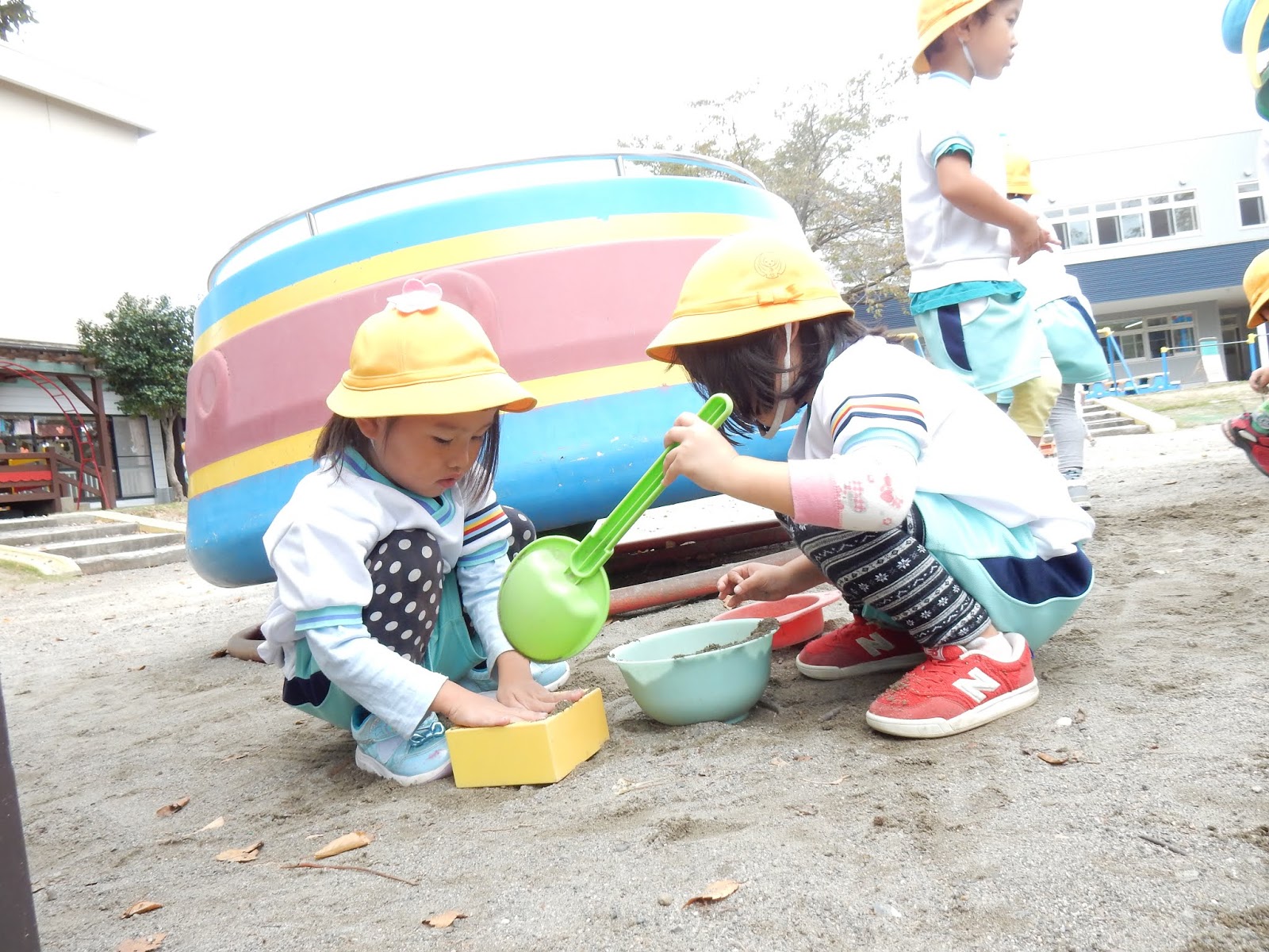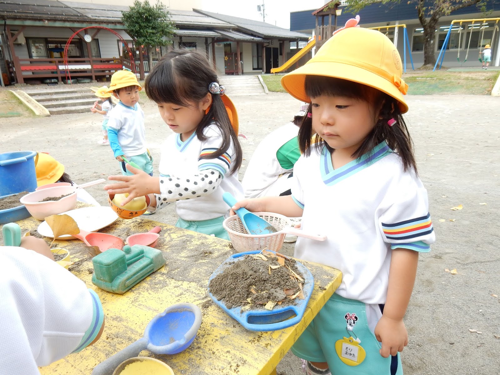 この時期は、園庭に落ちたイチョウの葉や、桜の葉を飾ったり、お散歩先で見つけたお花を使ったり、いろんな工夫を凝らしたごちそうがたくさん並びます。年齢関係なく同じタイミングで遊びやすいのもお砂場のいいところ♫大きい子と、小さい子が、自然に交流出来るので、貸し借りを見る場になったり、教えあったり…小さい先生♡がたくさんです!