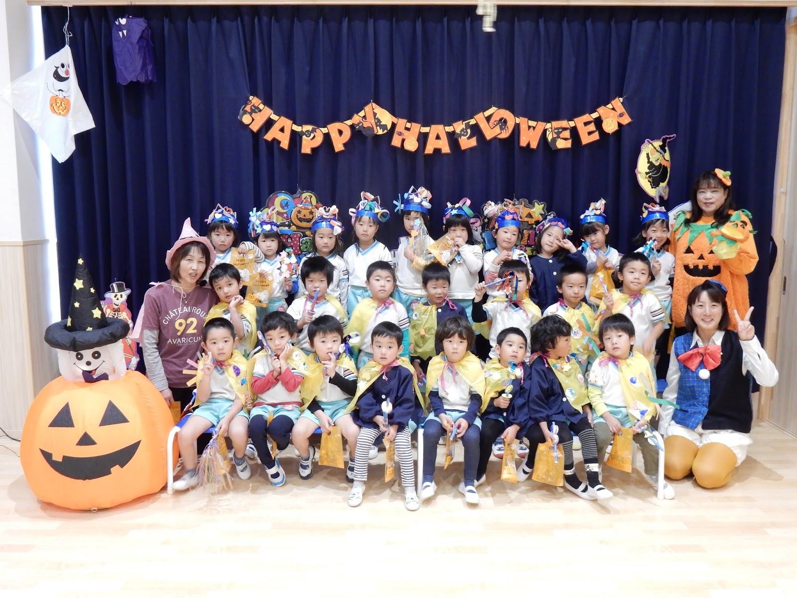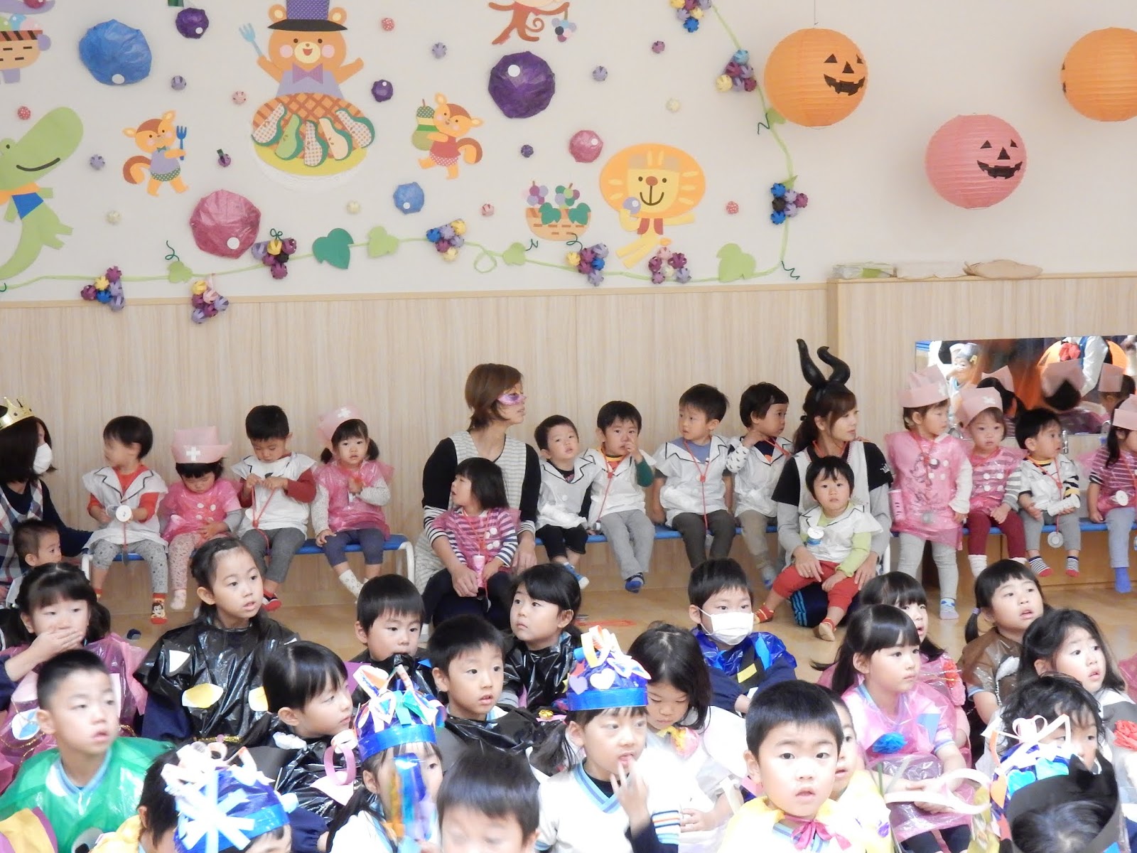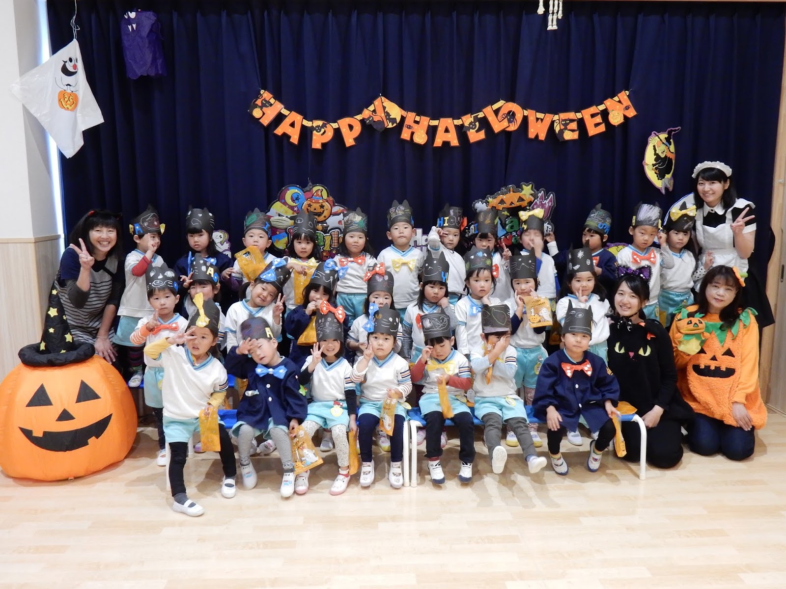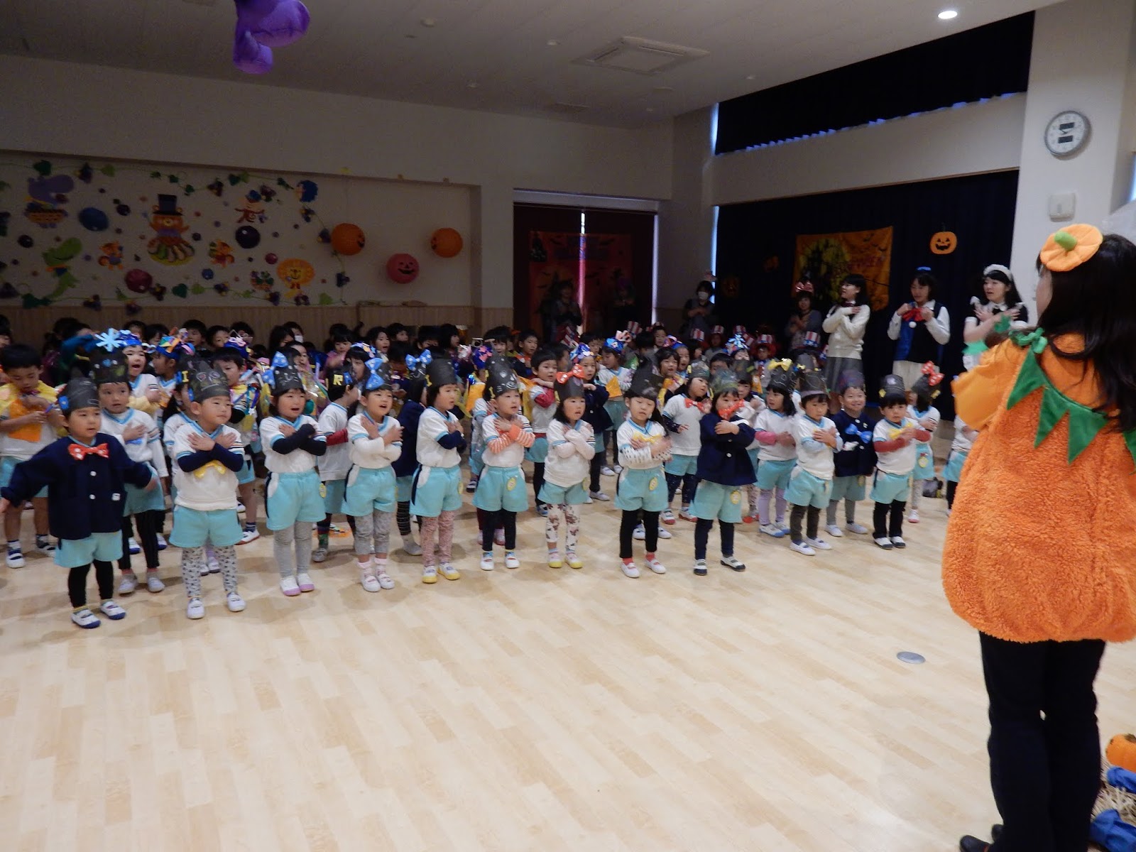 もちろん、仮装もバッチリです!この日のために、各クラスが様々なグッズを用意してきました!そして、ホールもカボチャや、こうもり、おばけなど、いつもとは雰囲気も全然違い、最初に入ってきたみんなは、周りを見回してちょっとドキドキしていた様子。