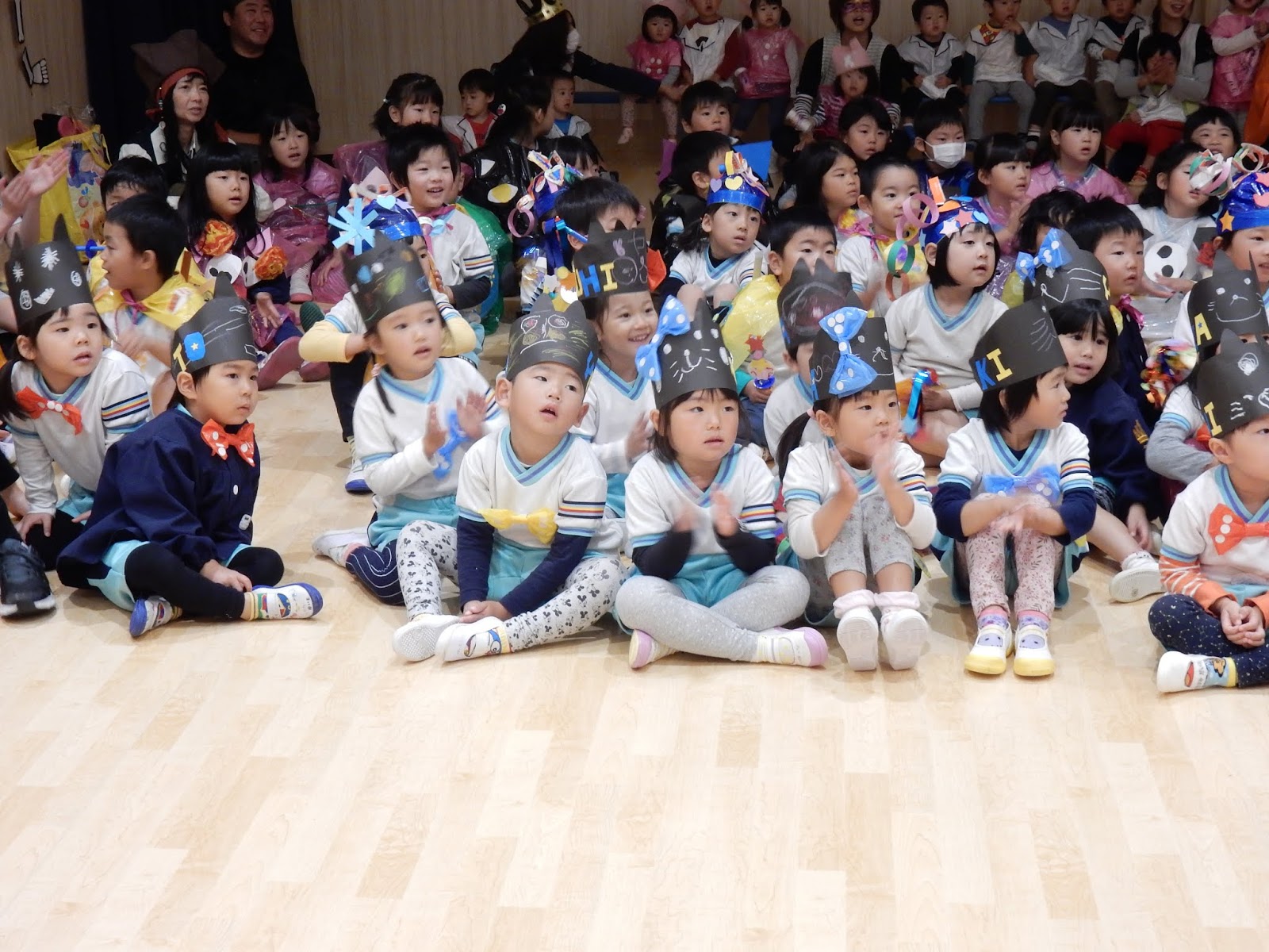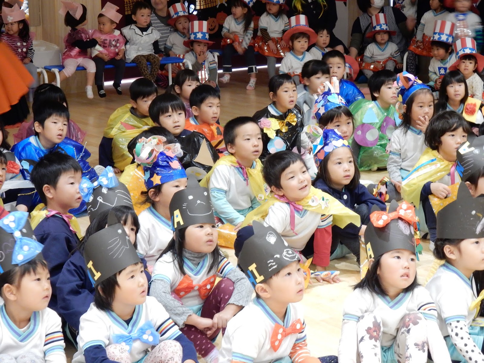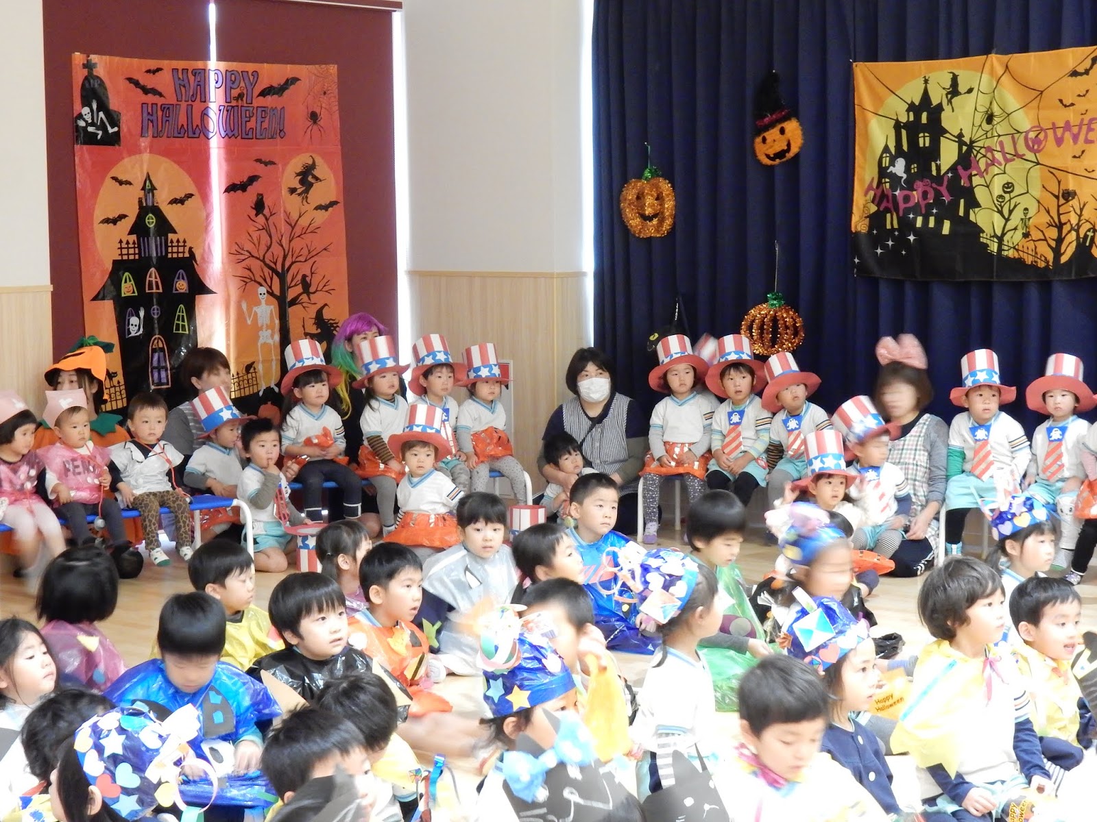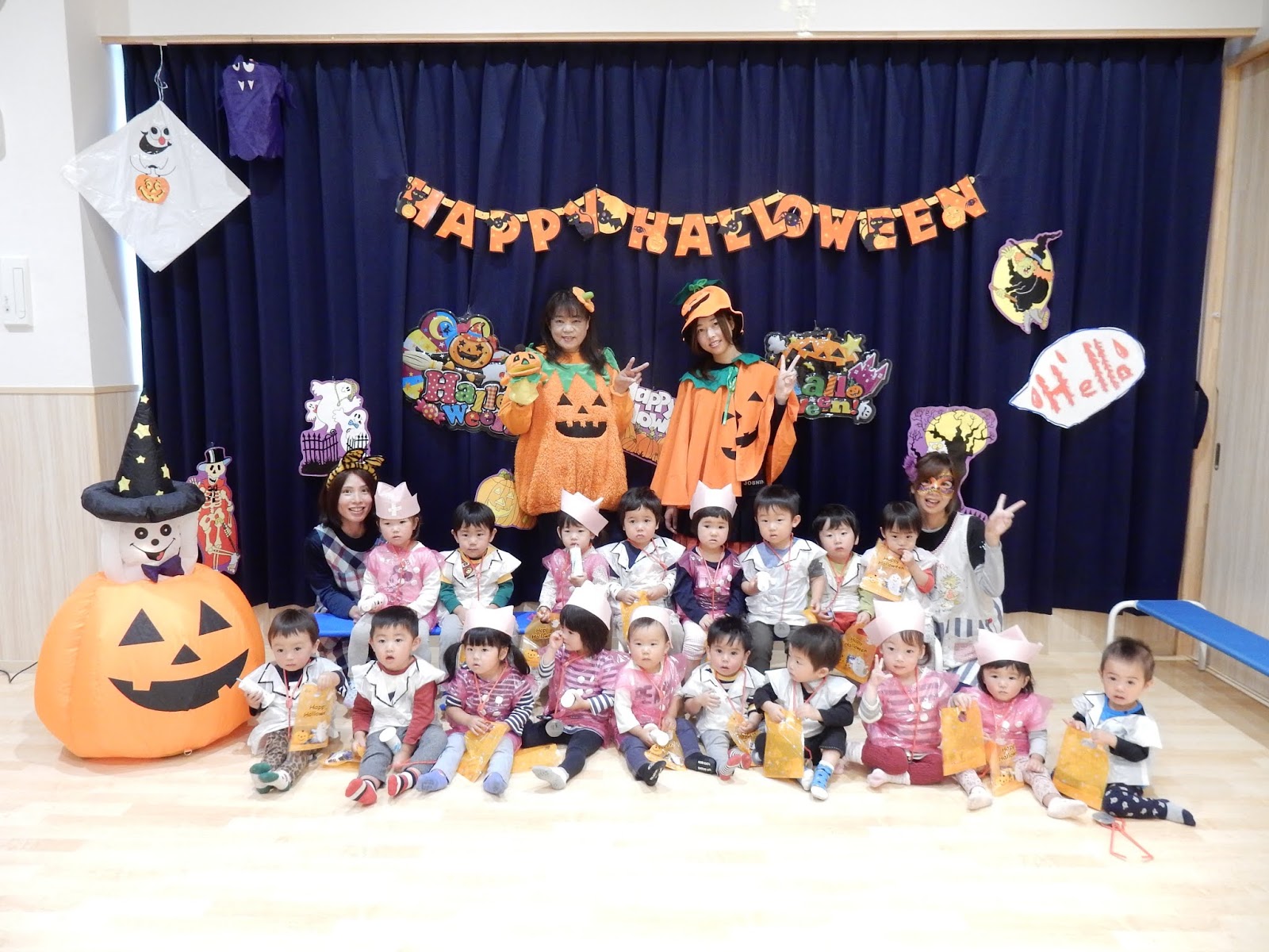 もちろん、仮装もバッチリです!この日のために、各クラスが様々なグッズを用意してきました!そして、ホールもカボチャや、こうもり、おばけなど、いつもとは雰囲気も全然違い、最初に入ってきたみんなは、周りを見回してちょっとドキドキしていた様子。